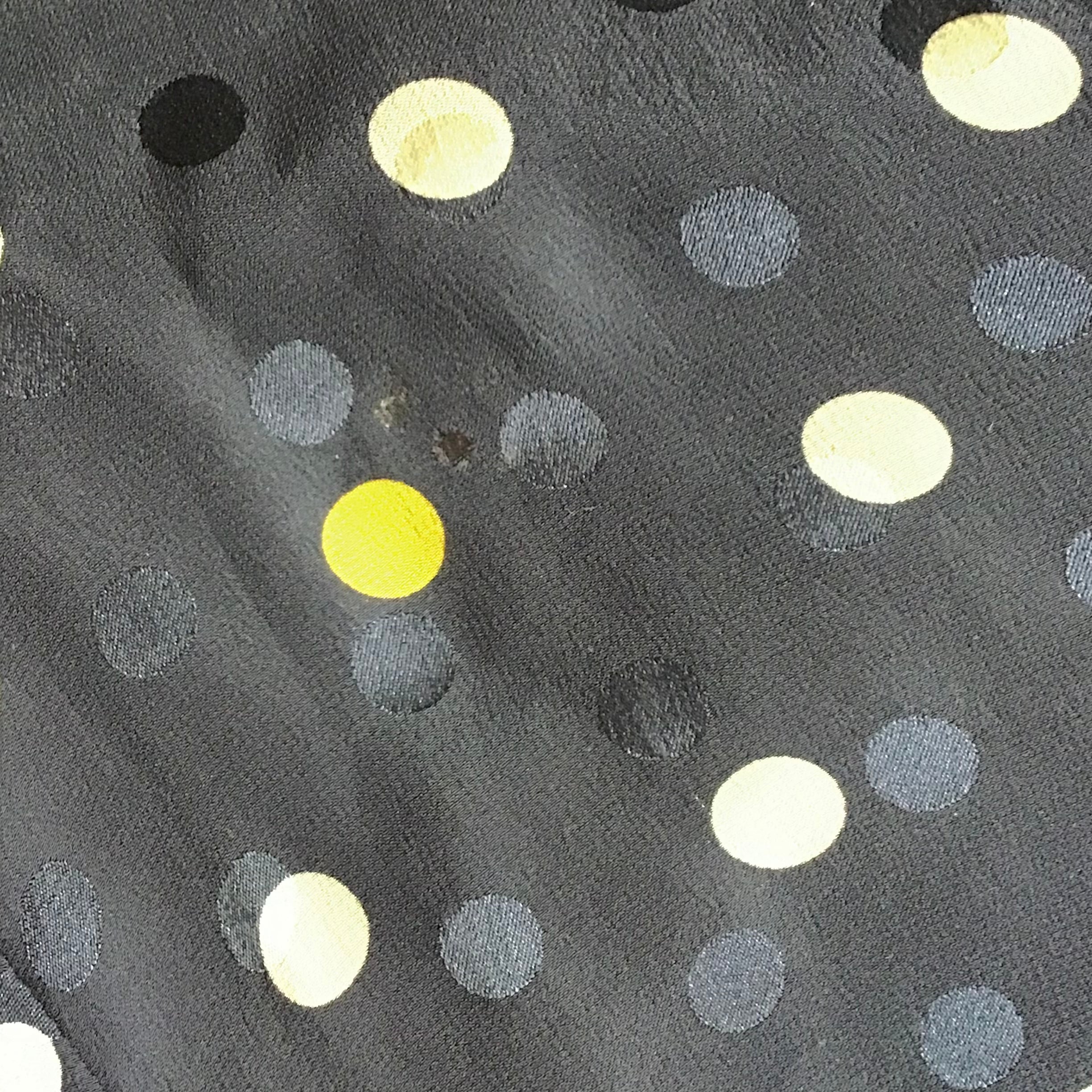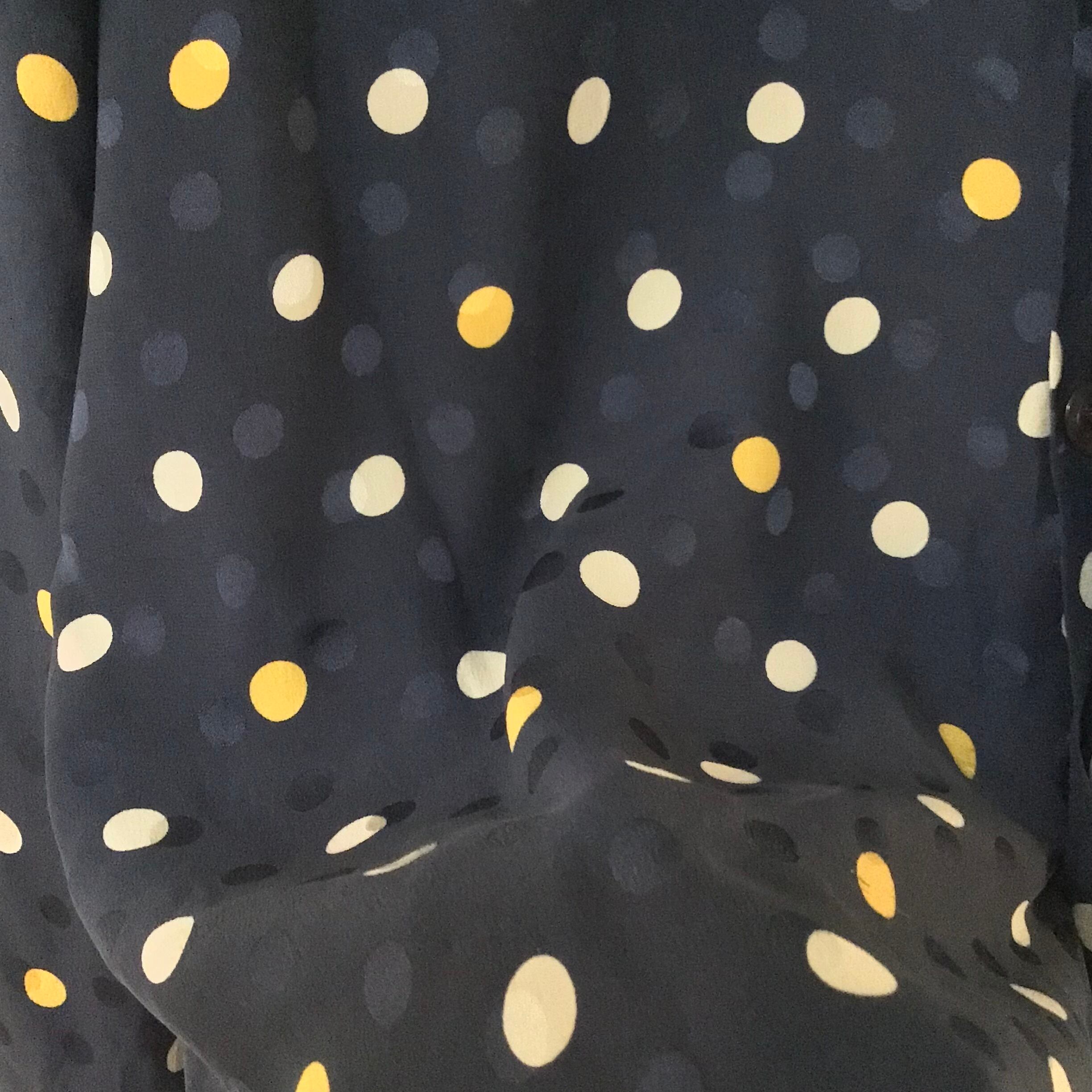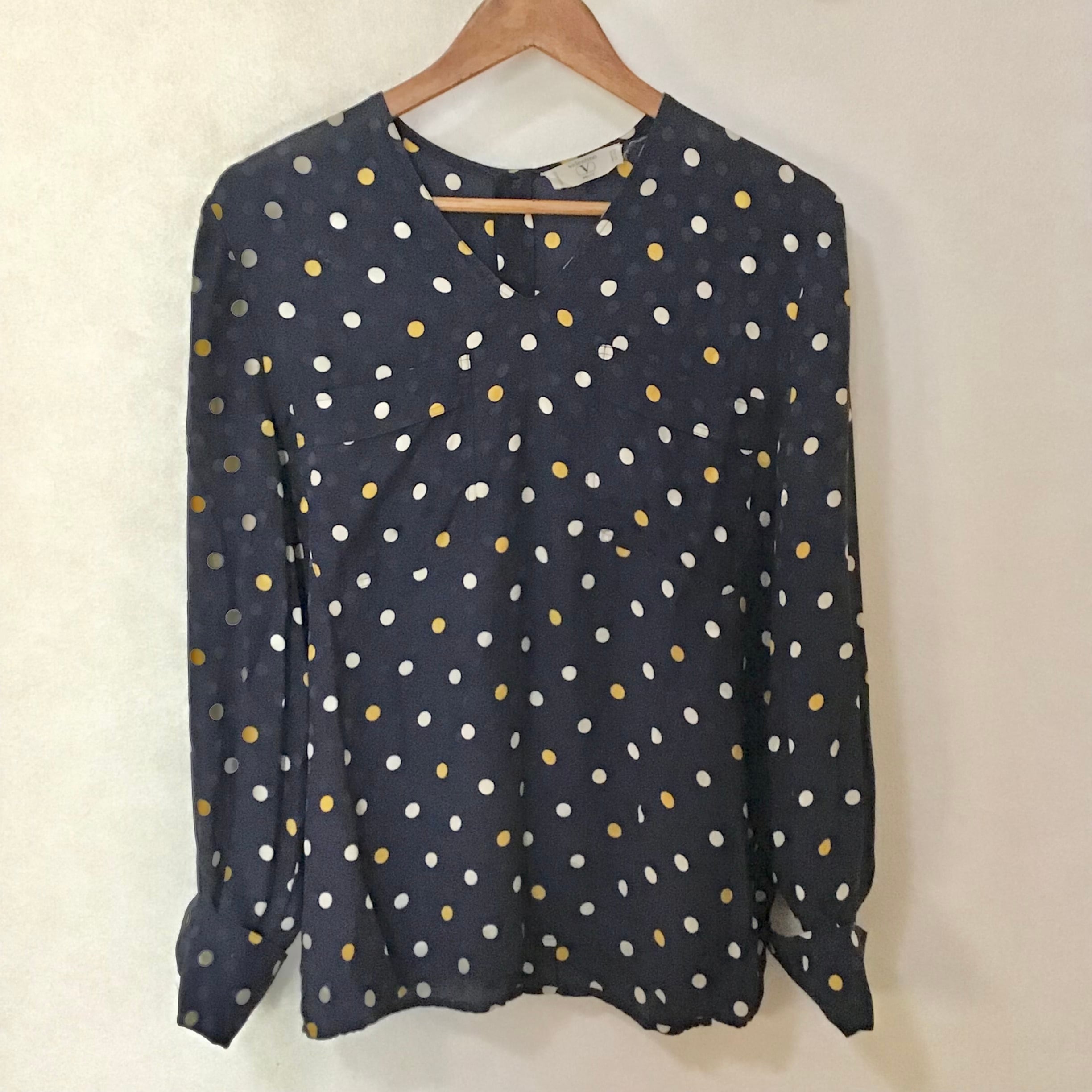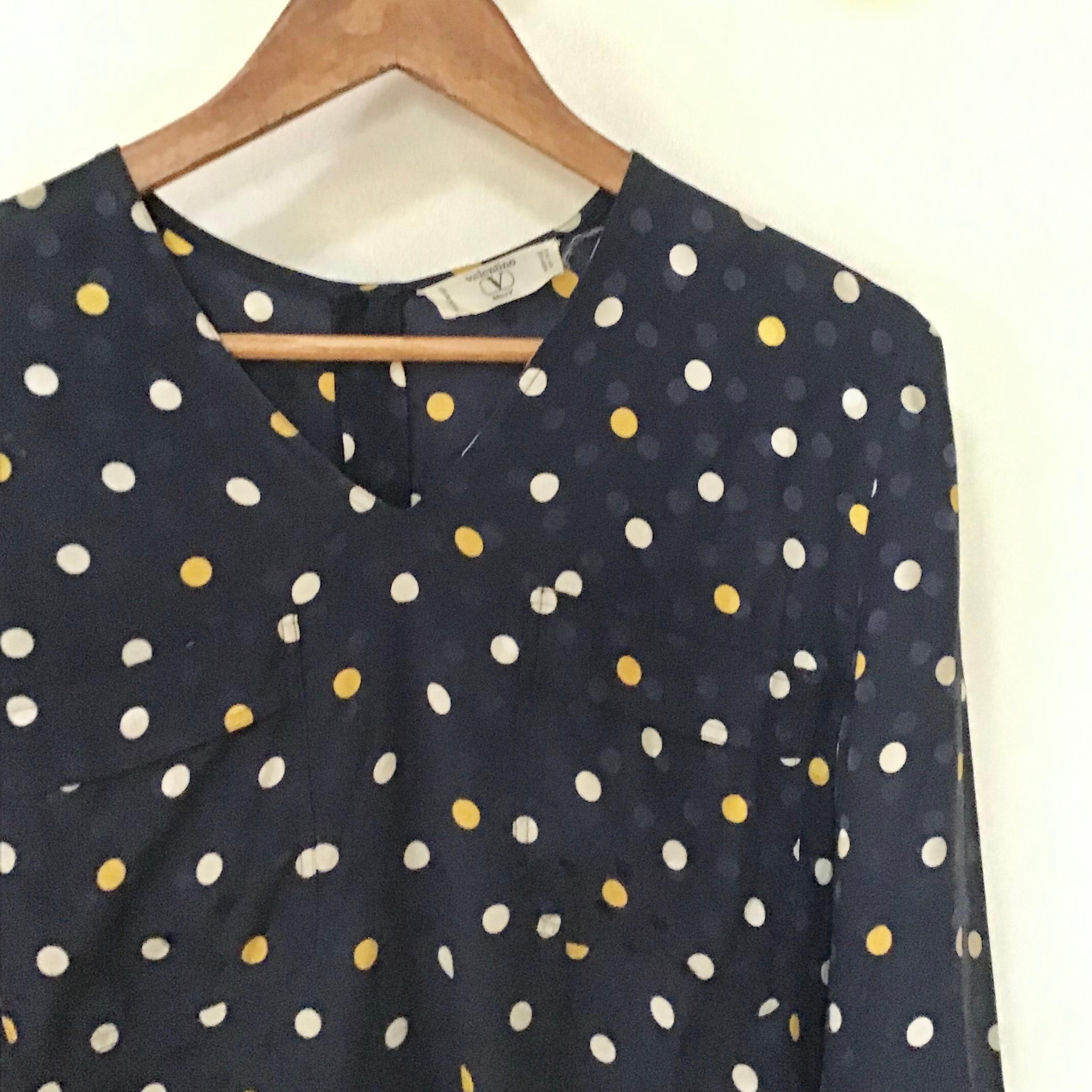 1980年代、バレンティノ ミスVのシルクブラウス。濃いめのネイビーにクリームとイエロー、光の加減で浮き上がる少し艶のあるネイビーのドット柄が入っています。フロントはVネック、両胸にポケット付き、バックボタンでスッキリしたデザインです♡袖口はスナップボタン2個で留まっていますが、カフスを付けることもできます◎ヴィンテージデニムにサラッと合わせたい上品なお品です!