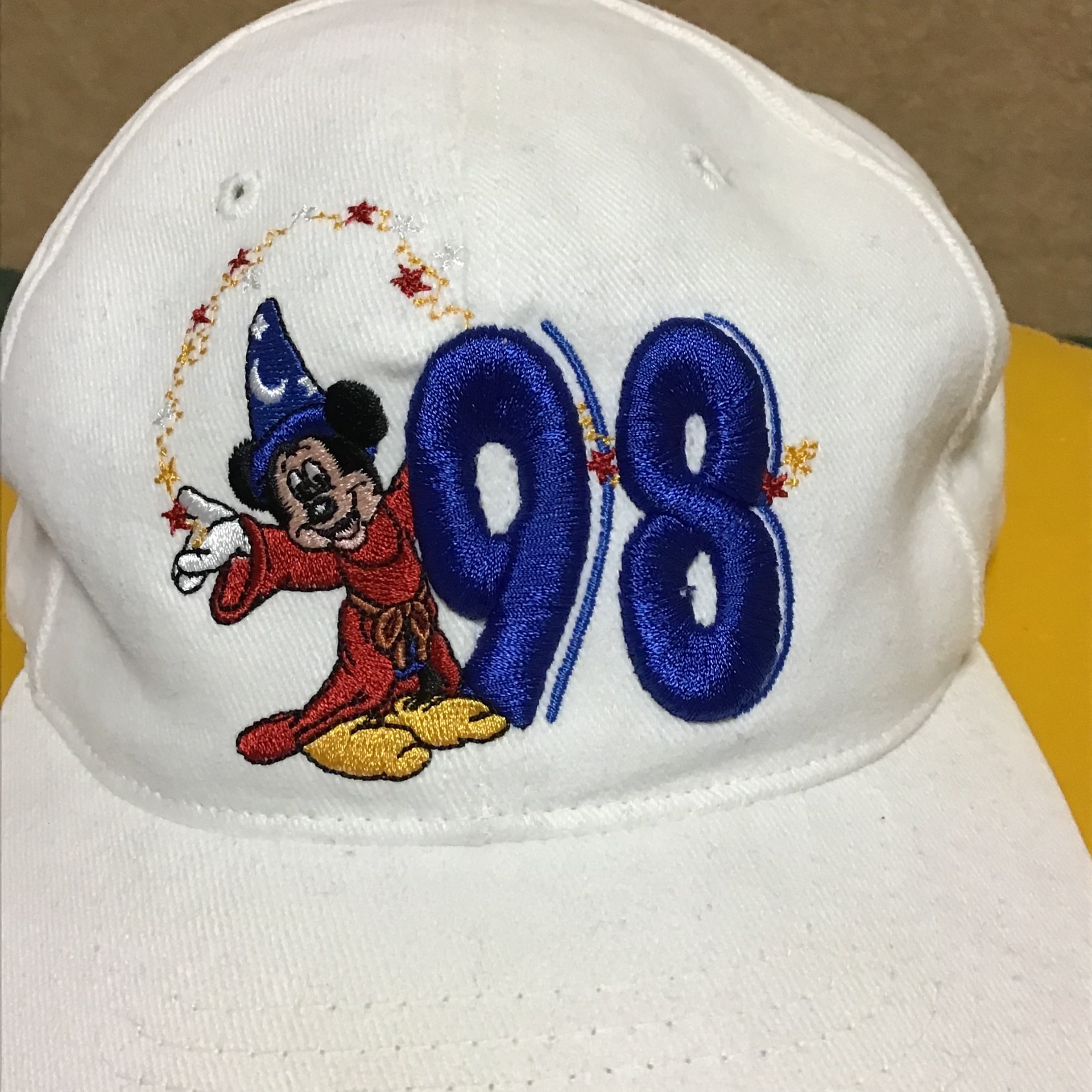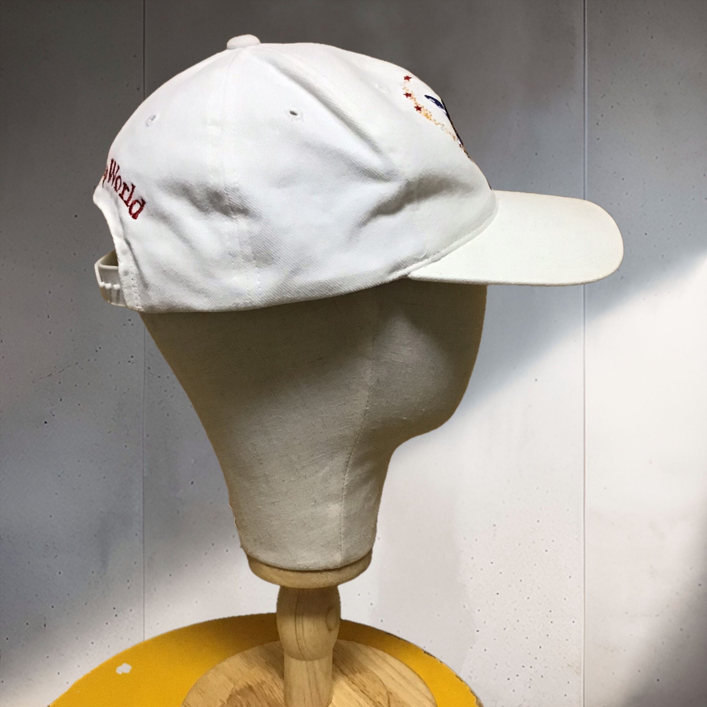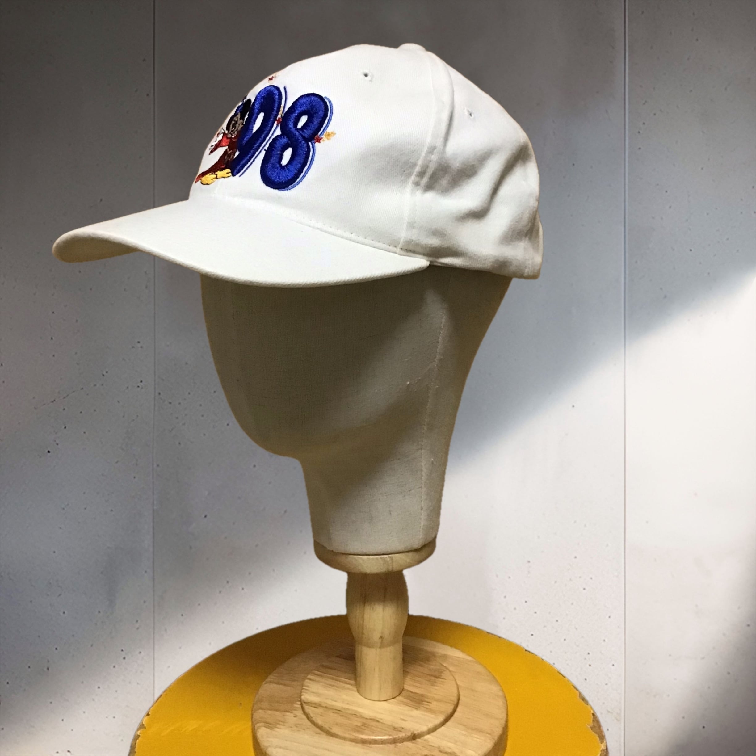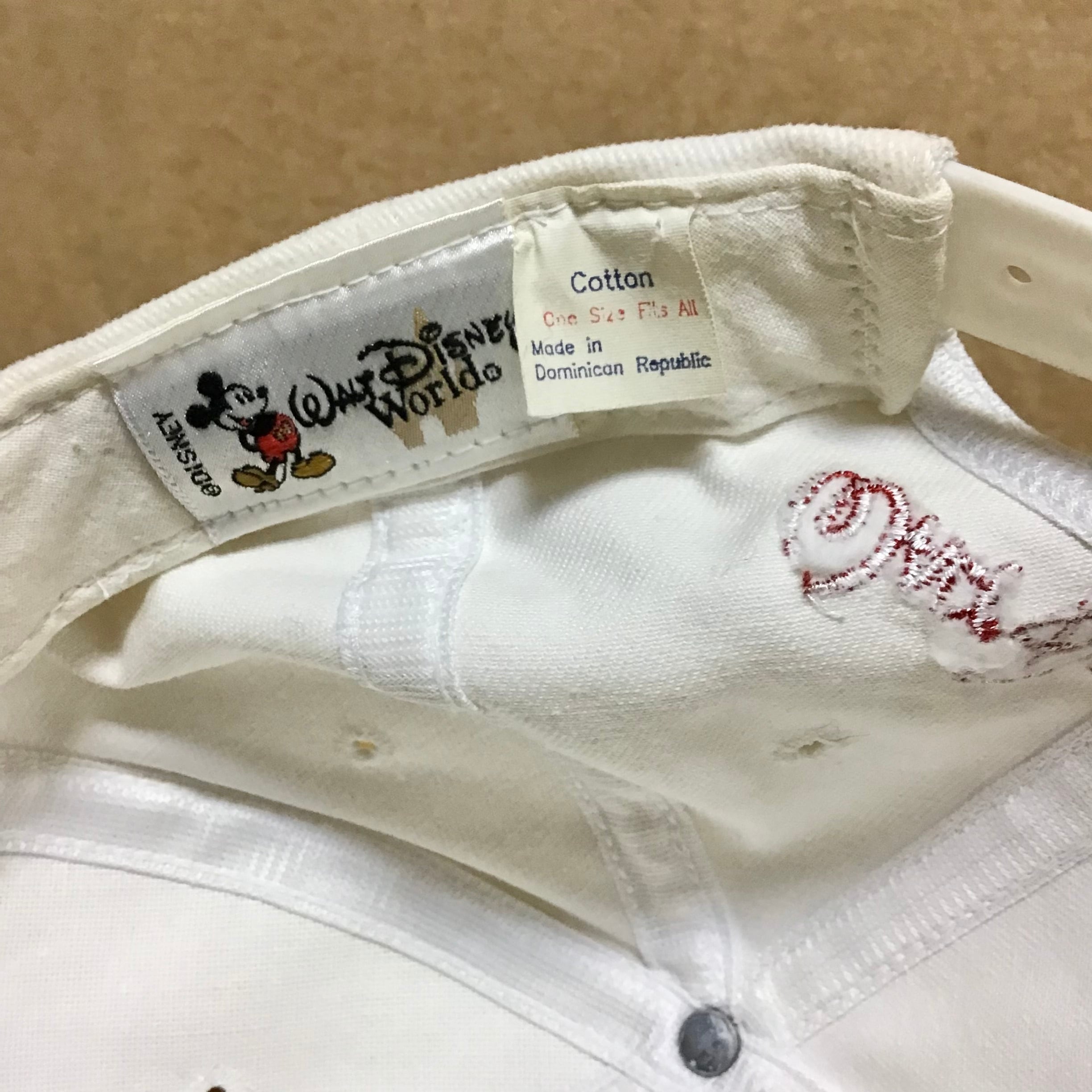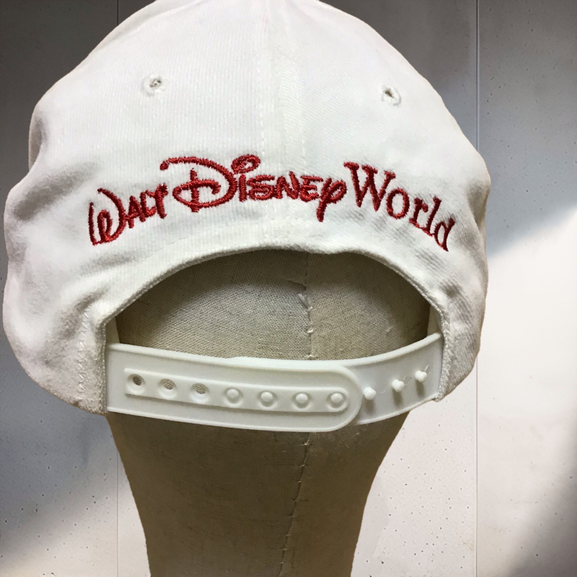 1998年のディズニーワールドキャップ。ファンタジアなミッキーが可愛いです♡白地に刺繍が映え、後ろの赤いロゴも良いです◎日差しの強いこれからの季節に活躍してくれそうです!