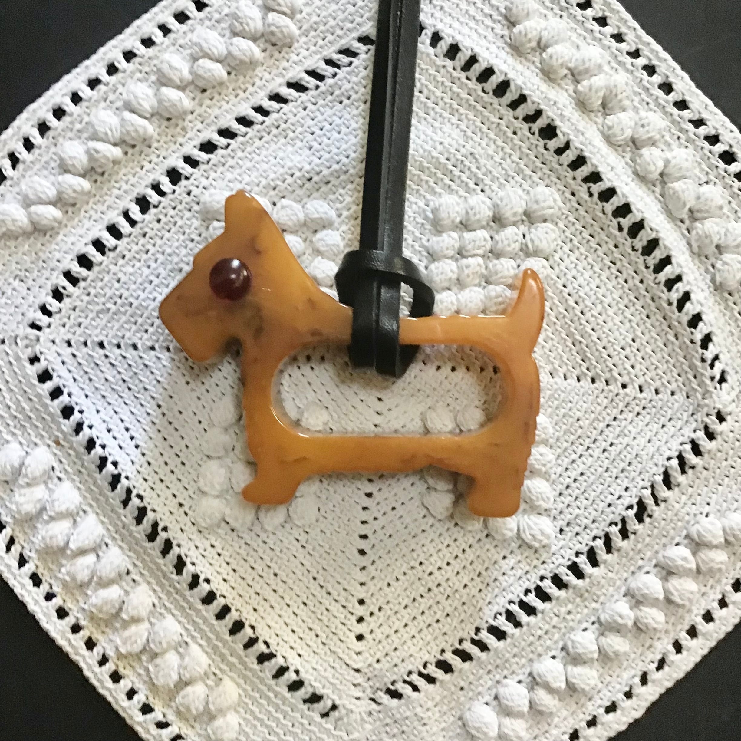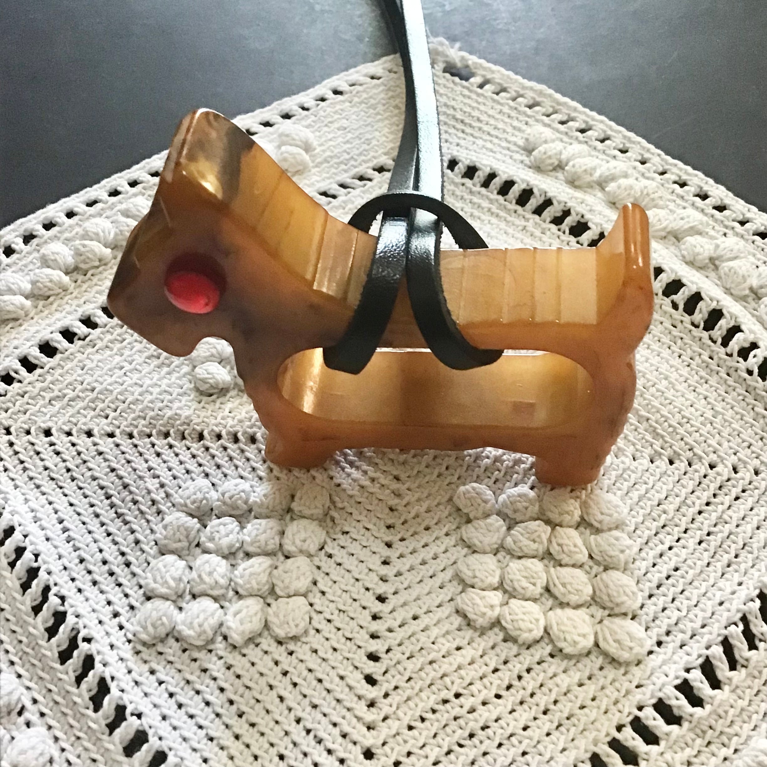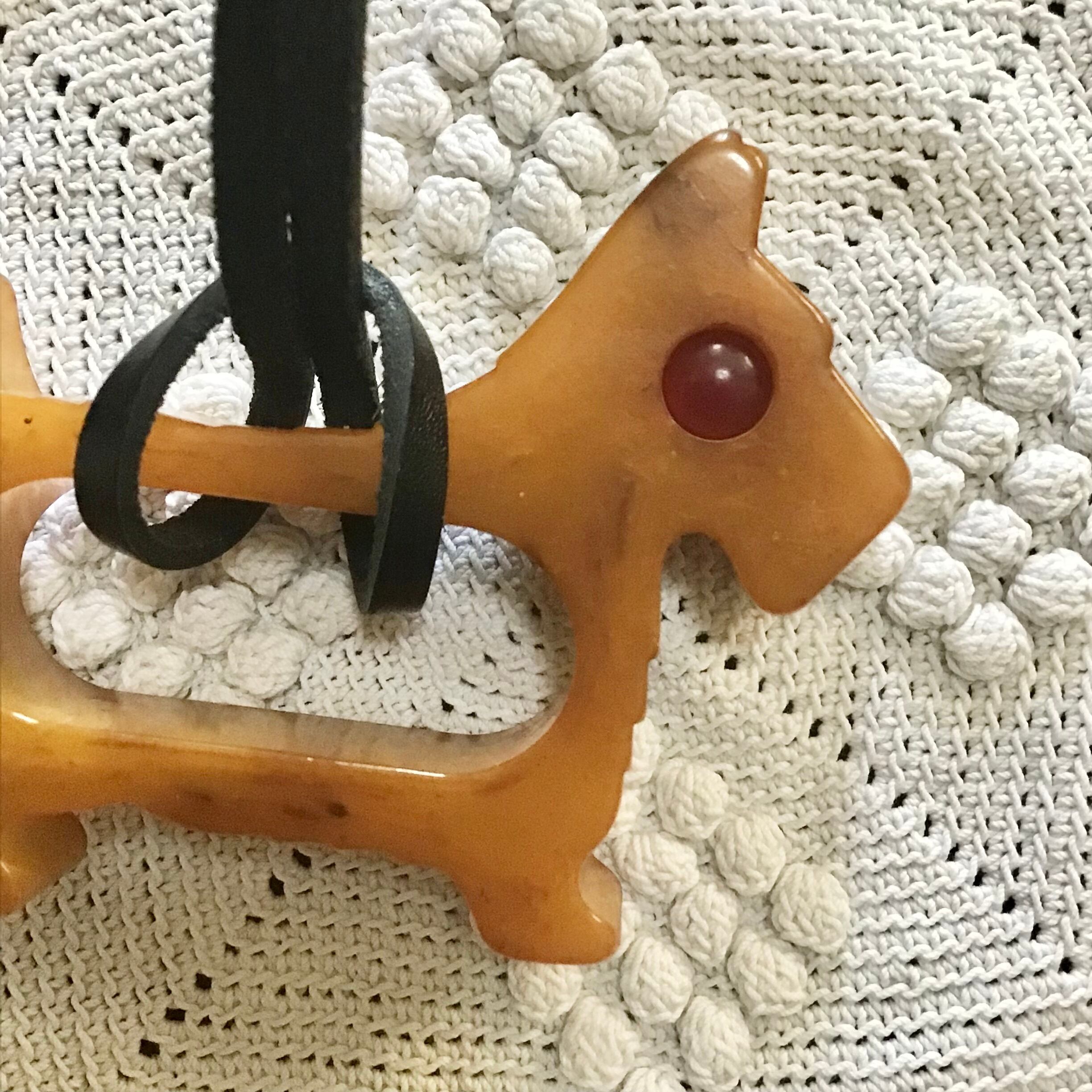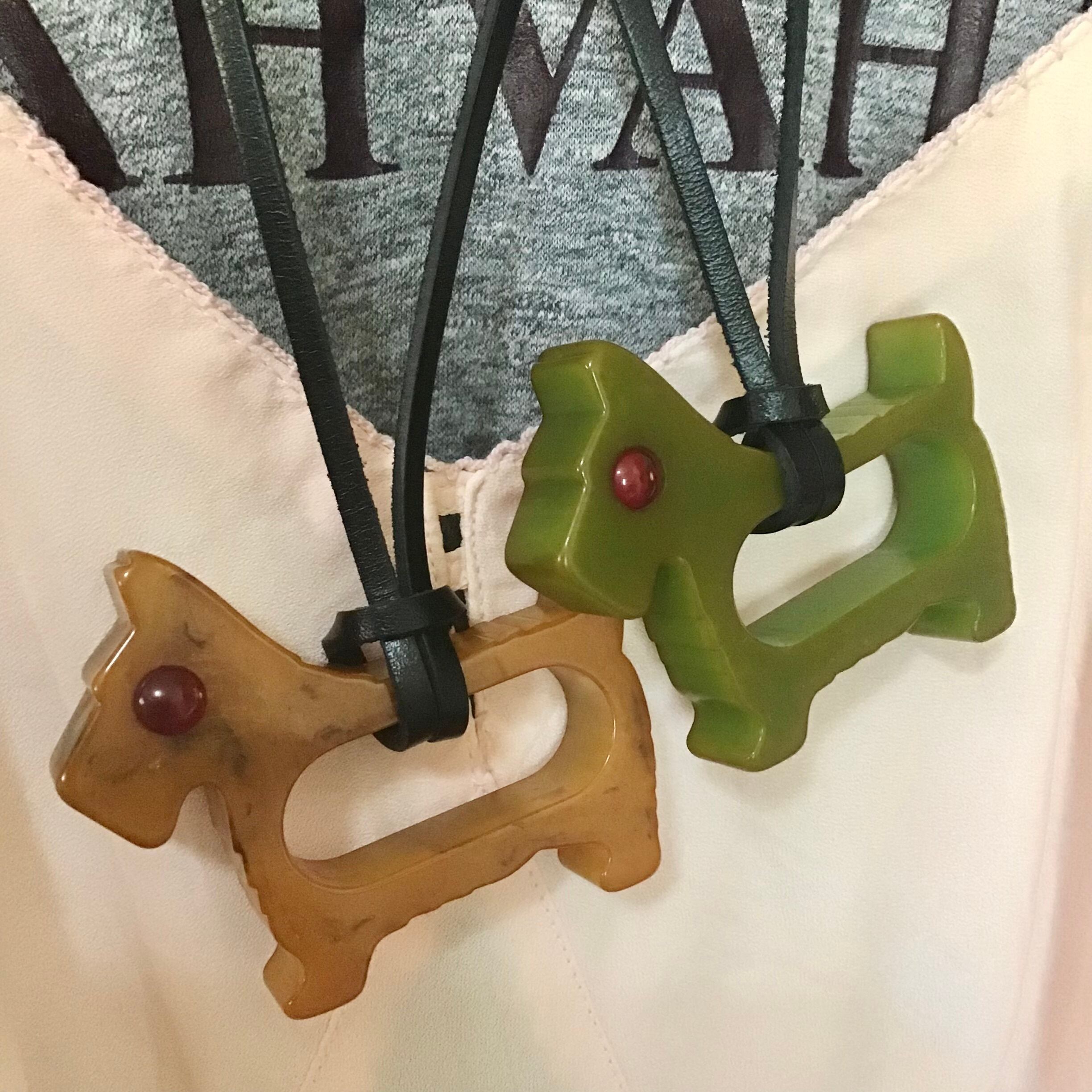 1940年代のベークライト製、スコティッシュテリア型のナプキンリングに革紐を付けてネックレスにしました♡こちらはマーブル模様にクリアな赤い瞳がチャームポイント◎ネックレスにするのはもちろん、チャームとしてバッグに付けたり、写真のように縦向きにしても可愛いです!