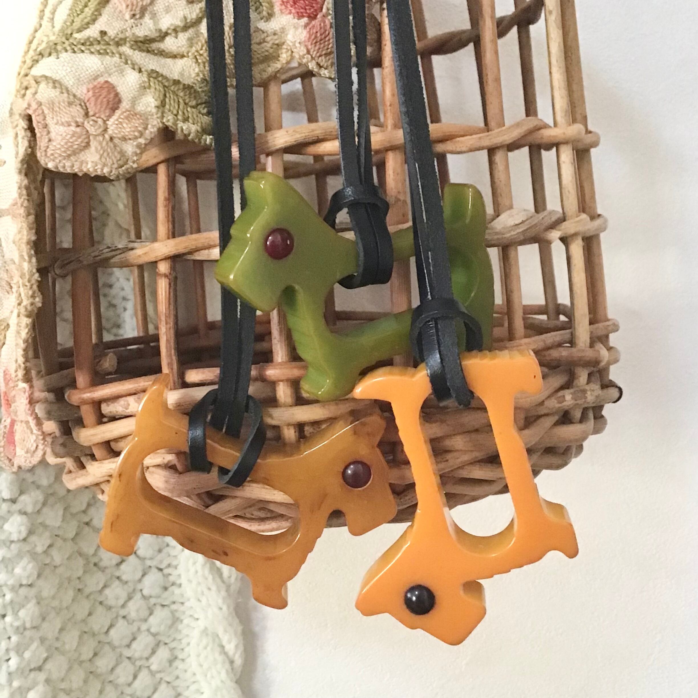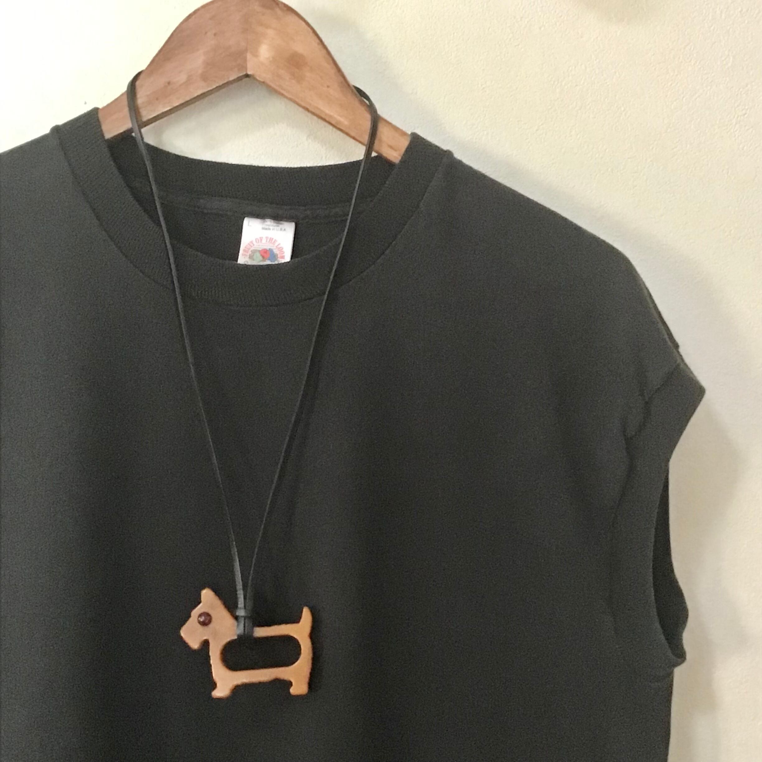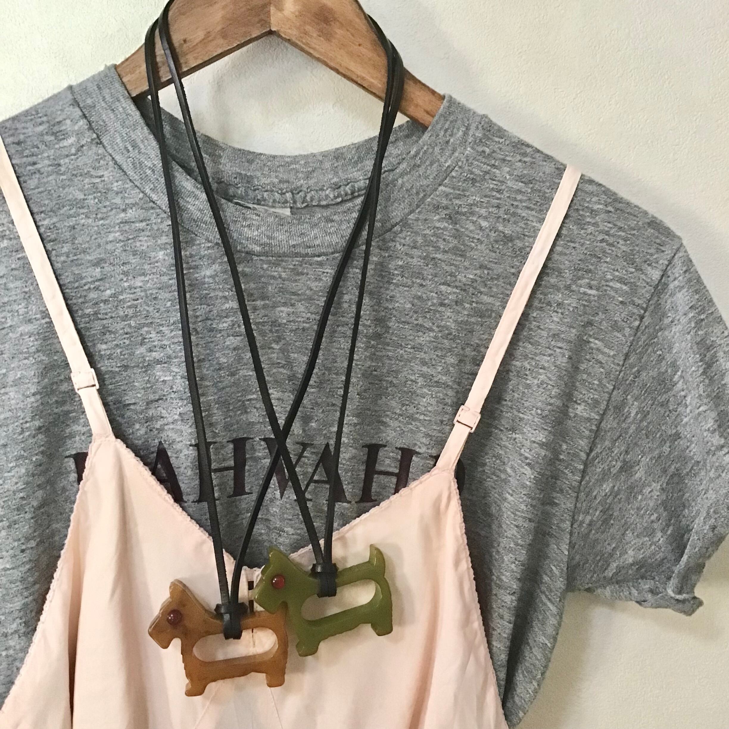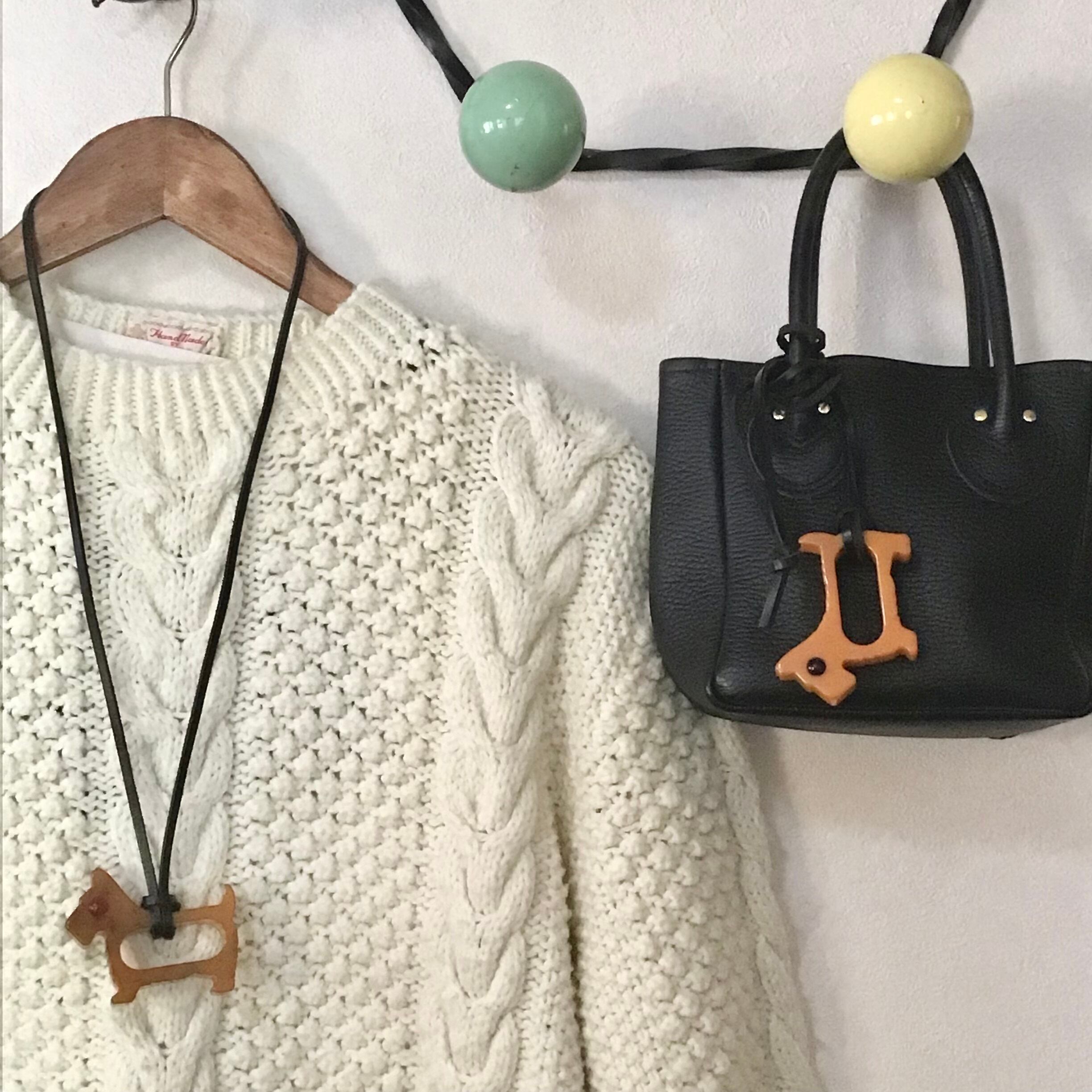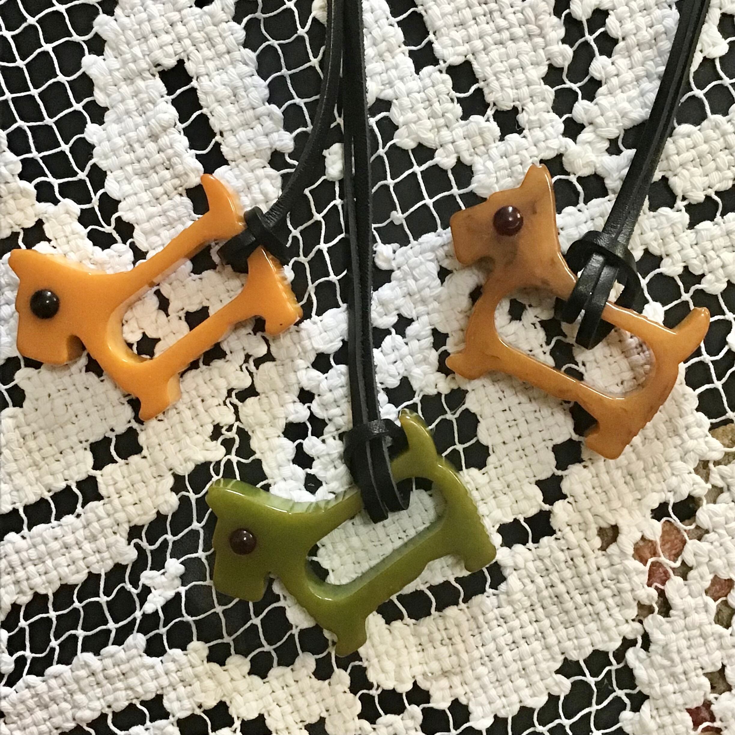 1940年代のベークライト製、スコティッシュテリア型のナプキンリングに革紐を付けてネックレスにしました♡こちらはマーブル模様にクリアな赤い瞳がチャームポイント◎ネックレスにするのはもちろん、チャームとしてバッグに付けたり、写真のように縦向きにしても可愛いです!