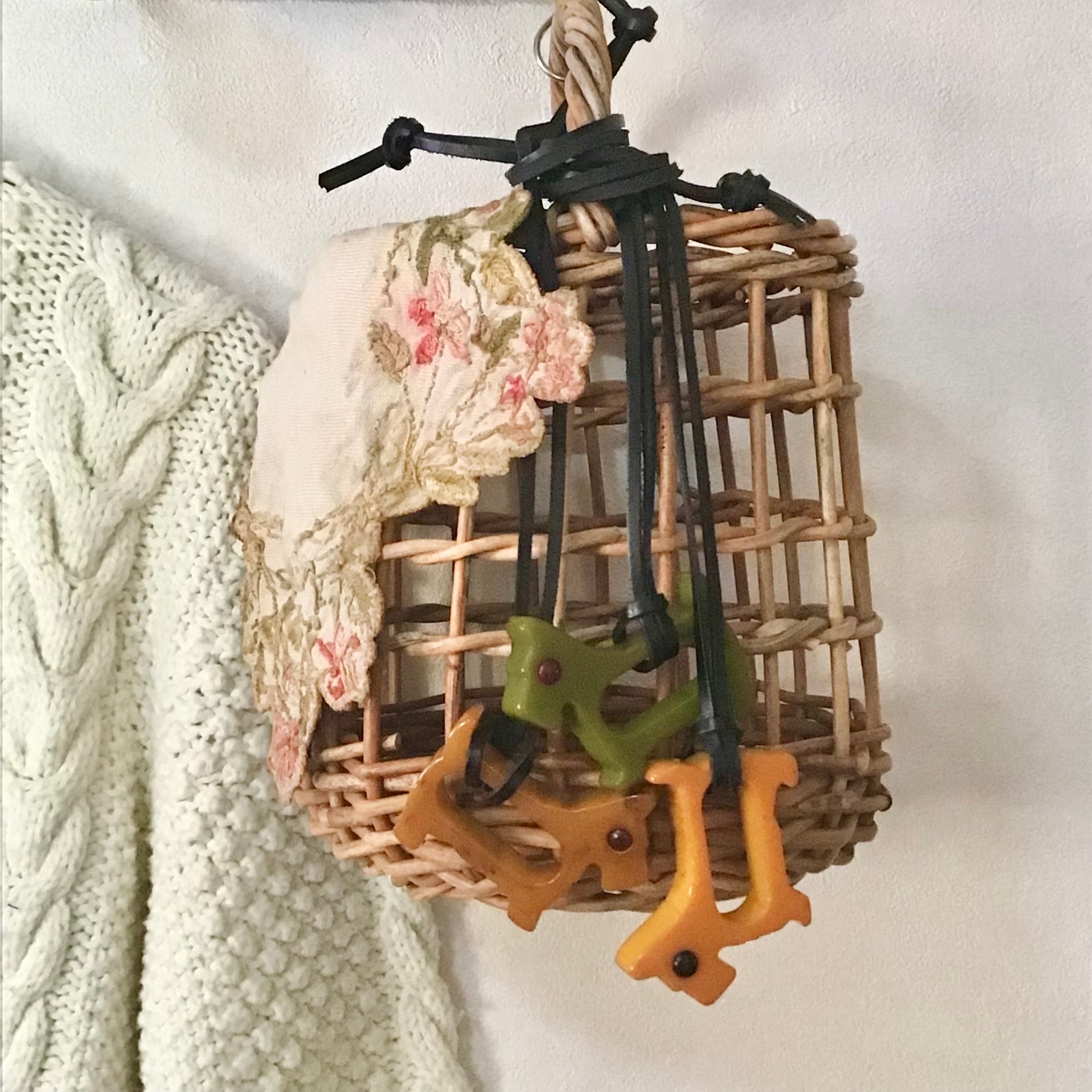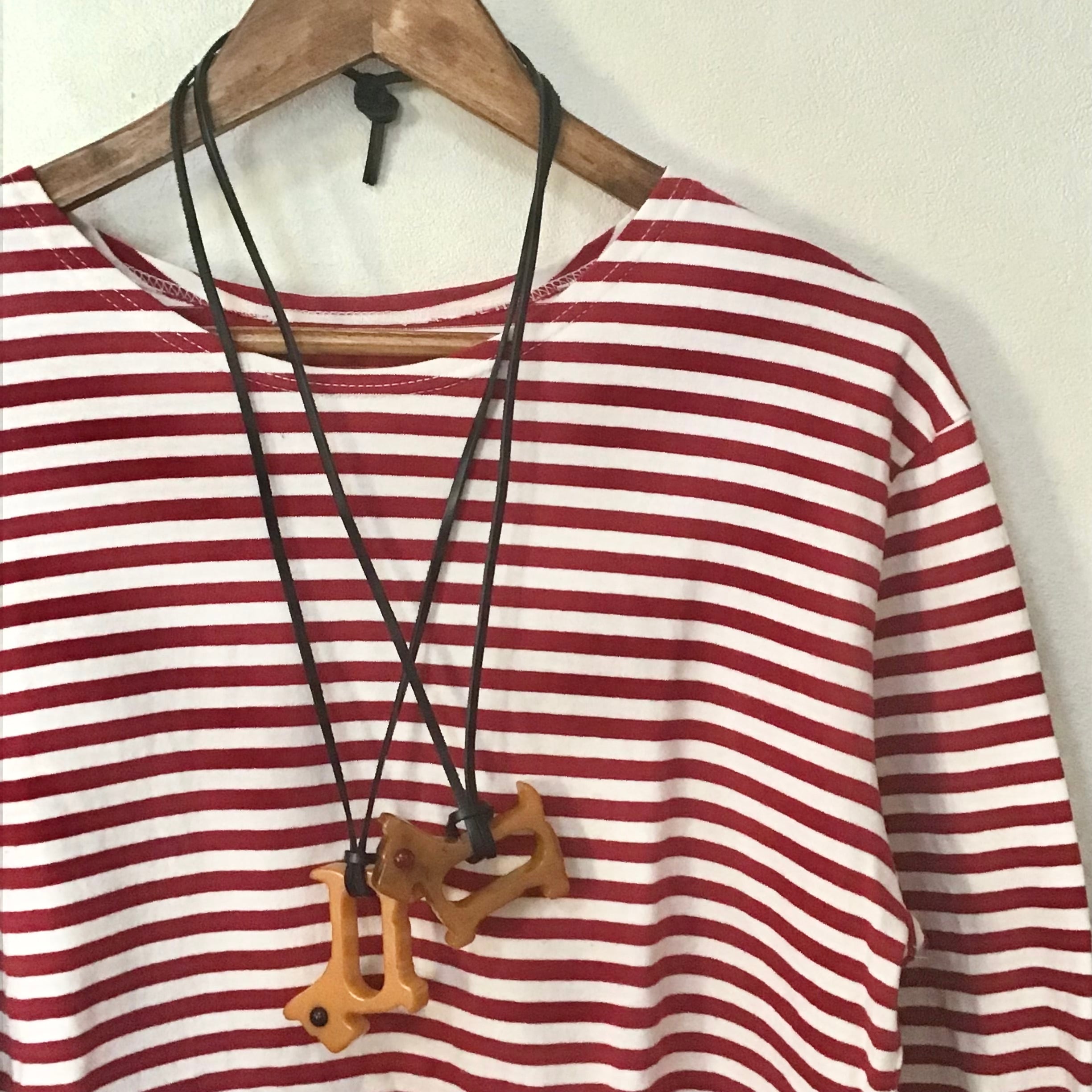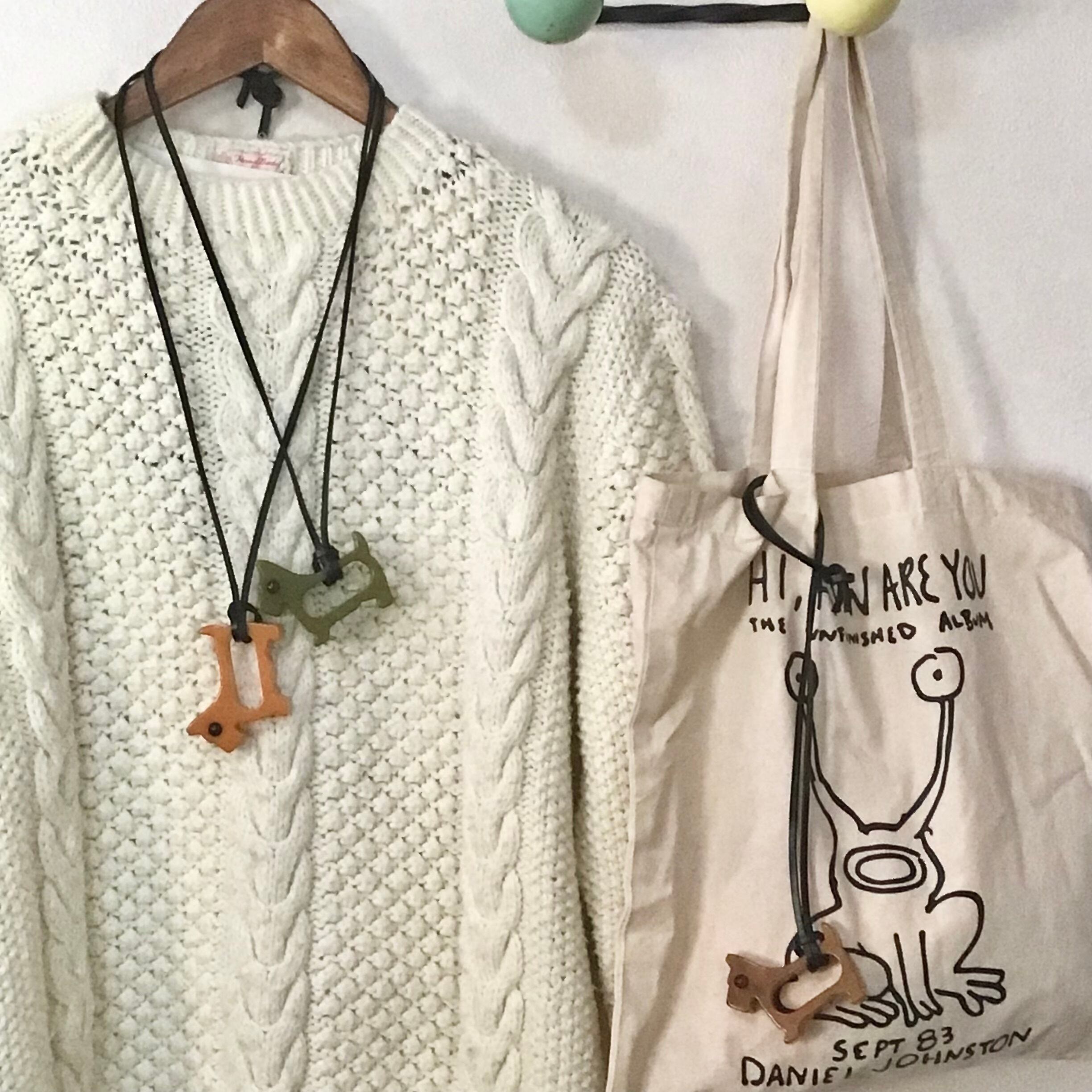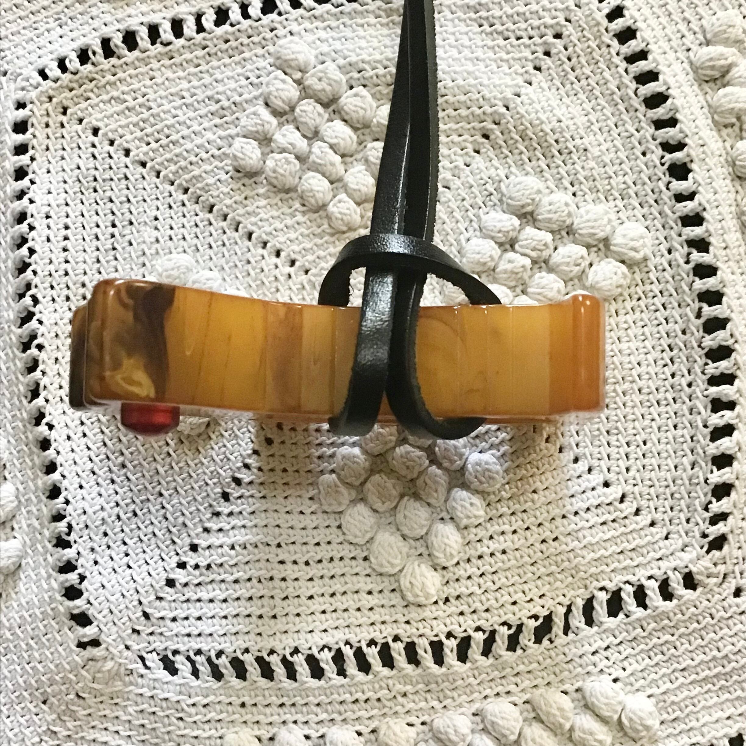 1940年代のベークライト製、スコティッシュテリア型のナプキンリングに革紐を付けてネックレスにしました♡こちらはマーブル模様にクリアな赤い瞳がチャームポイント◎ネックレスにするのはもちろん、チャームとしてバッグに付けたり、写真のように縦向きにしても可愛いです!