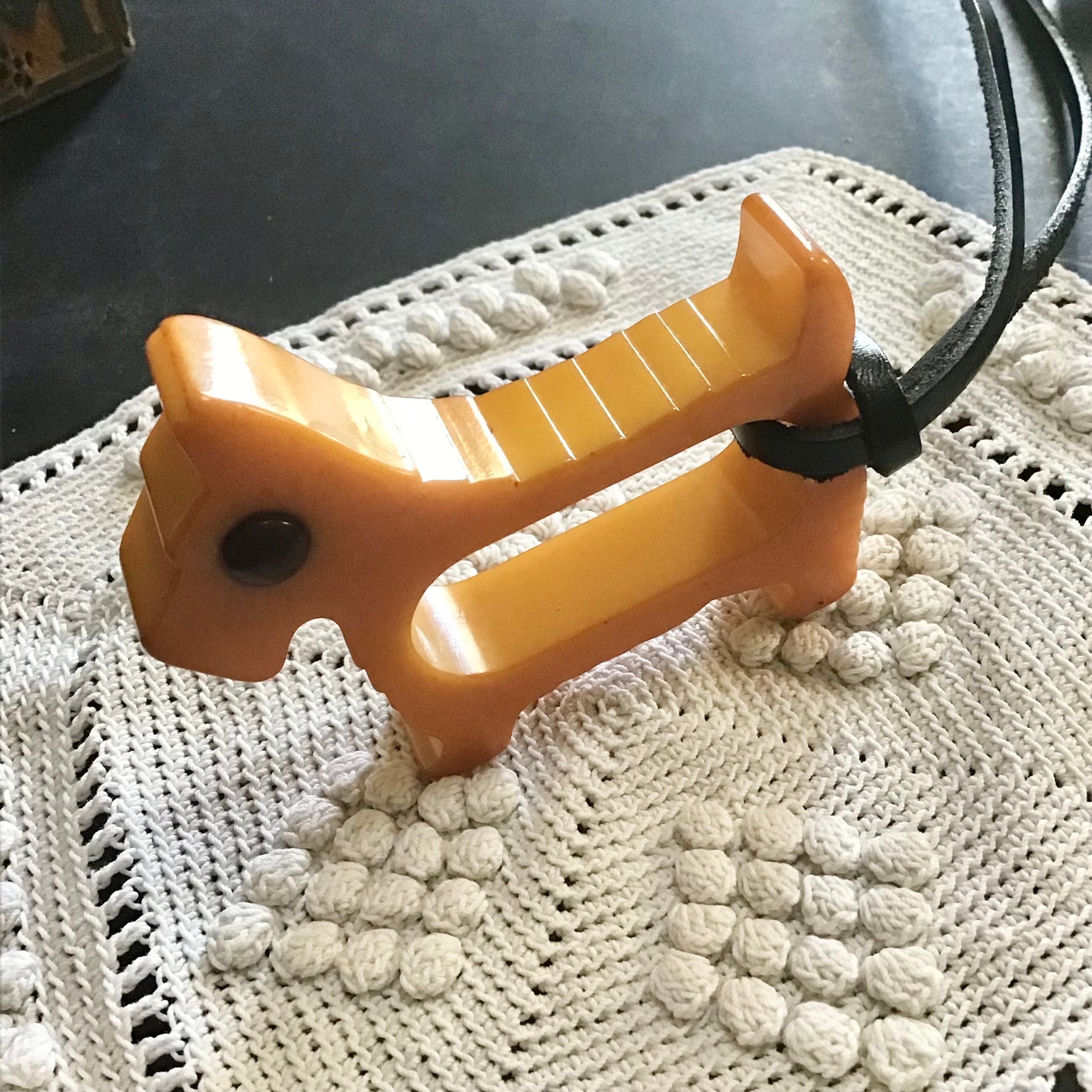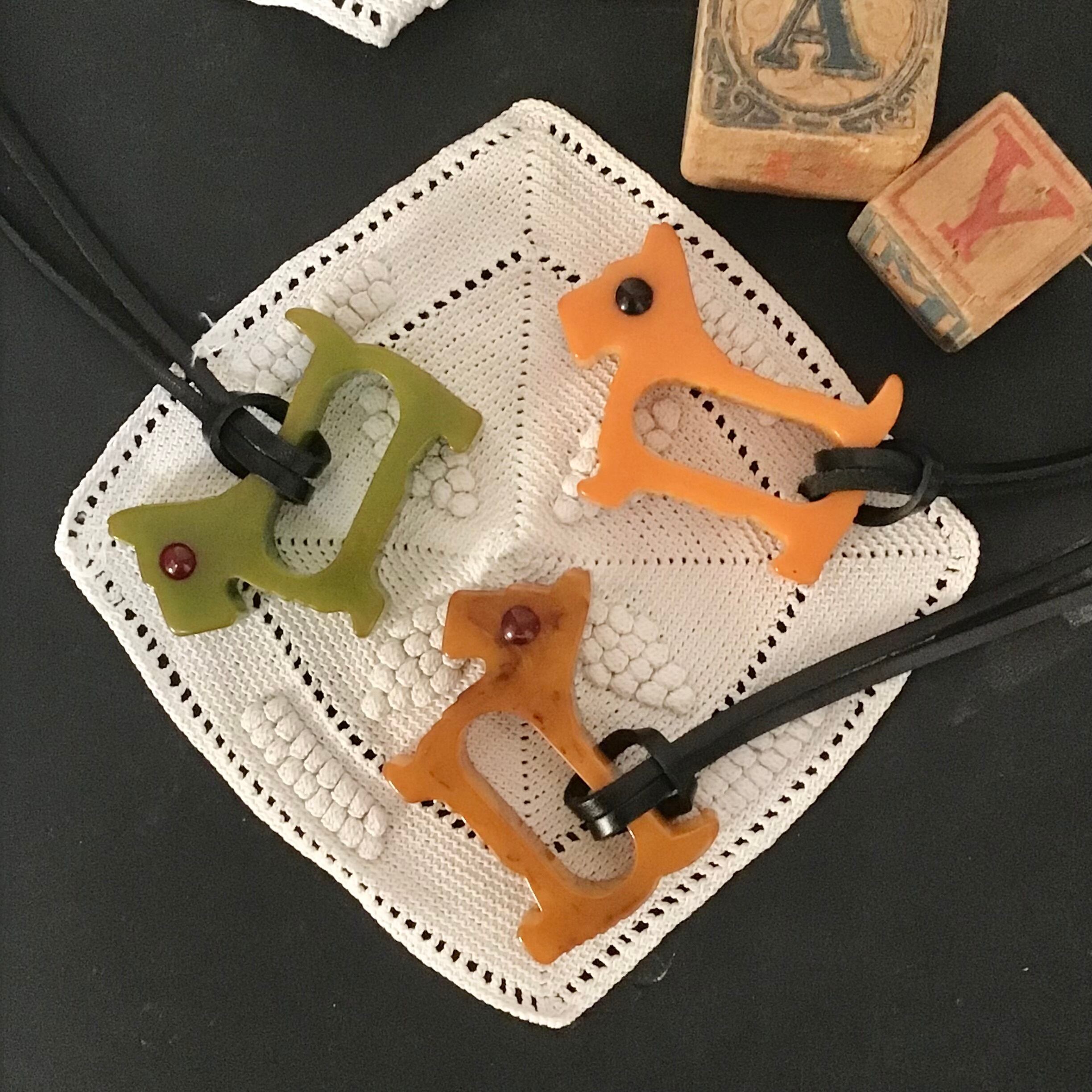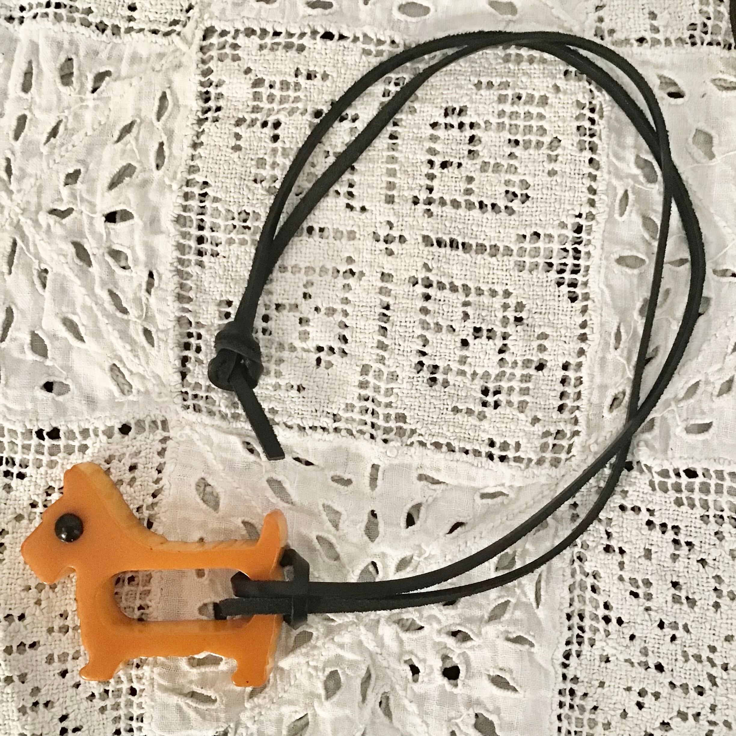 1940年代のベークライト製、スコティッシュテリア型のナプキンリングに革紐を付けてネックレスにしました♡こちらはこっくりとしたバタースコッチカラーに黒い瞳がキリッとしたデザイン◎ネックレスにするのはもちろん、チャームとしてバッグに付けたり、写真のように縦向きにしても可愛いです!