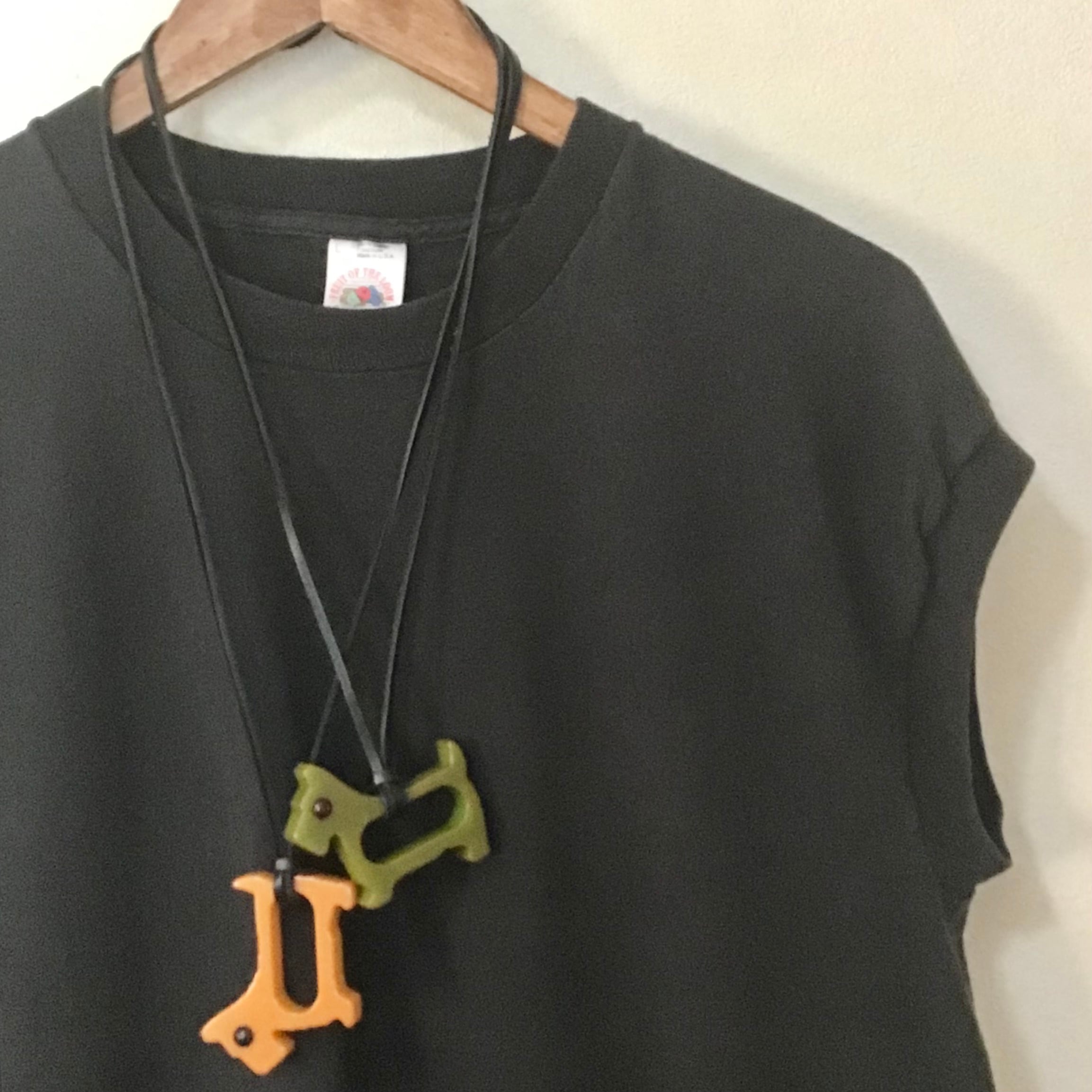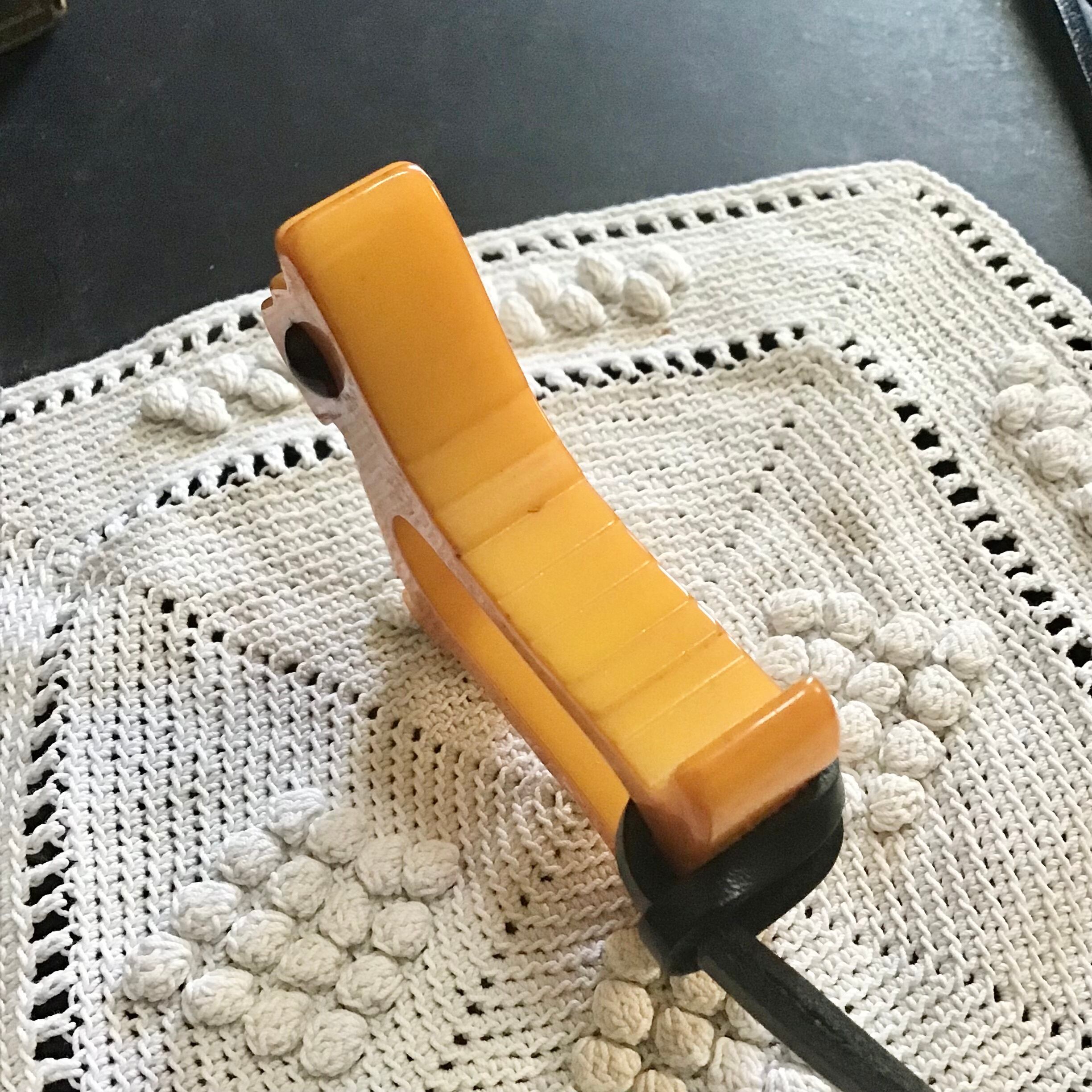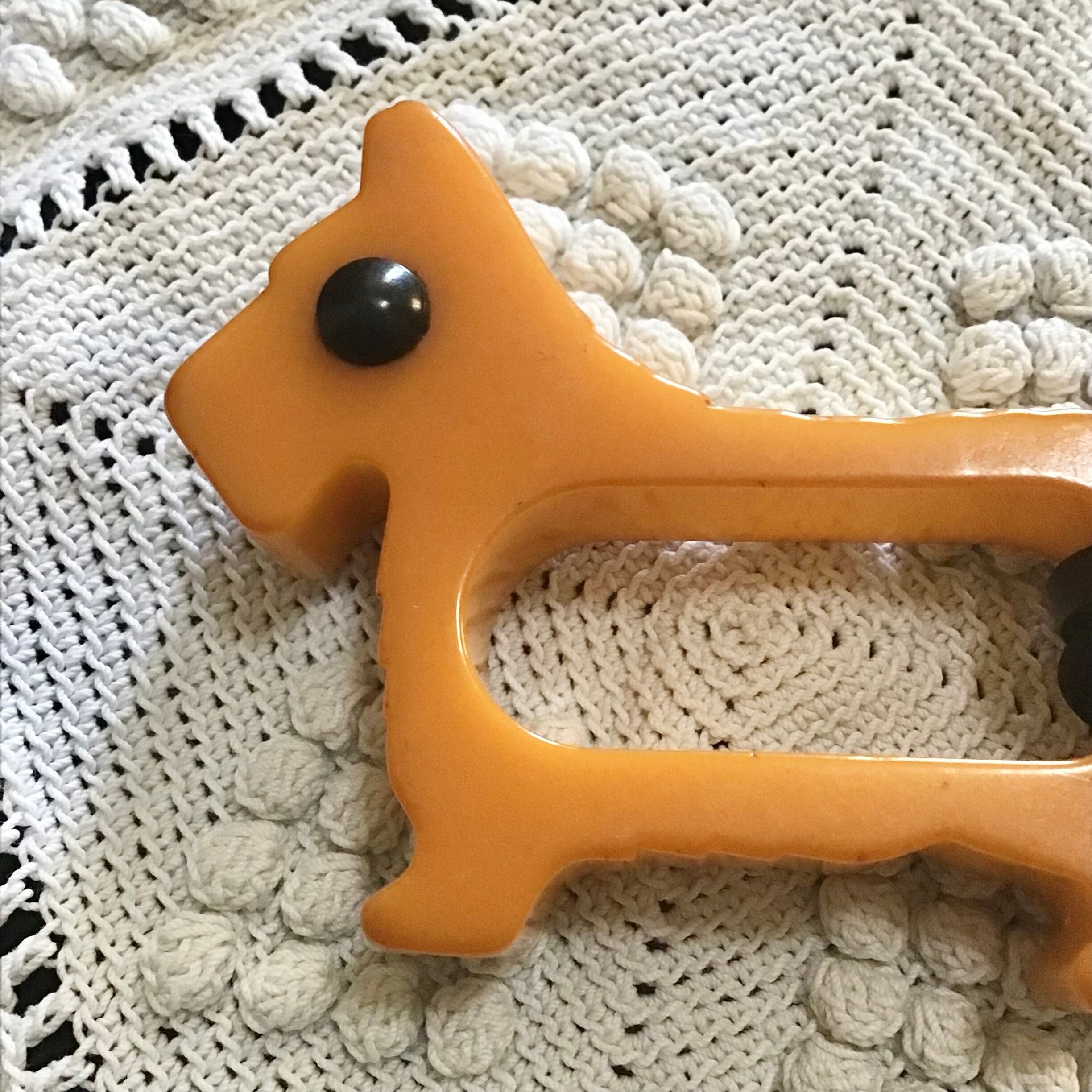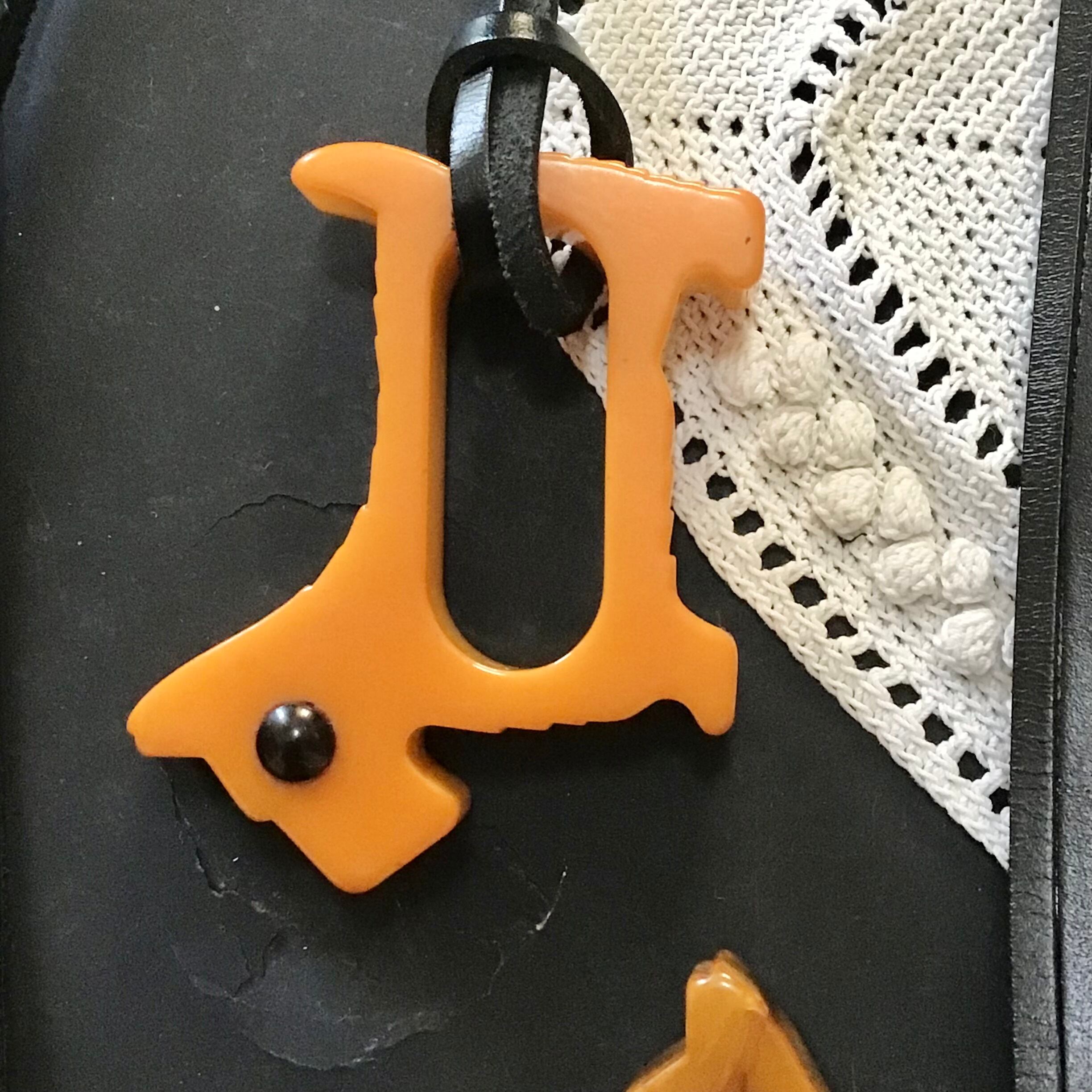 1940年代のベークライト製、スコティッシュテリア型のナプキンリングに革紐を付けてネックレスにしました♡こちらはこっくりとしたバタースコッチカラーに黒い瞳がキリッとしたデザイン◎ネックレスにするのはもちろん、チャームとしてバッグに付けたり、写真のように縦向きにしても可愛いです!