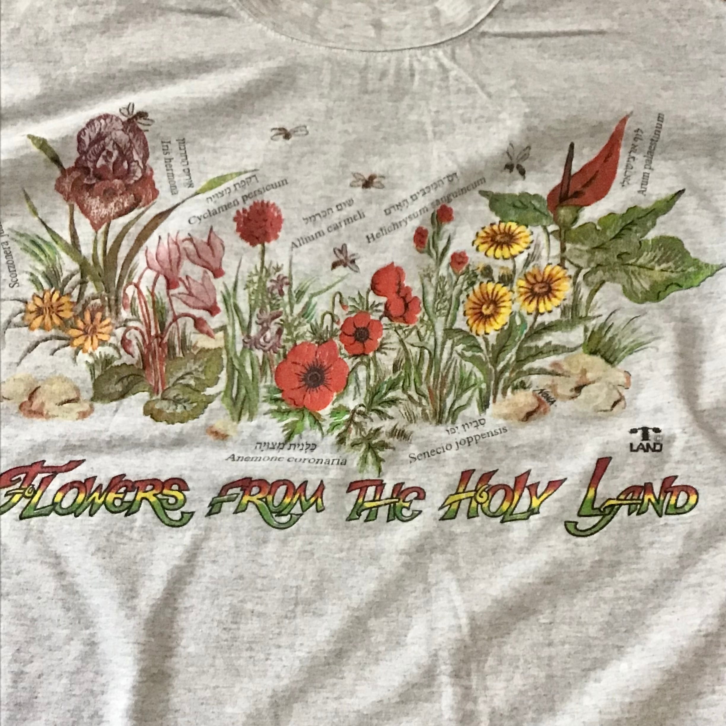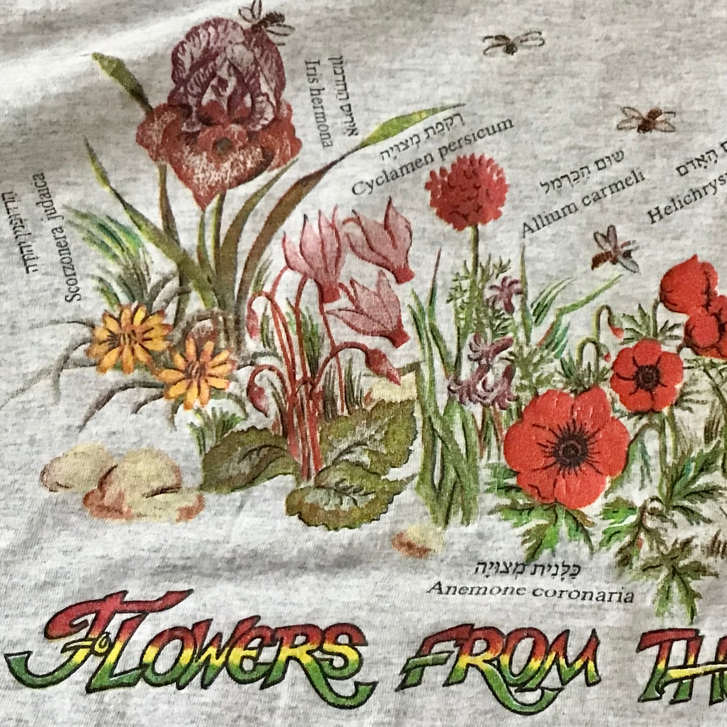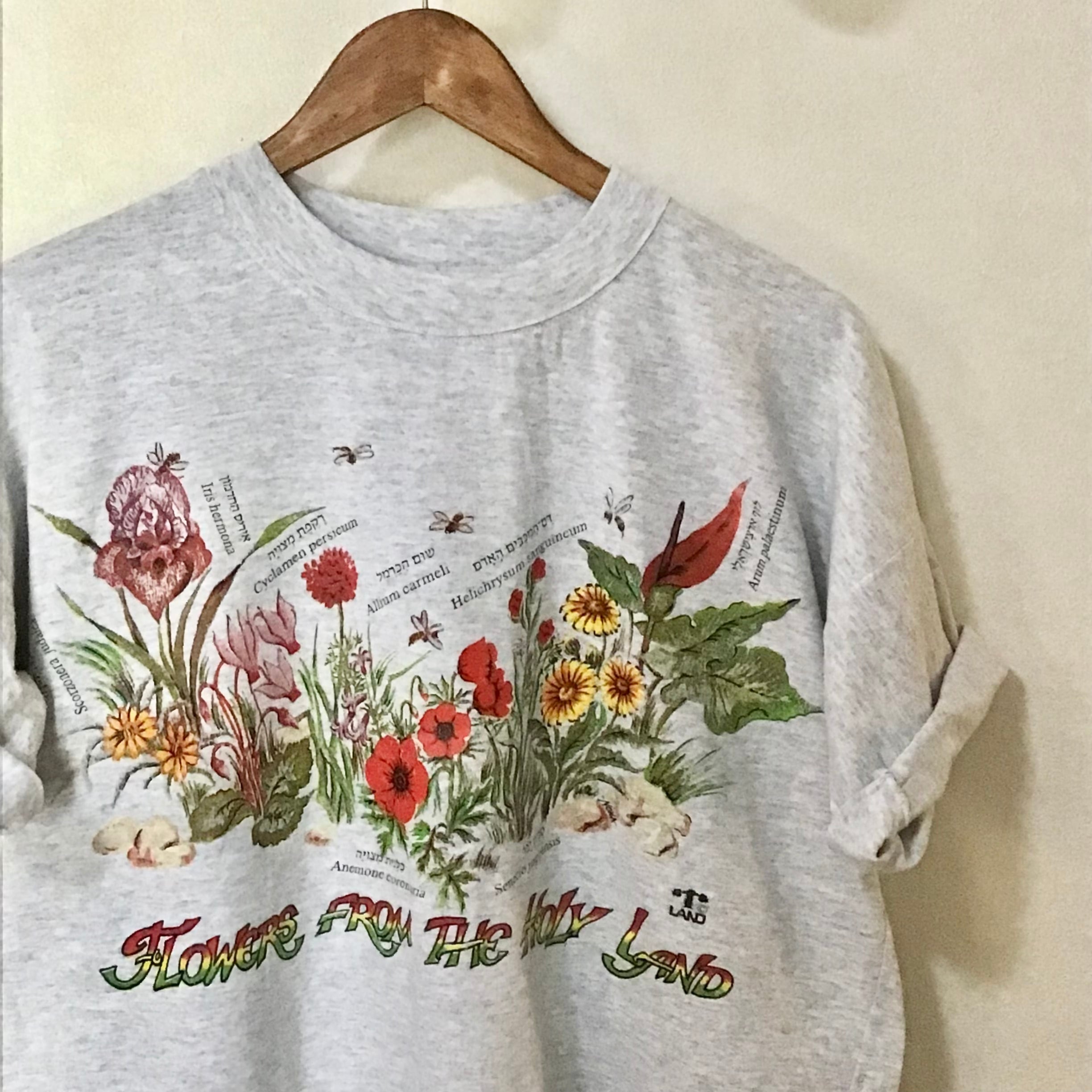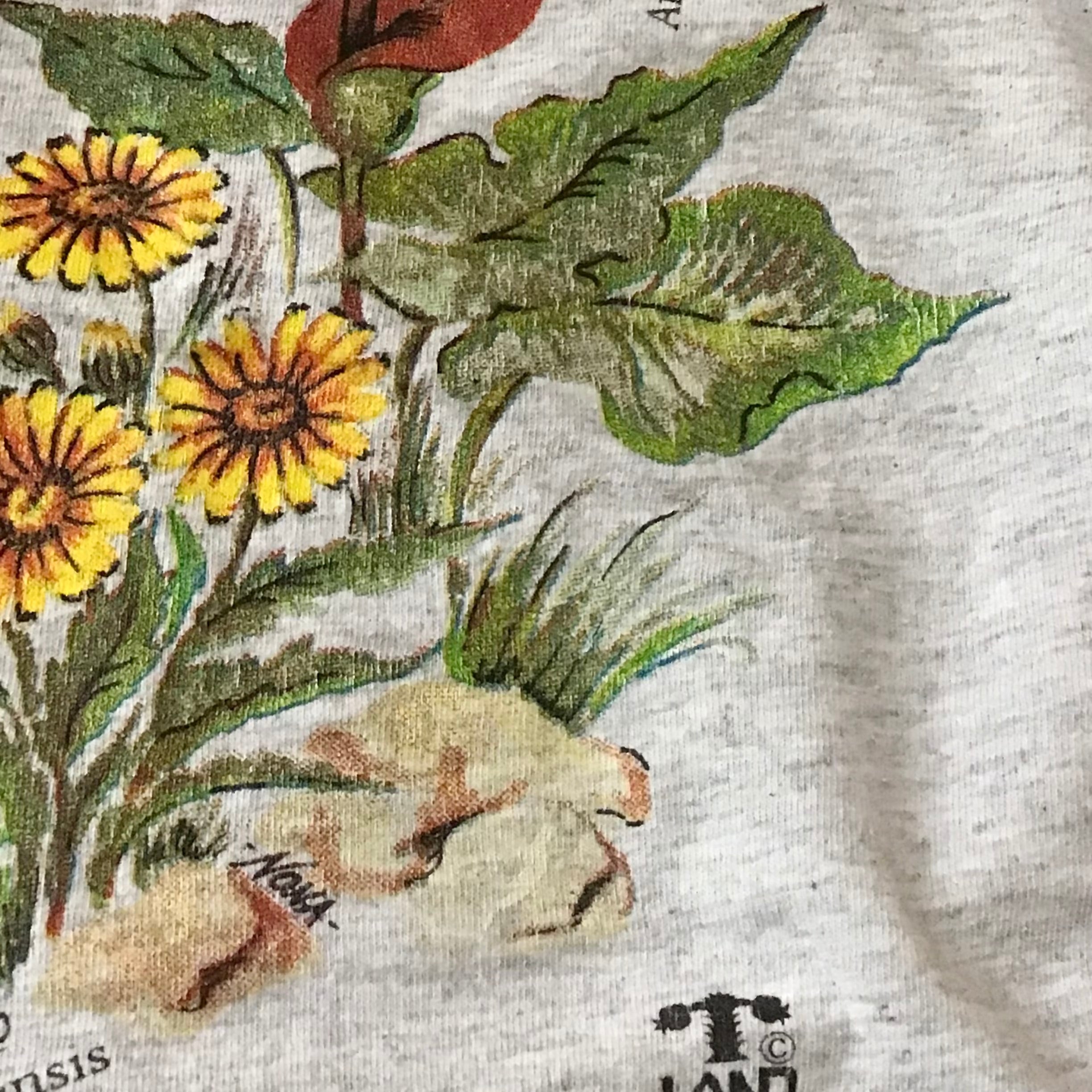 たくさんの花々とミツバチが可愛いプリントTシャツ。ゆるめのプリントですが色使いがきれいでコーディネートのポイントになりそうです♡肩が落ちる身幅のあるボックスシルエット、首のリブが太めなのも良いです◎