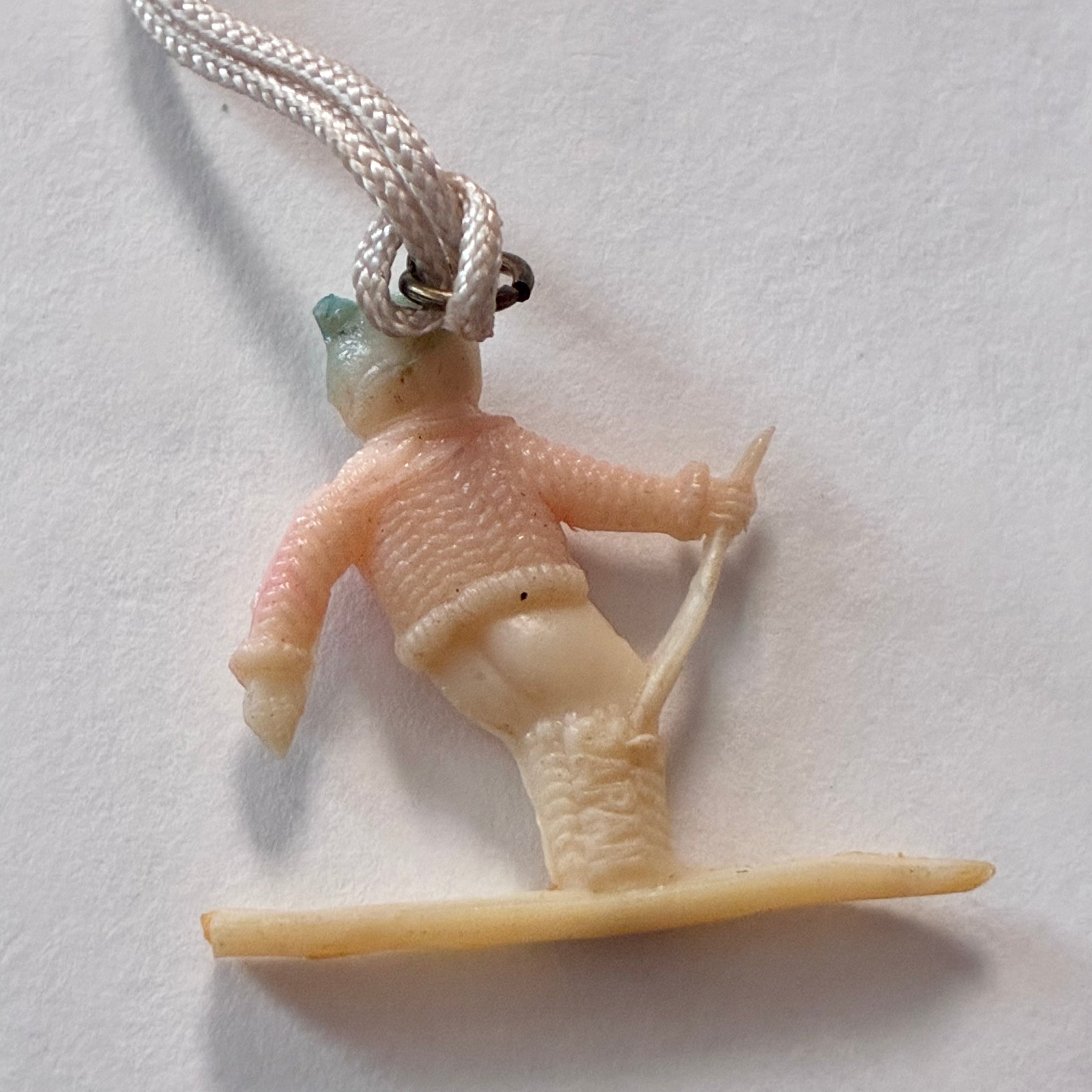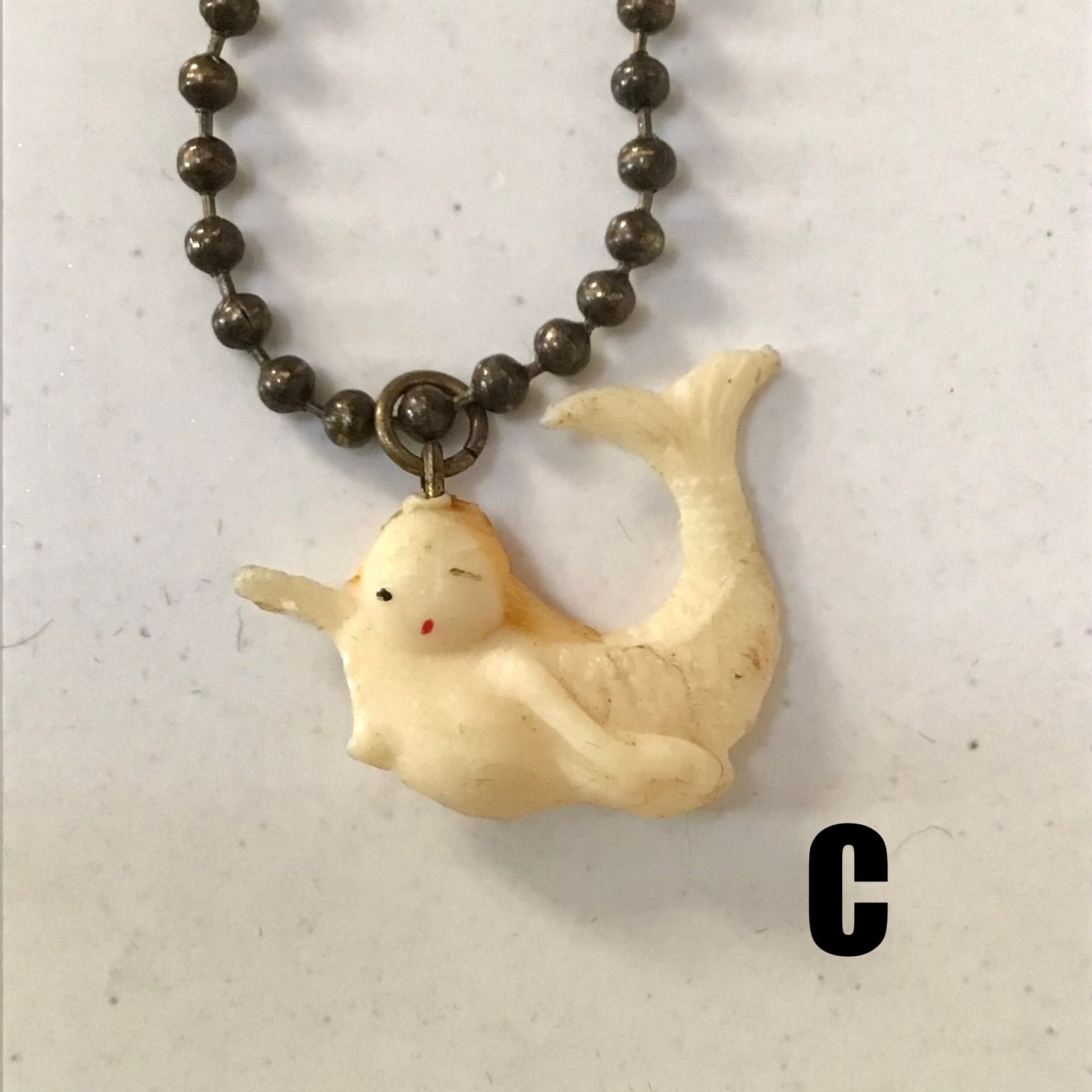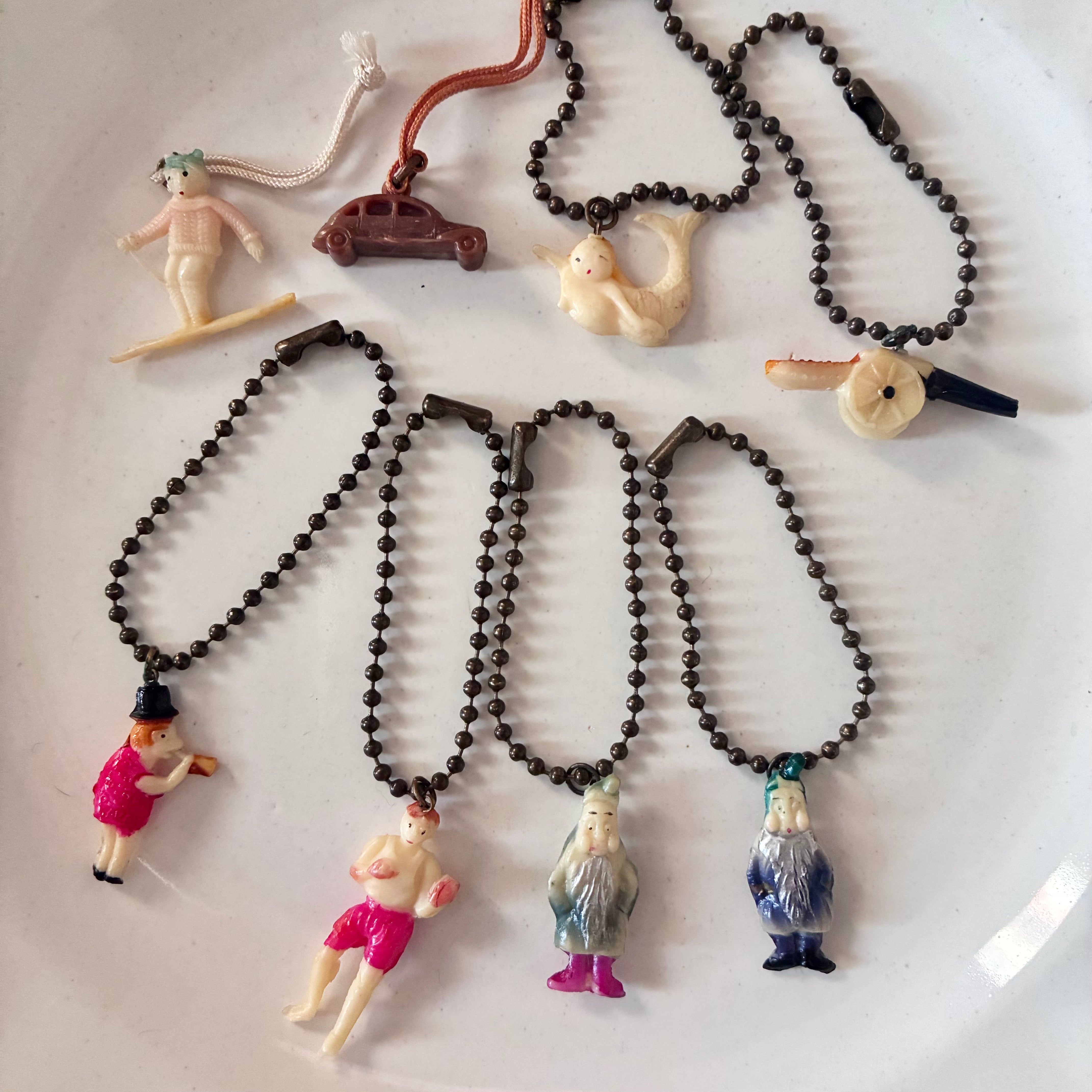 950年代頃のお菓子のおまけチャーム、小人や人魚などユニークなモチーフ達です。当時の紐がそのまま付いておりブローチやネックレスにしたり、襟の先やお気に入りのポーチに縫い付けても可愛いです♡ボールチェーンをお付けしますので必要に応じてお使いください◎