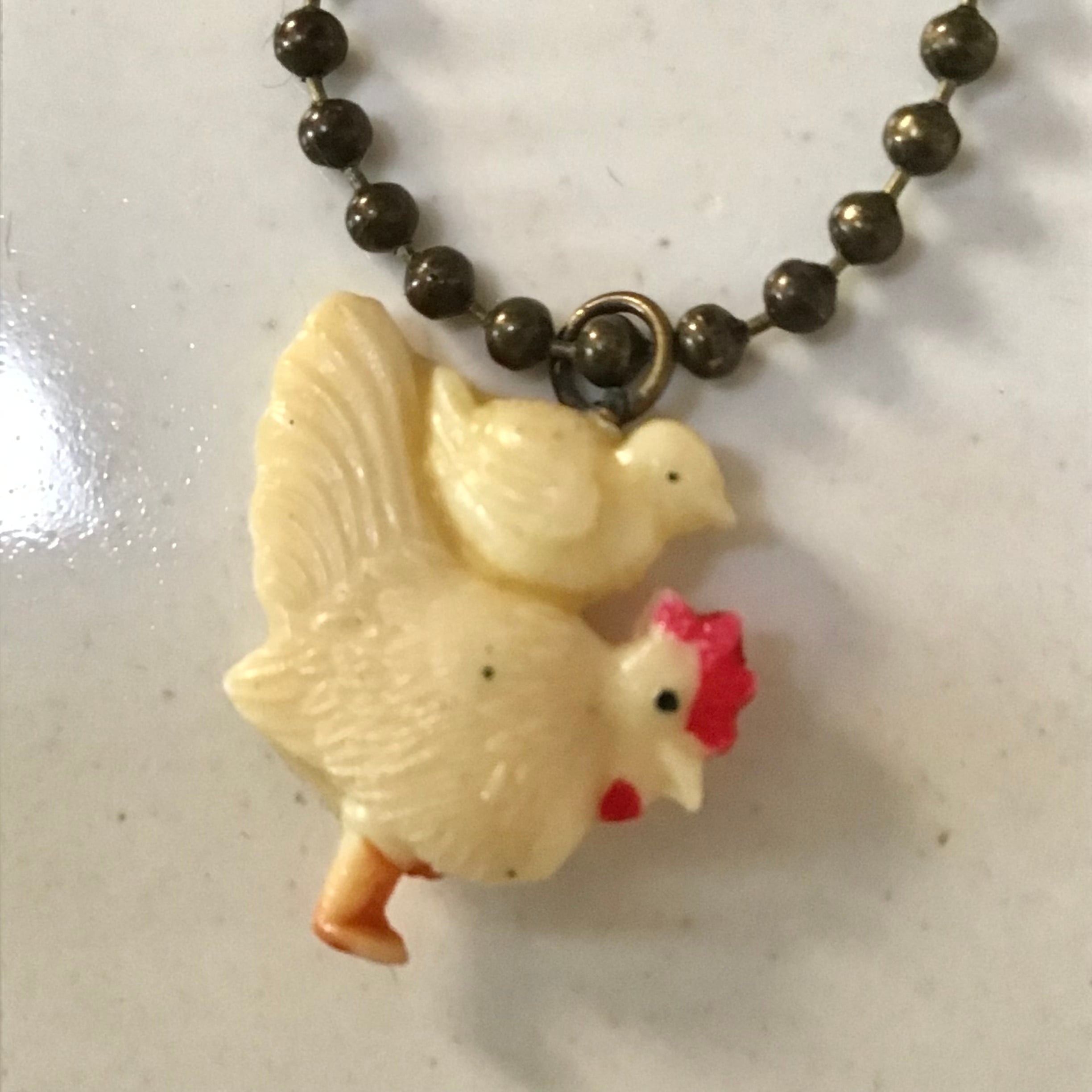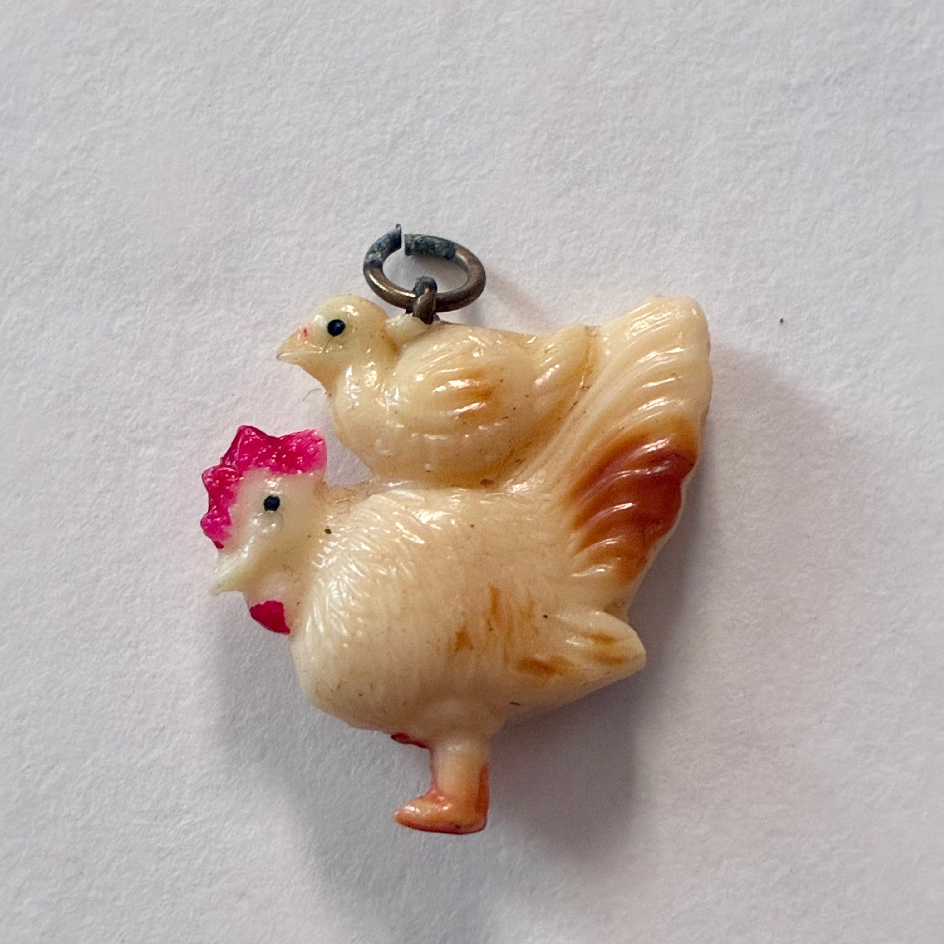 950年代頃のお菓子のおまけチャーム、鶏の親子です。当時の紐がそのまま付いておりブローチやネックレスにしたり、襟の先やお気に入りのポーチに縫い付けても可愛いです♡ボールチェーンをお付けしますので必要に応じてお使いください◎