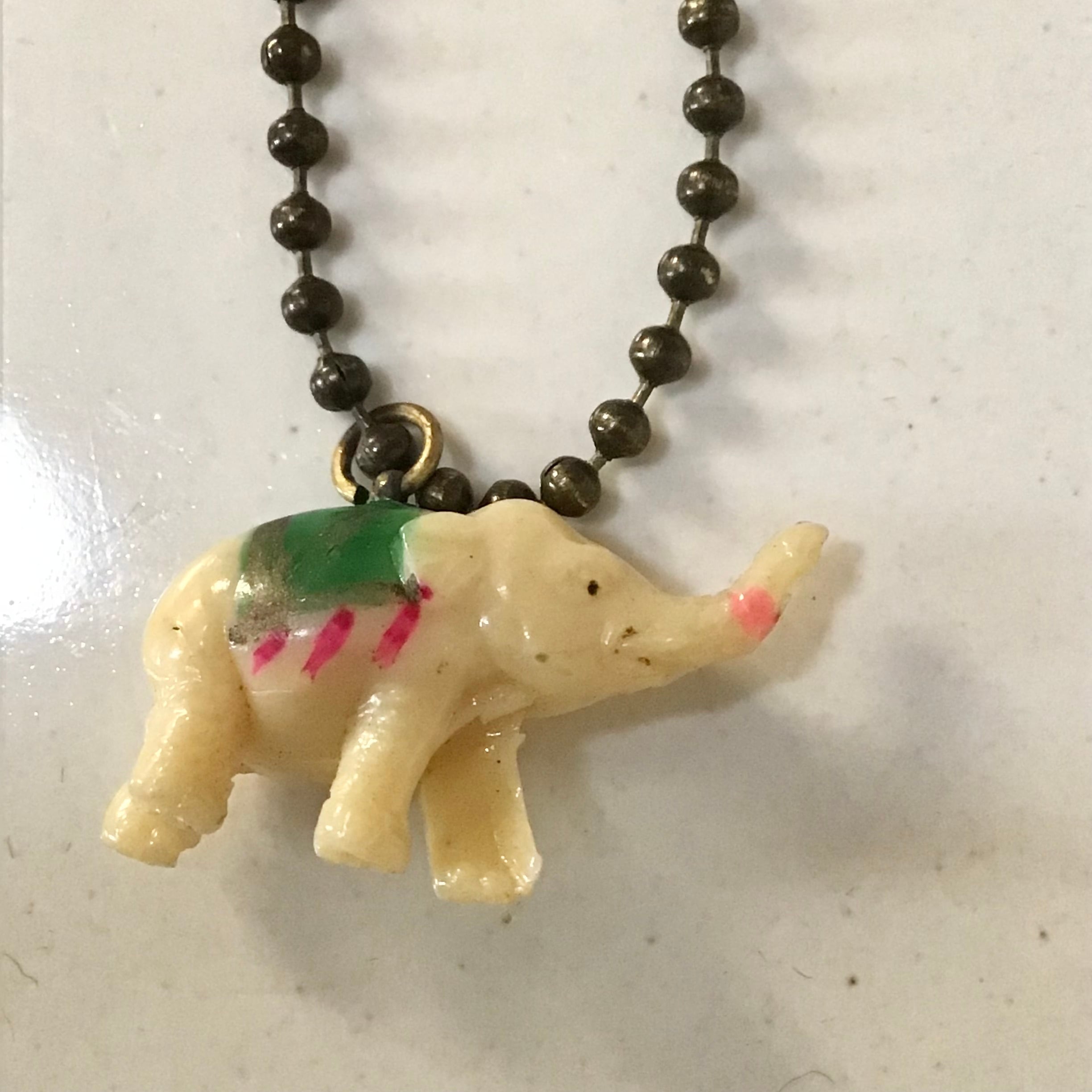 950年代頃のお菓子のおまけチャーム、ゾウさんです。当時の紐がそのまま付いておりブローチやネックレスにしたり、襟の先やお気に入りのポーチに縫い付けても可愛いです♡ボールチェーンをお付けしますので必要に応じてお使いください◎
