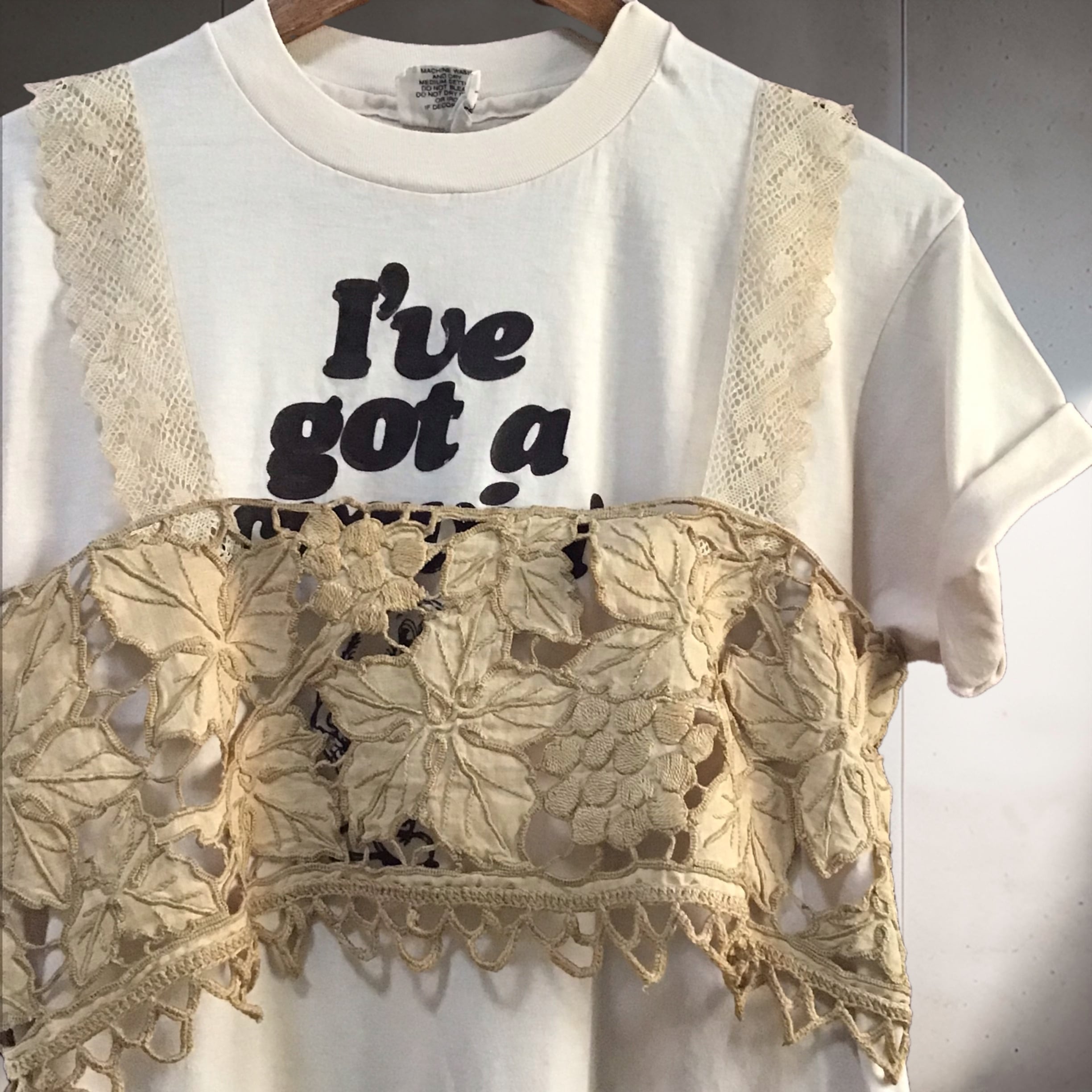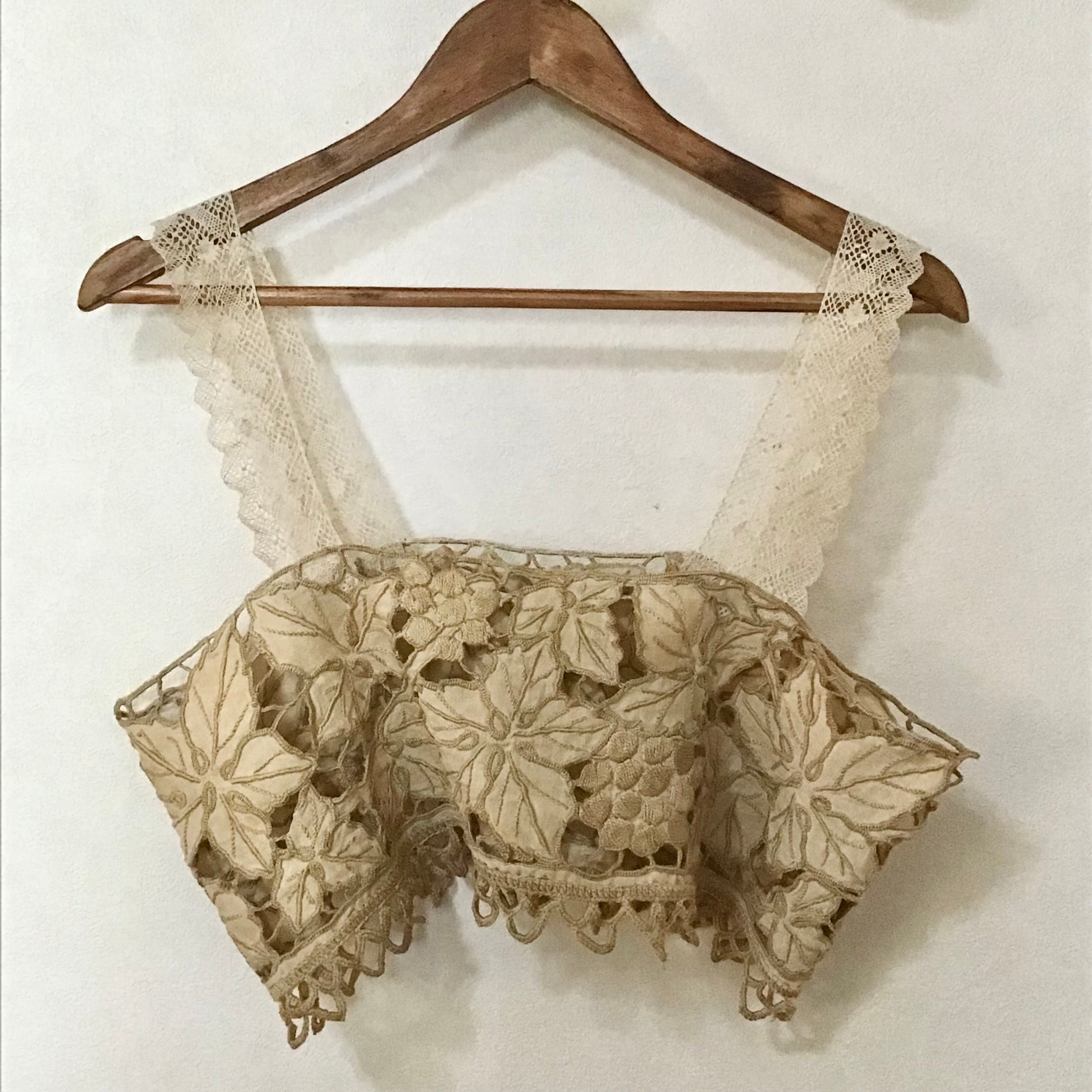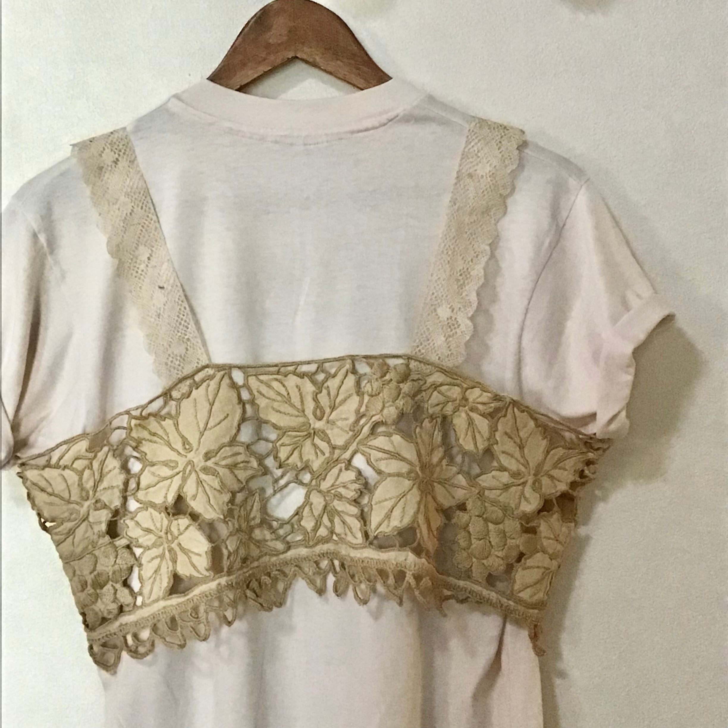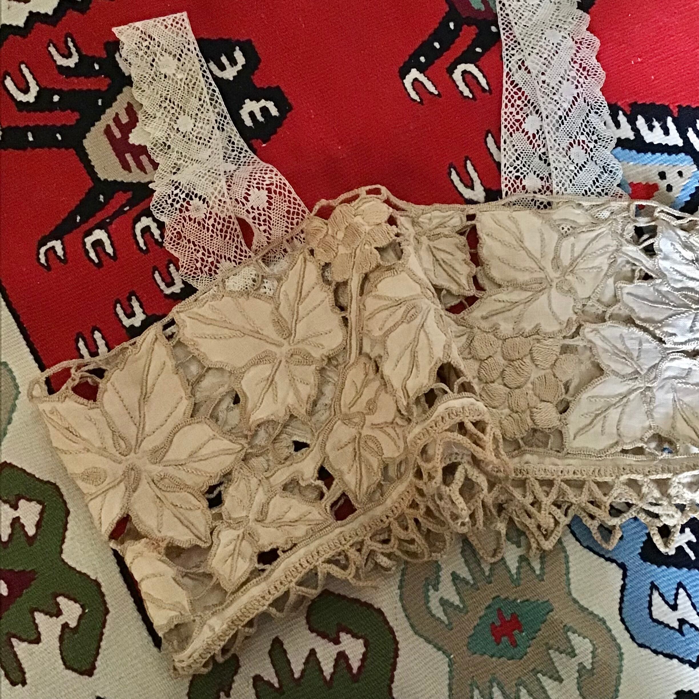 1920年代の手刺繍された生地やレースを組み合わせてトップスにしました♡濃いベージュに少し立体感のある葡萄の刺繍と、とても繊細に編まれたレースのストラップがとても良く合い素敵な組み合わせとなりました◎タンクトップやTシャツに重ねてお楽しみください!時代を経た繊細な生地ですので優しく手洗い、バスタオルなどで水気を取り陰干しがおすすめです。