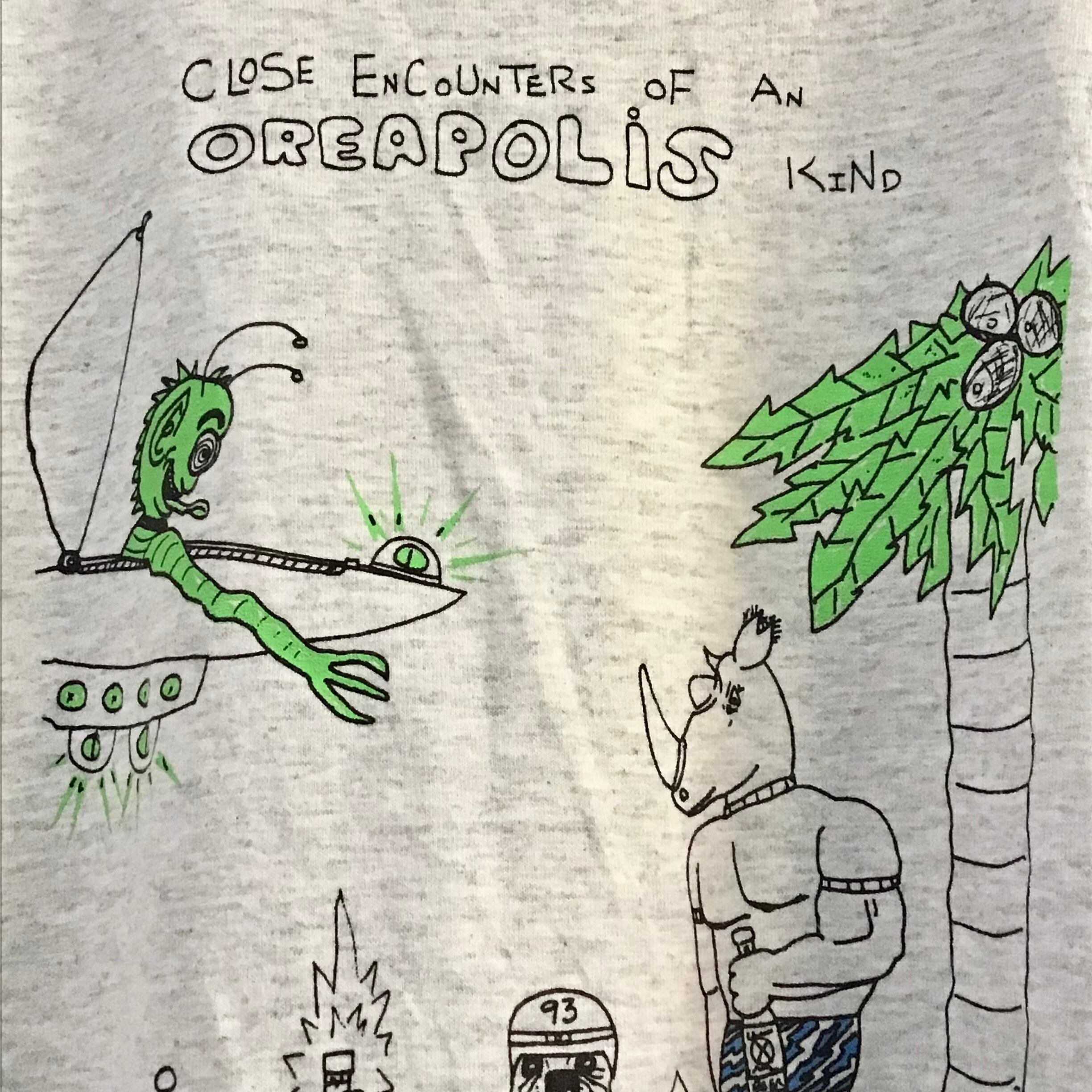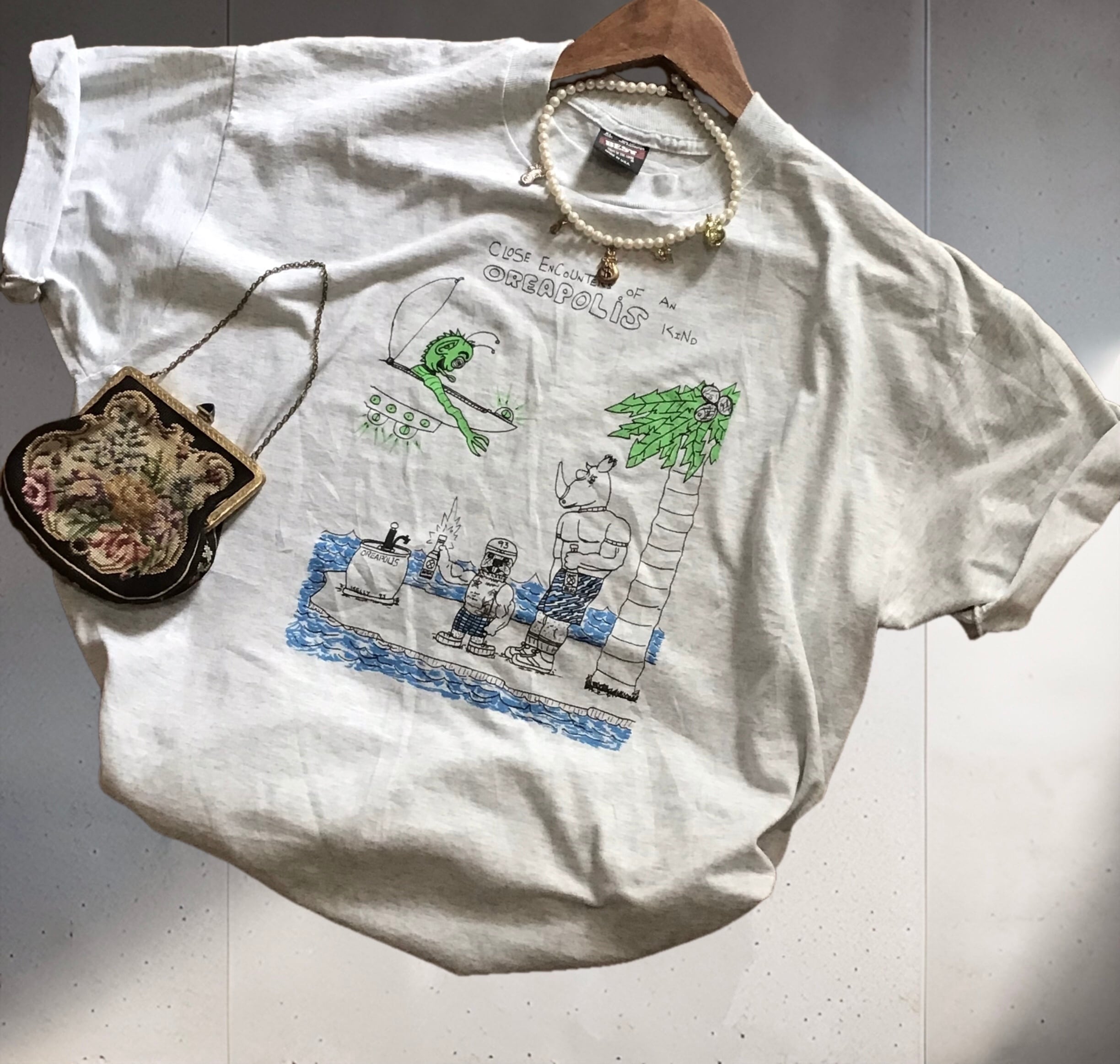 1990年代のプリントTシャツ。おそらく子供達の空想から生まれたキャラクターと思われる、ゆるいイラストがなんともほのぼのしていい味が出ています♡薄いグレーにグリーンやブルーがポイントになり、ゆったりサイズで抜け感のあるコーディネートができそうです◎