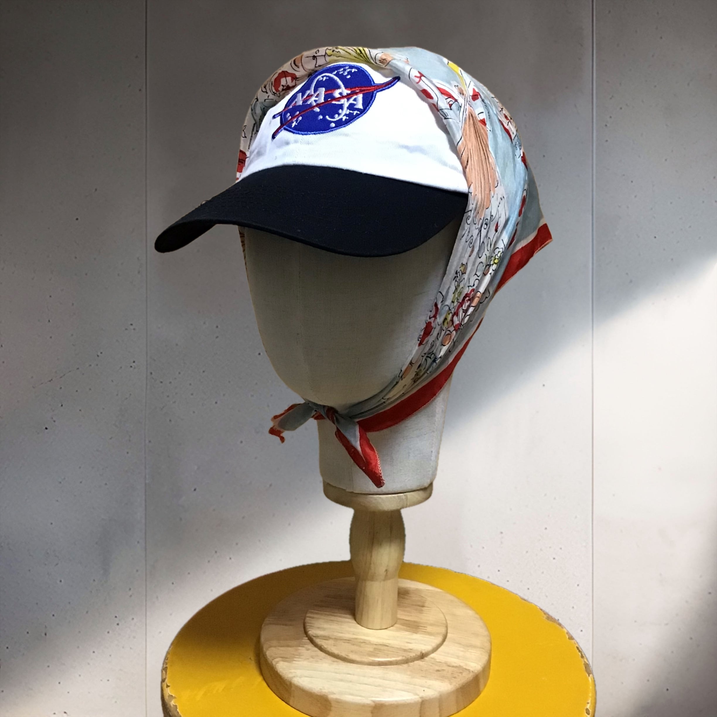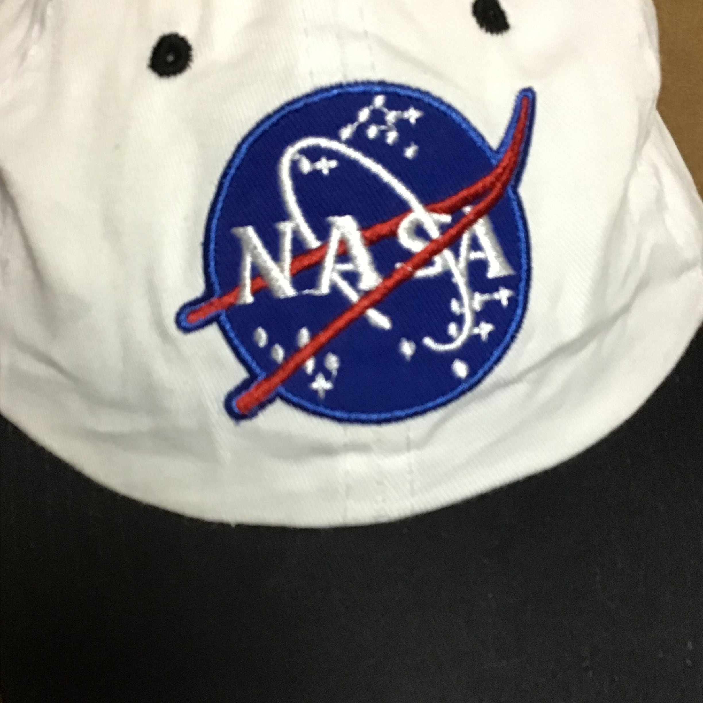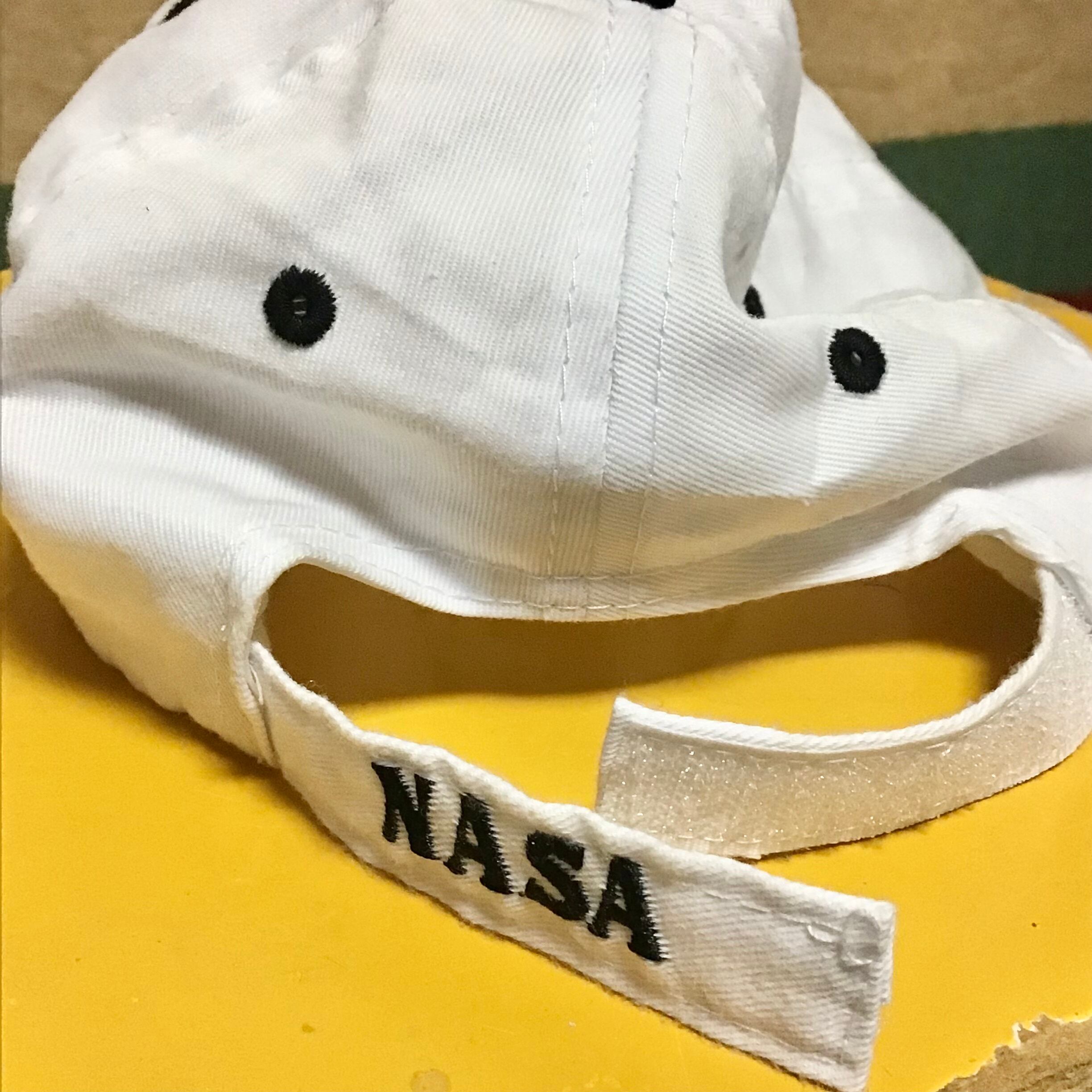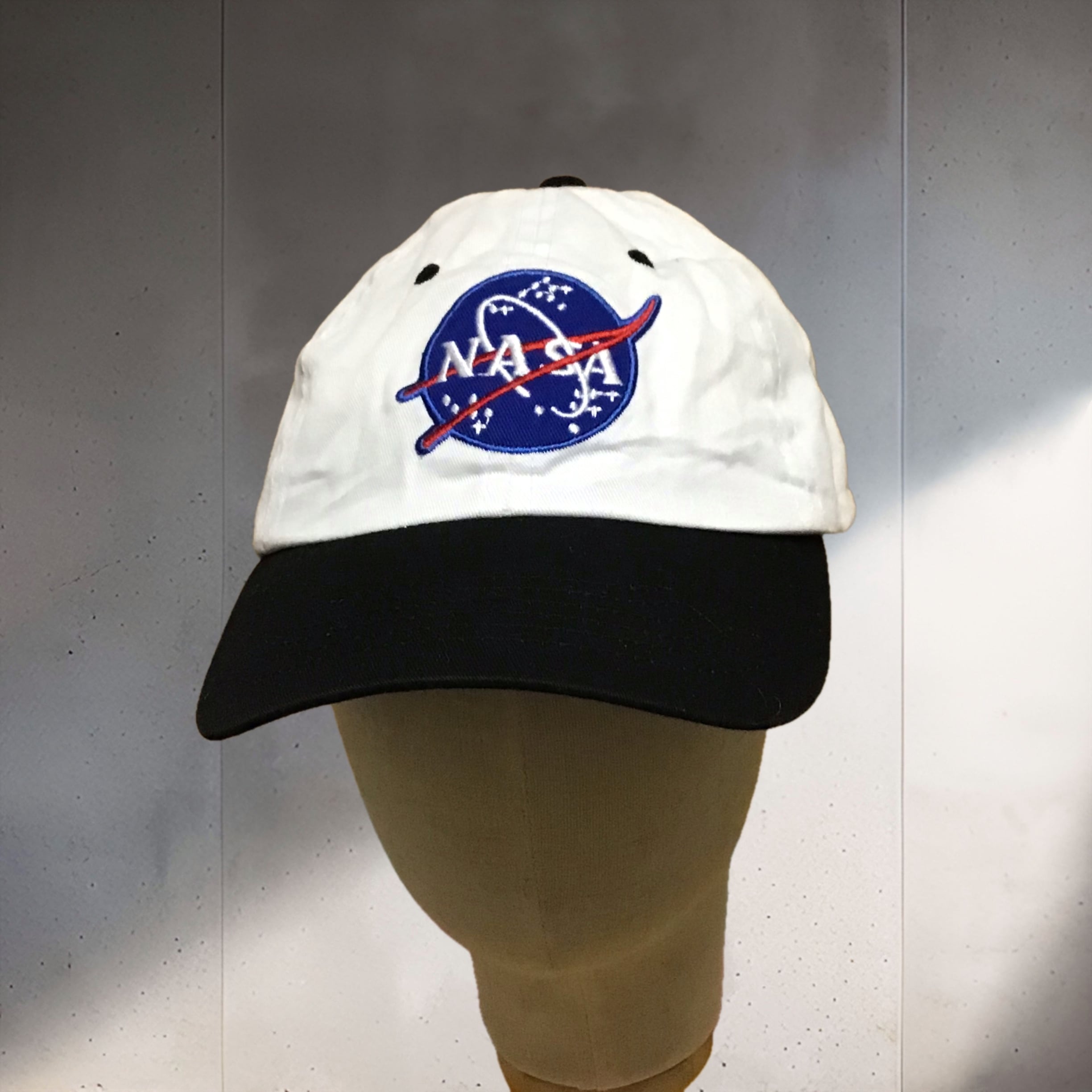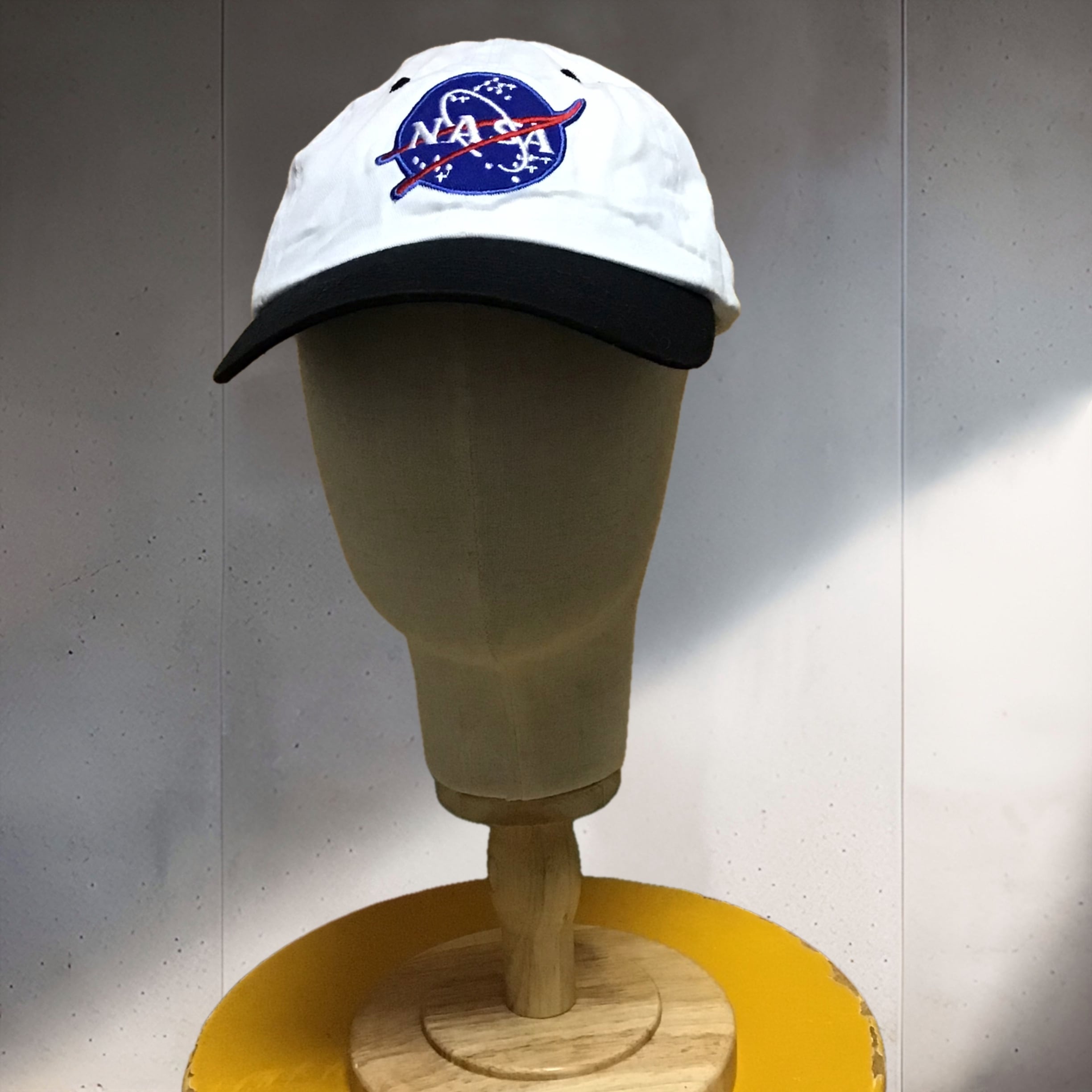 NASAのワッペンつきキャップ。後ろにもロゴ刺繍が入り、マジックテープでサイズ調整できます◎モノトーンで合わせやすく、ハズしにも使えそうです♡
