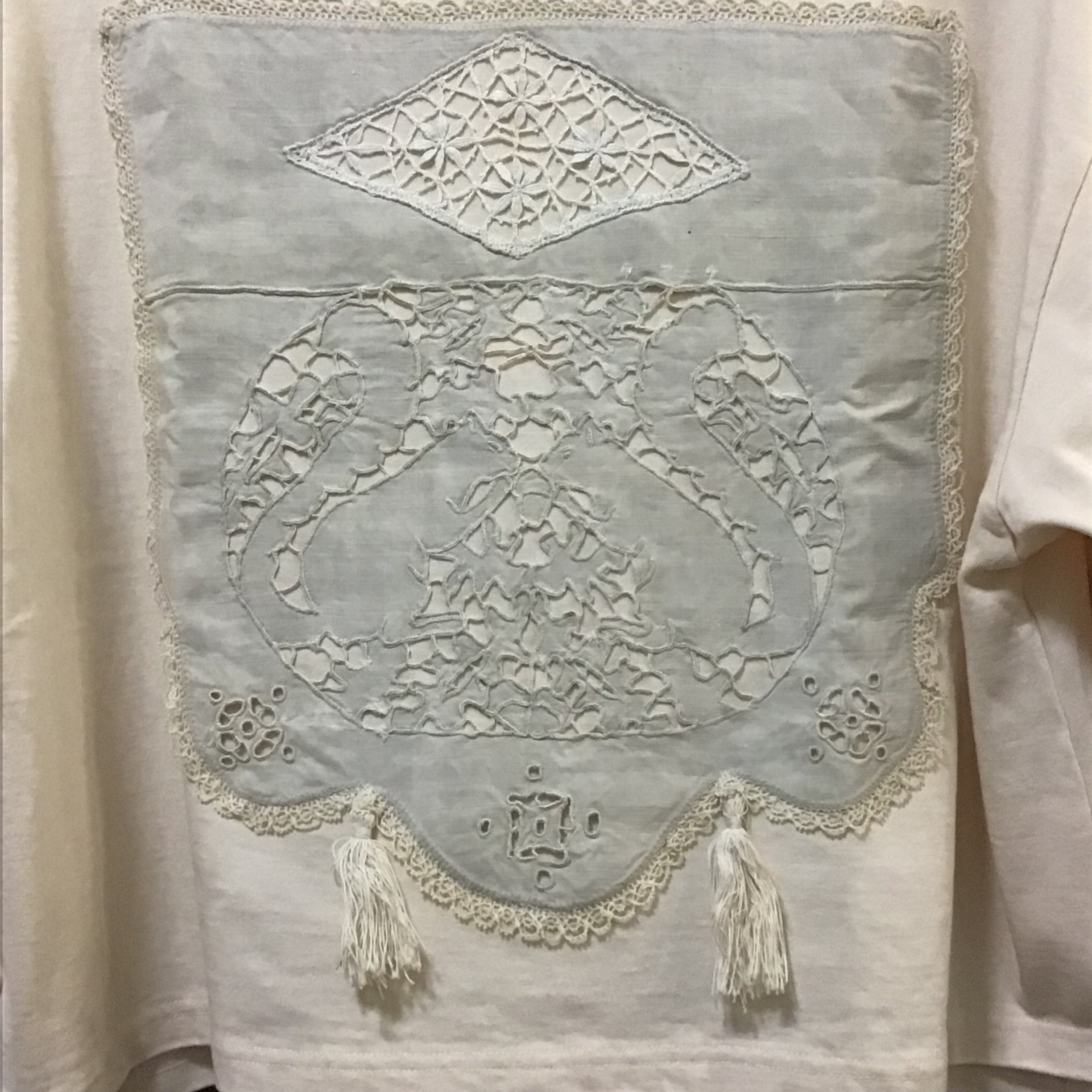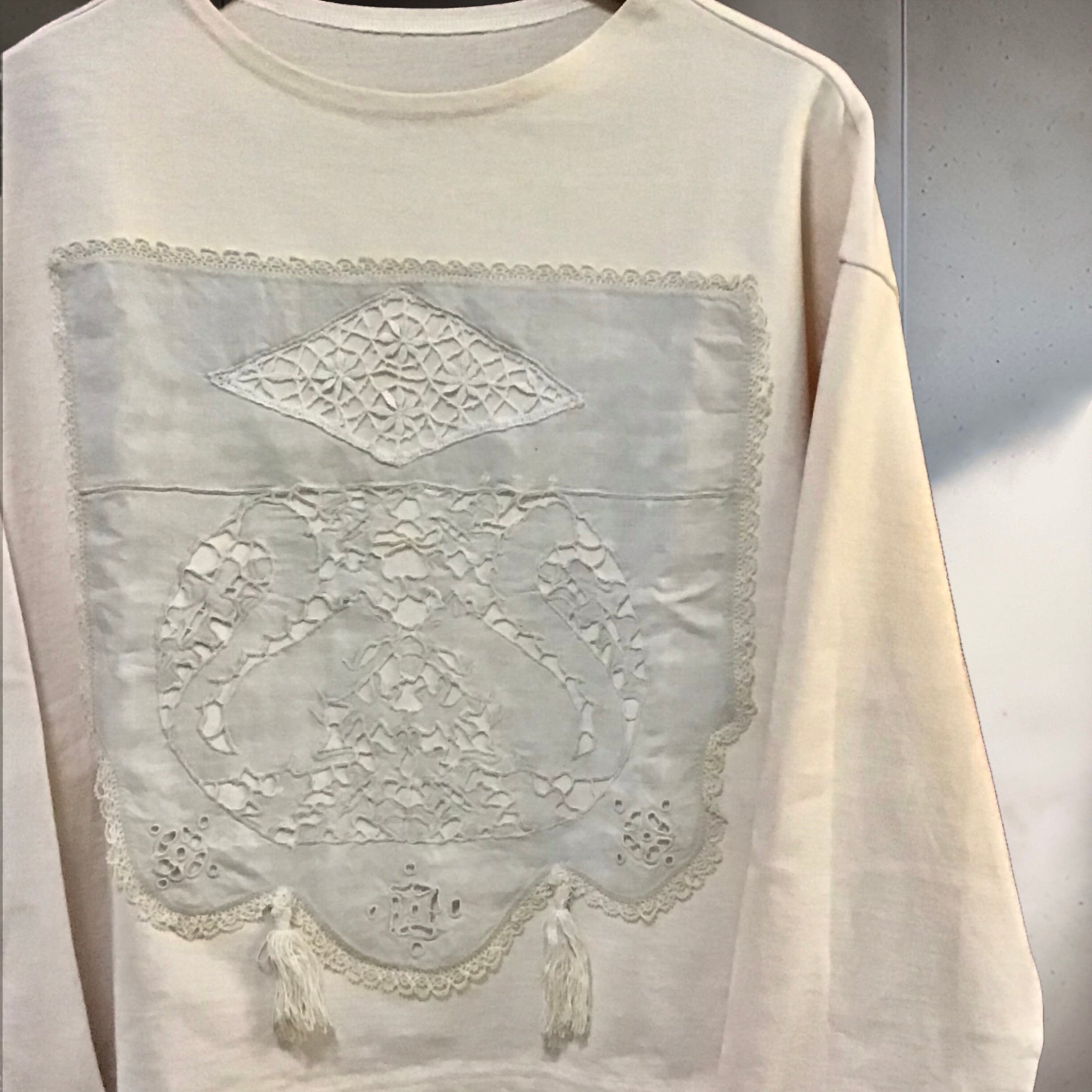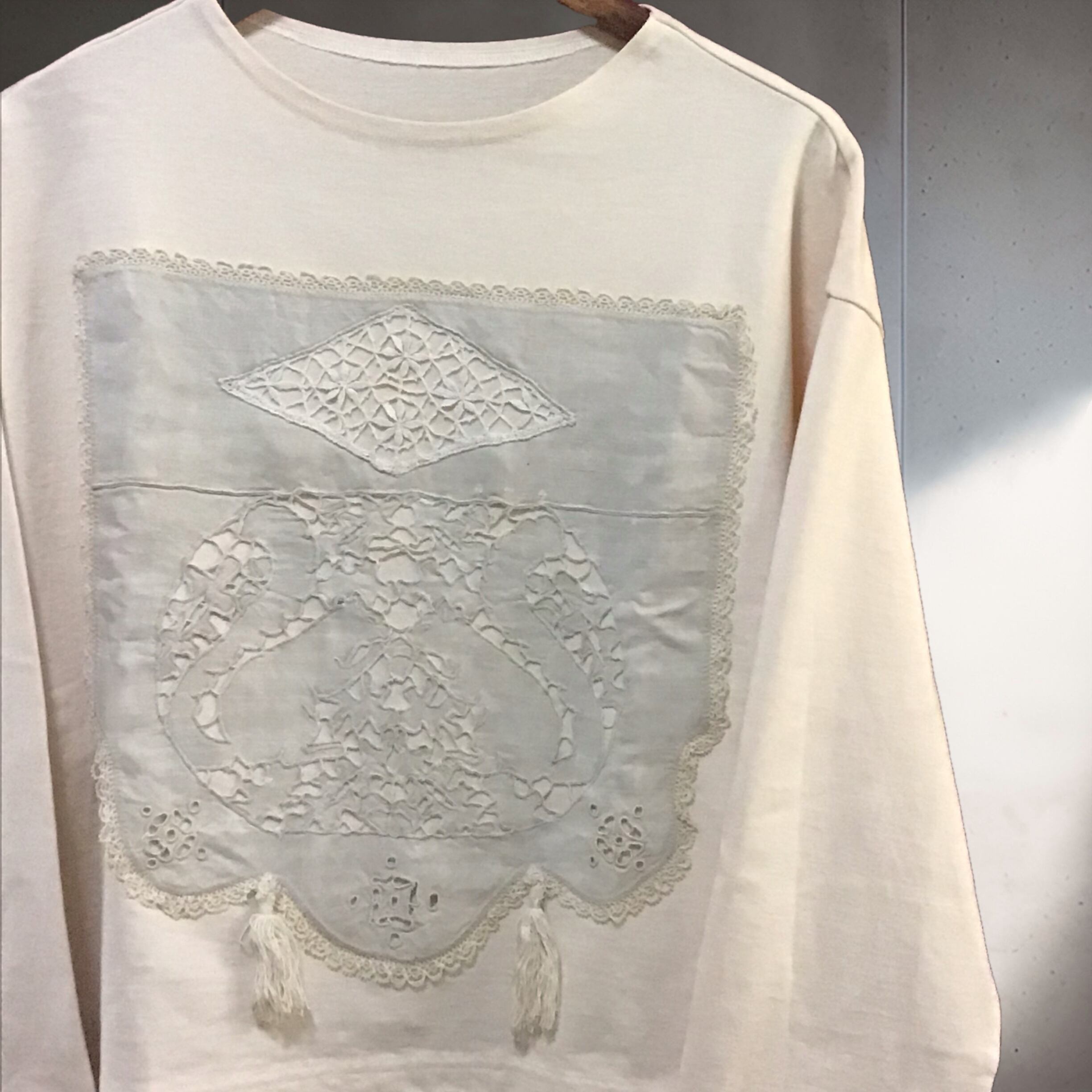 身幅たっぷりの淡いベージュのトップスに2匹のリスとタッセルがポイントのアンティークレースをあしらいました♡可愛いらしいモチーフですが、同系色のレースで甘すぎずサラッと着て頂けます◎身幅たっぷりで重ね着もでき、季節を問わずお使い頂けそうです!