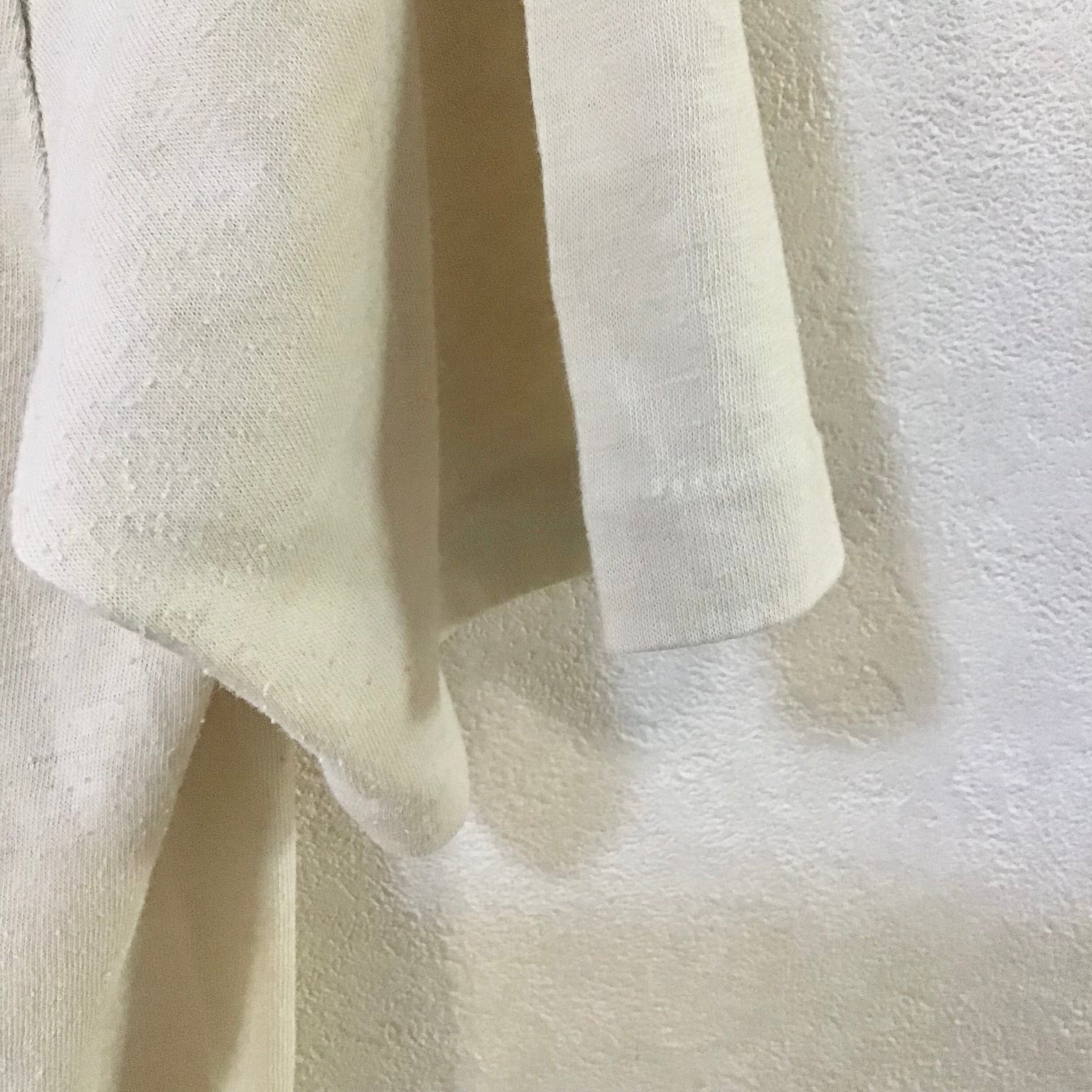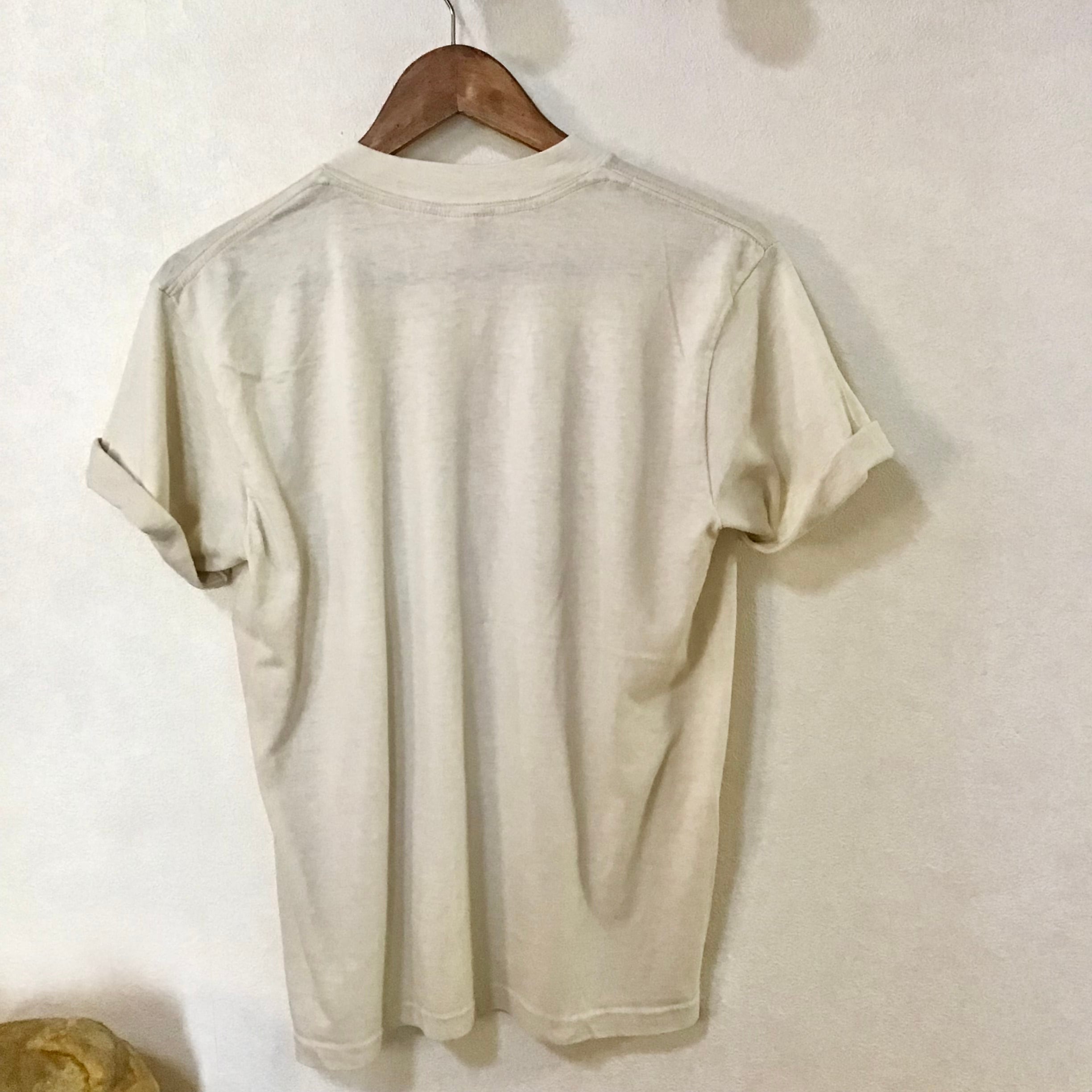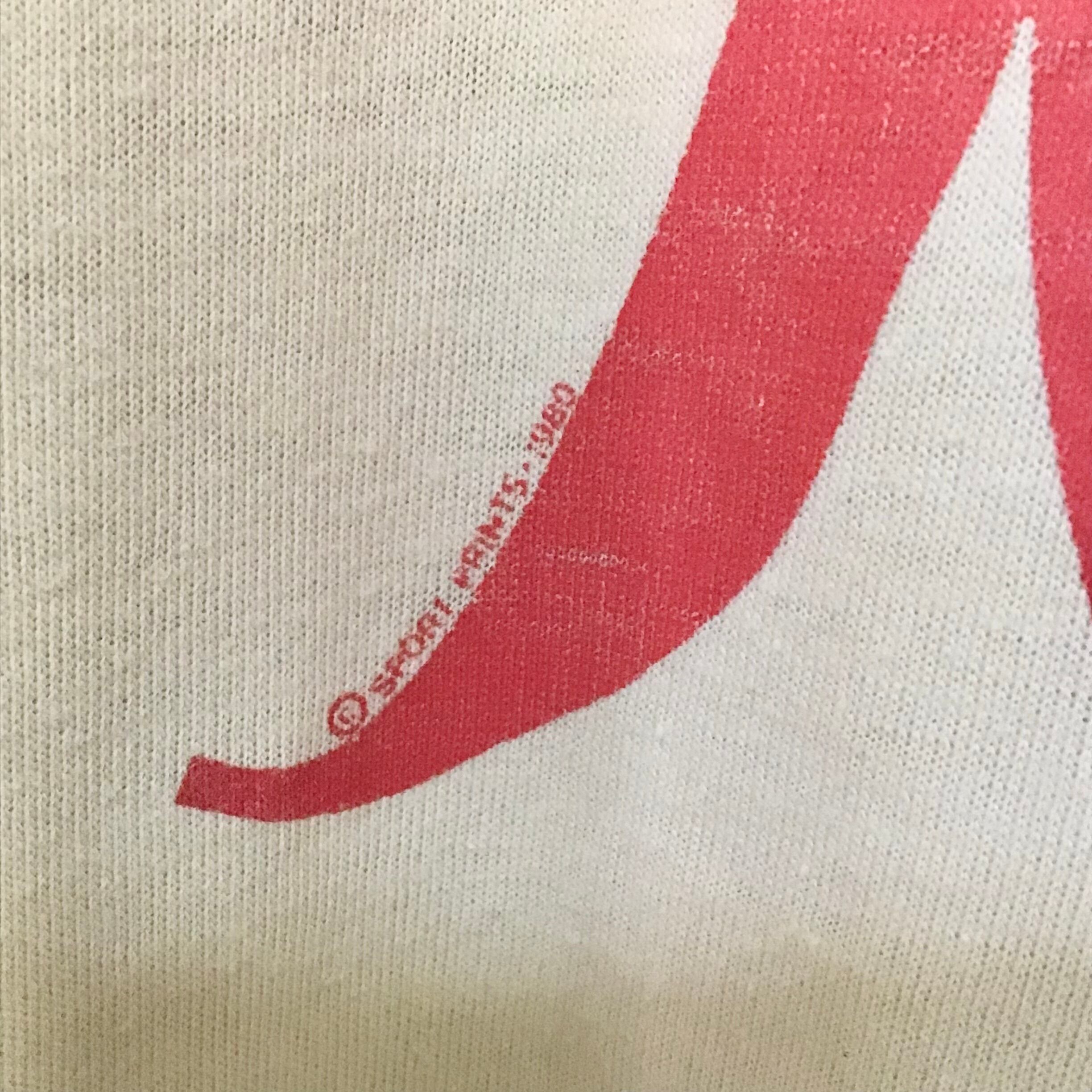 1980年代のプリントTシャツ、薄ベージュと赤みのあるピンクの配色やフォントも良いです♡着こまれて透け感がでた生地が肌に馴染み、華奢なシルエットが出るのもポイントです◎サラッと着るだけで抜け感のあるスタイリングができそうです!