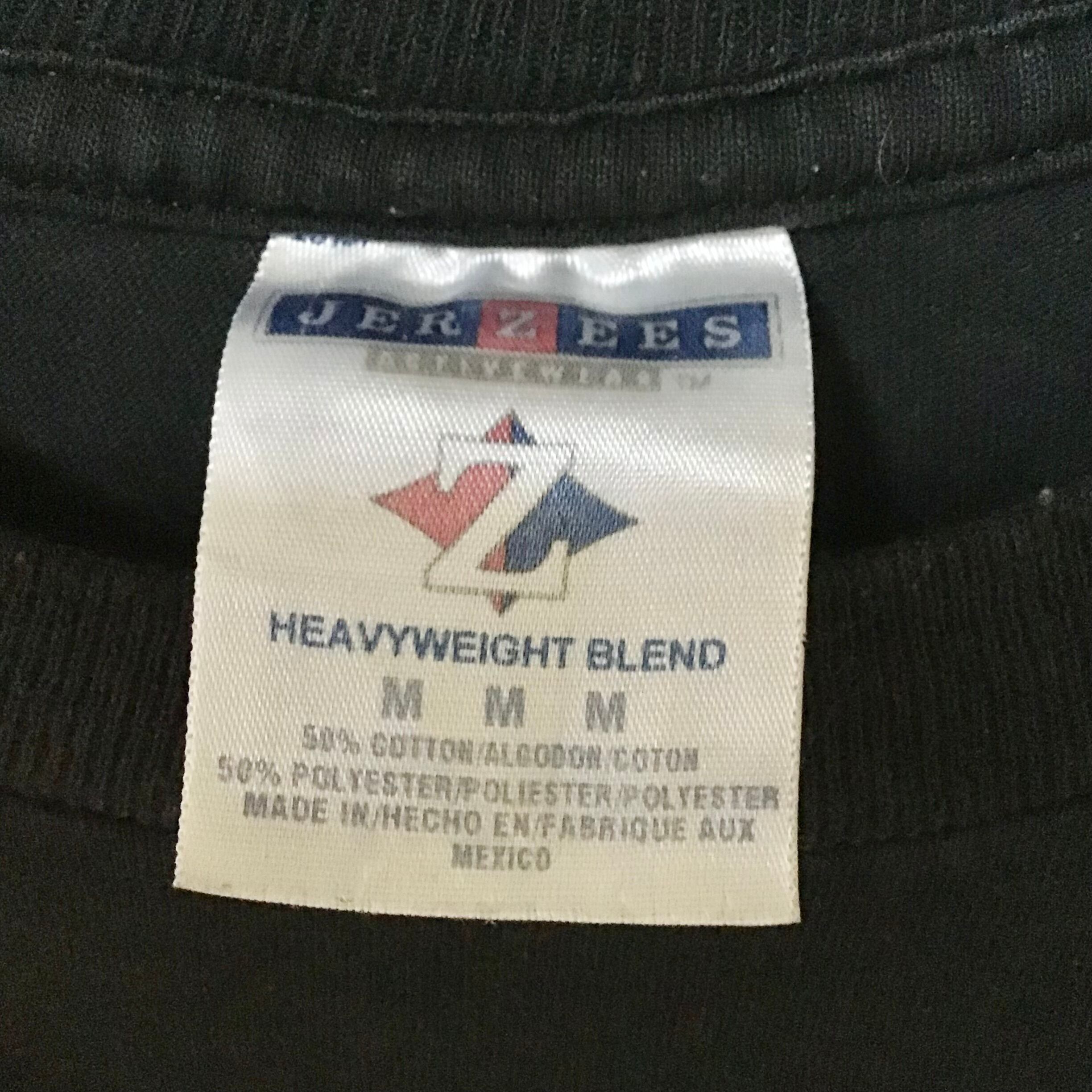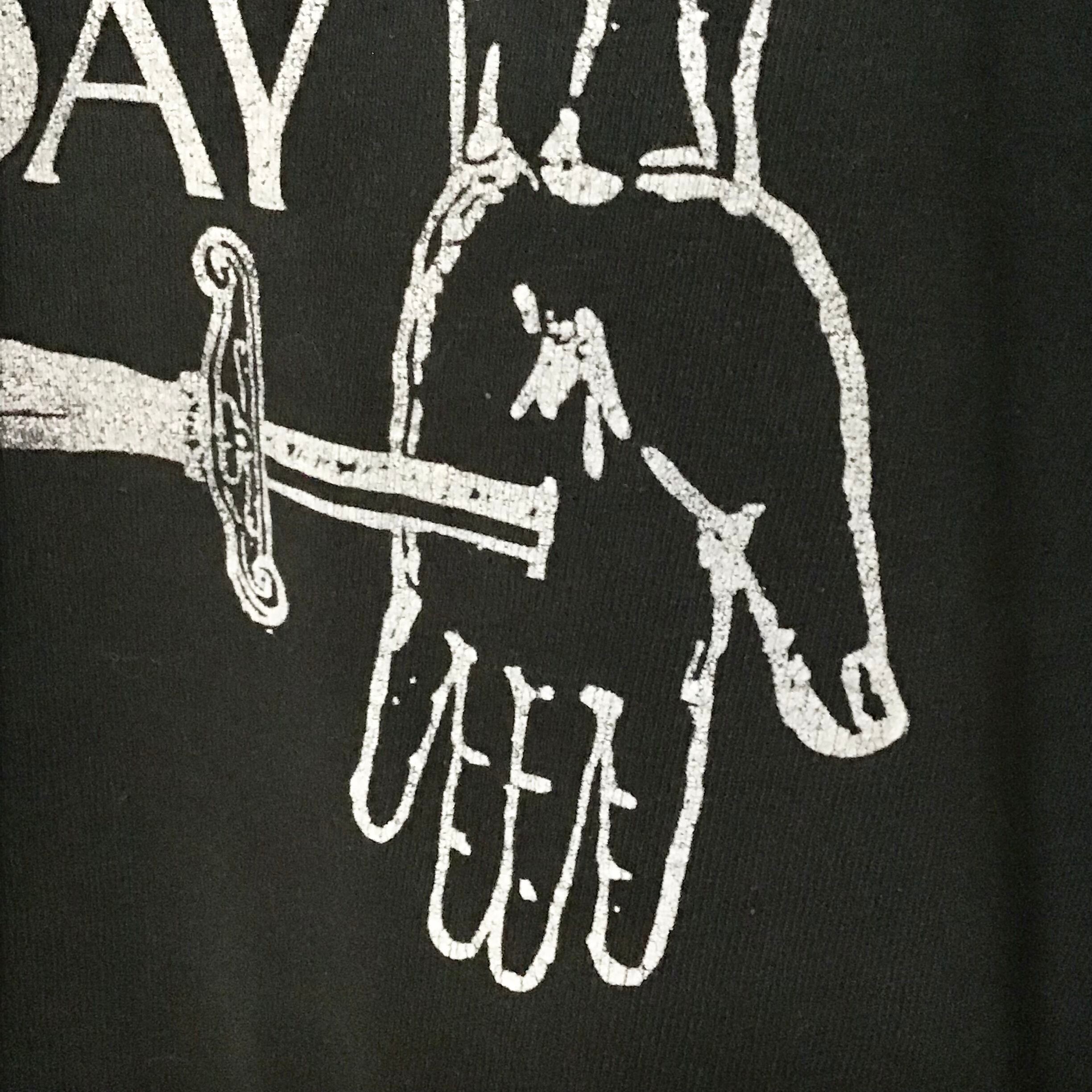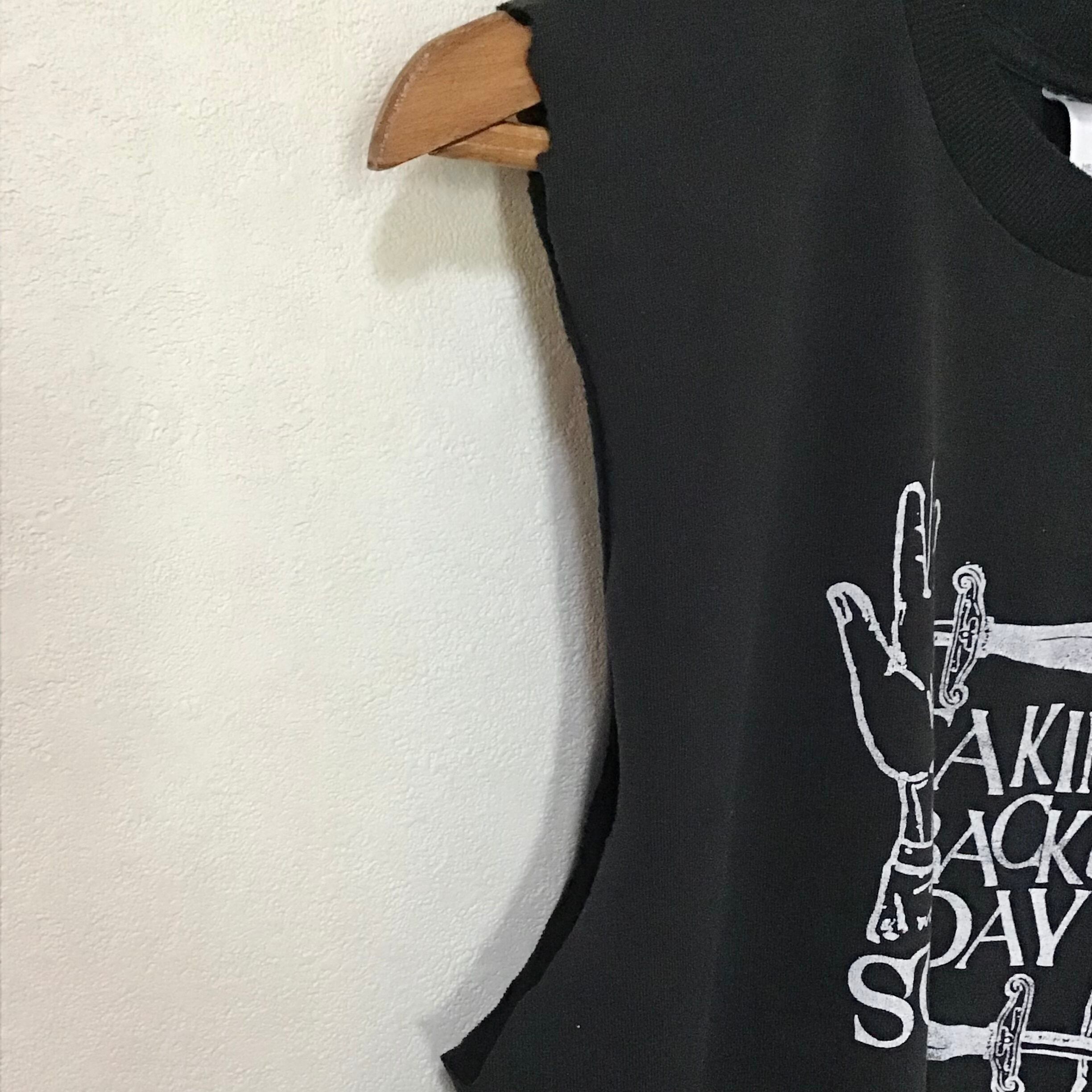 90’sのカットオフTシャツ、袖はかなりざっくりと切り取られています。ユニークなプリントですがモノトーンでポップ過ぎず、脇が広めなので重ね着にもおすすめです◎