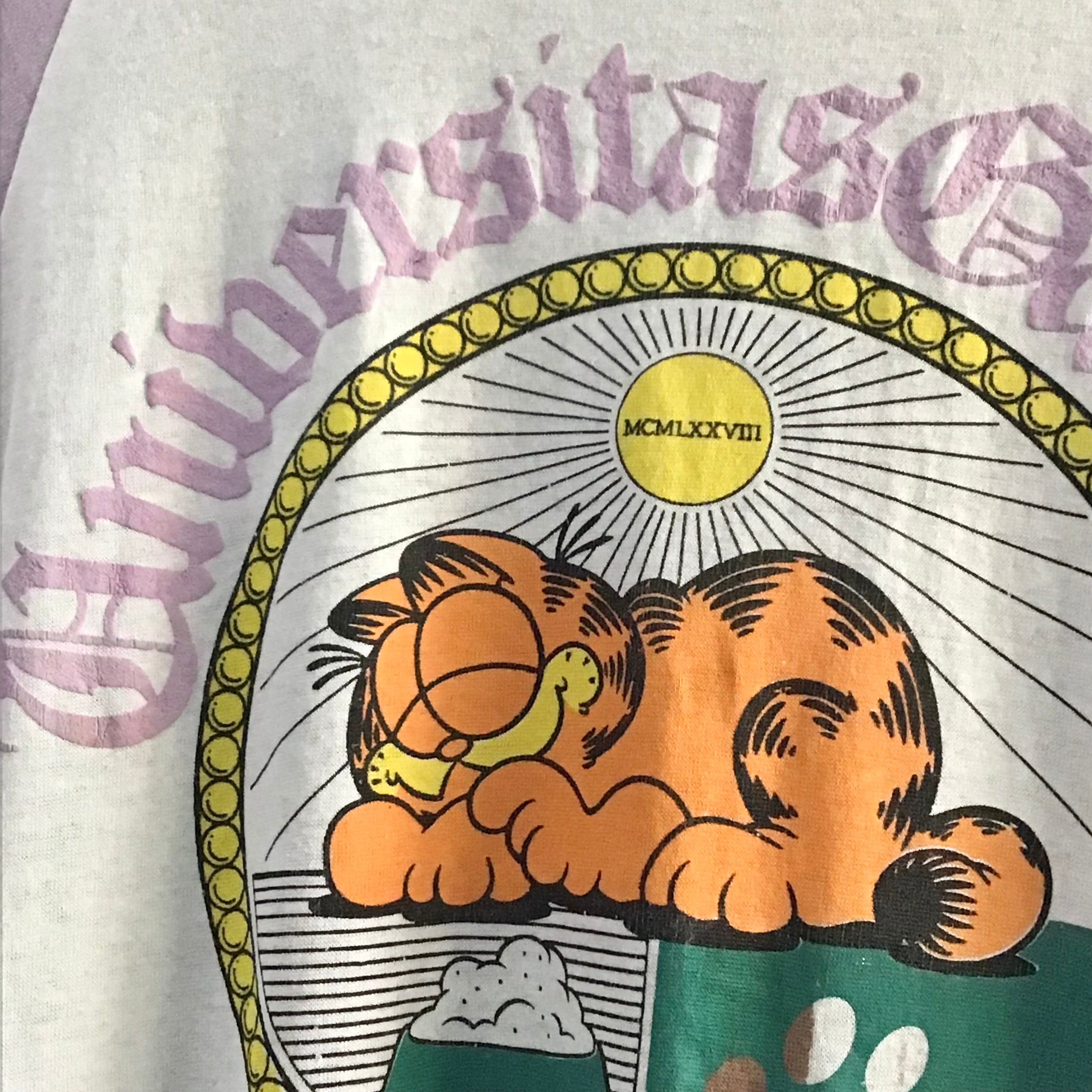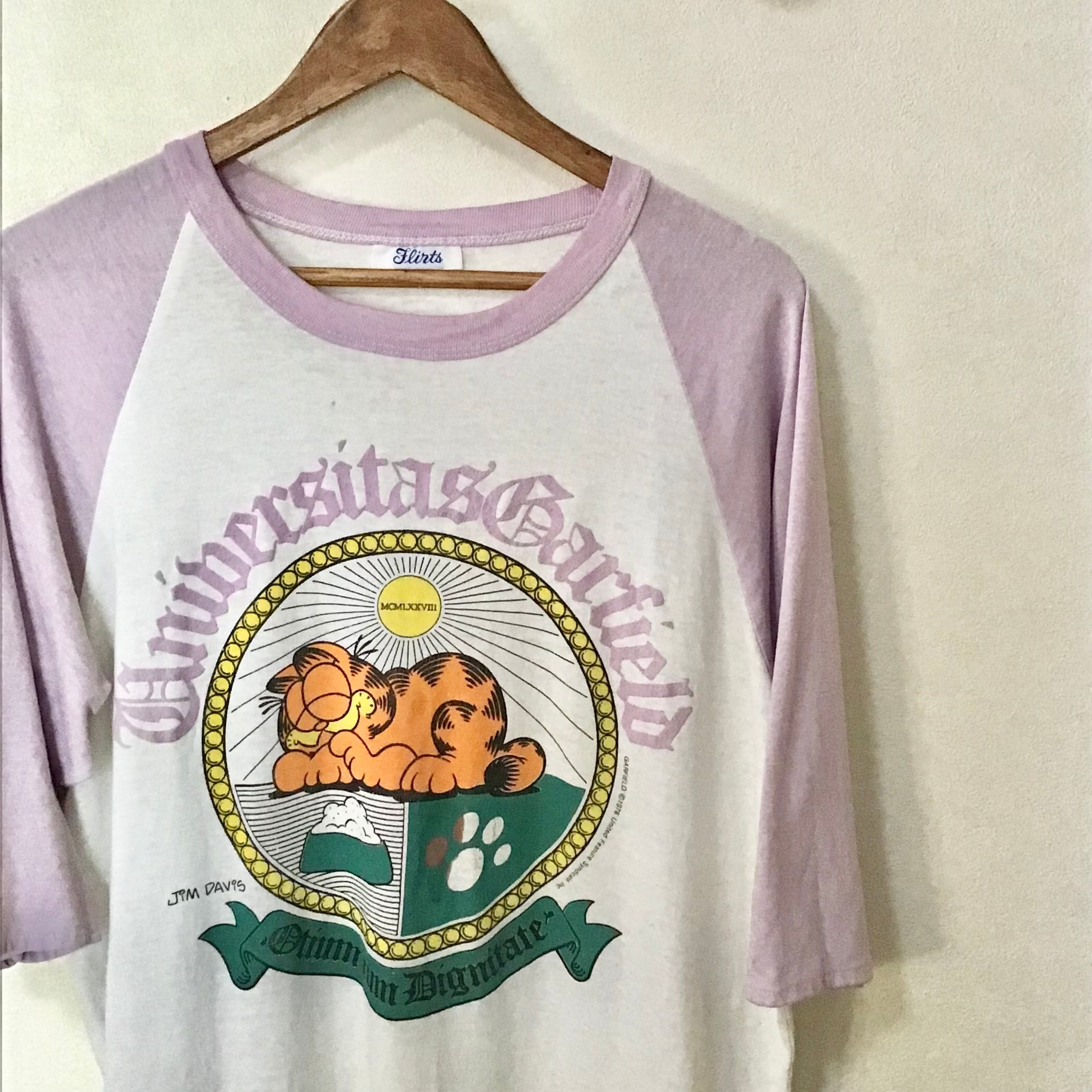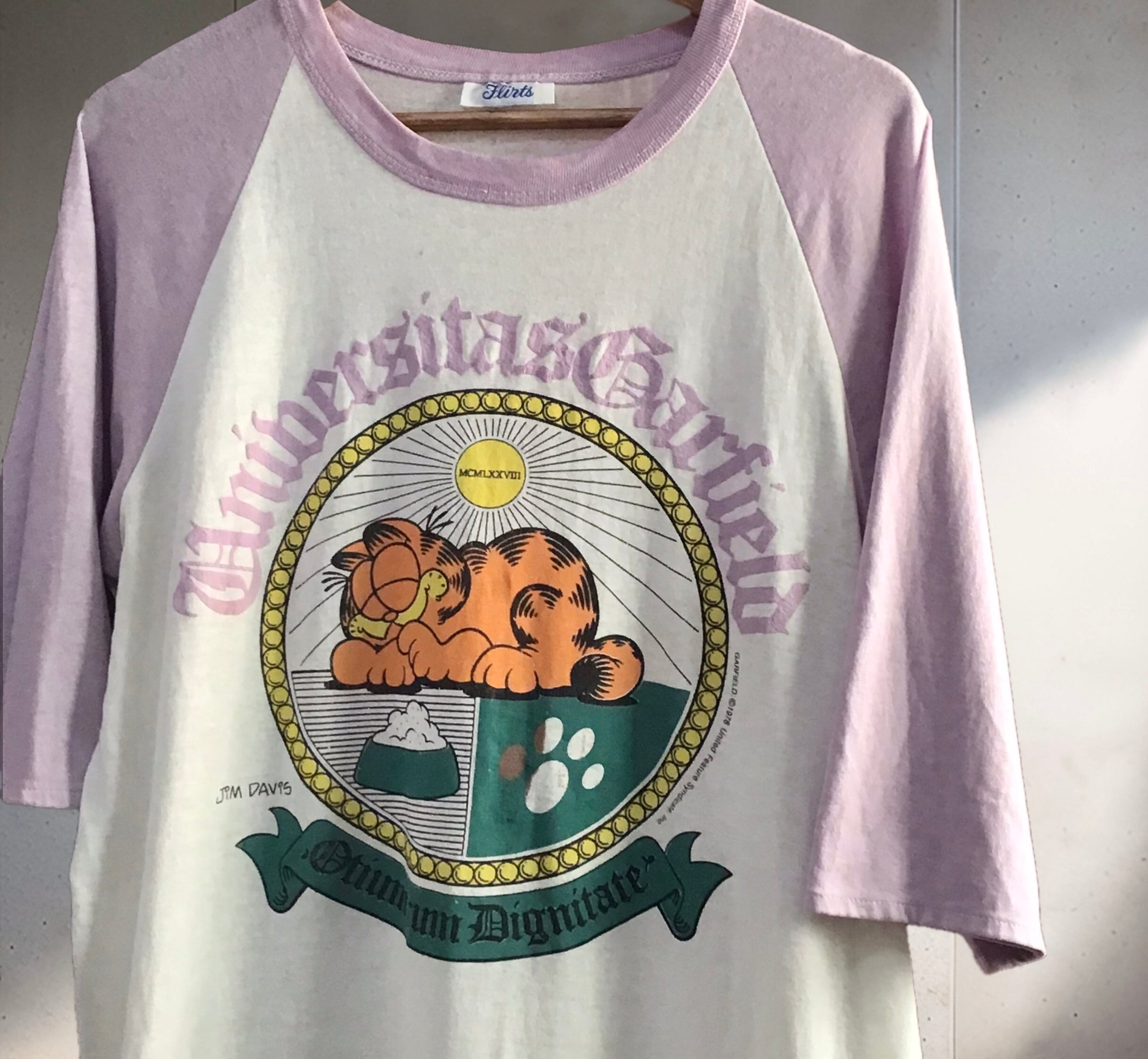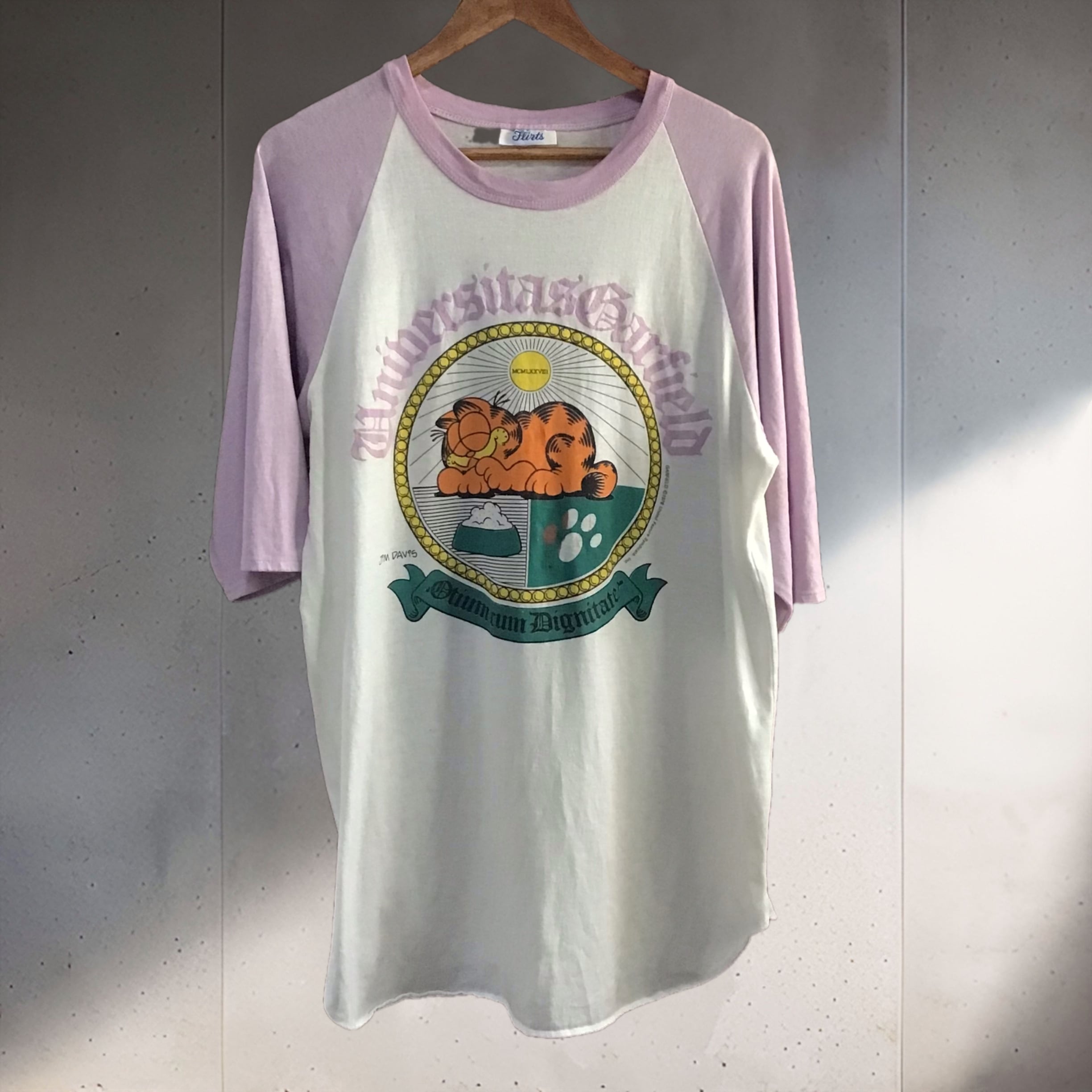 1980年代のガーフィールドTシャツ、ラグラン袖にロング丈のデザインです。淡いパープルとプリントのカラーリングも良く、着こまれてくたっとした生地がこれからの暑い季節にもサラッと気持ちよく着て頂けそうです◎パンツインしてデニムやスラックスに、そのままショーツやロングスカートにも!プリントもとっても可愛いらしく、個人的にお気に入りです♡