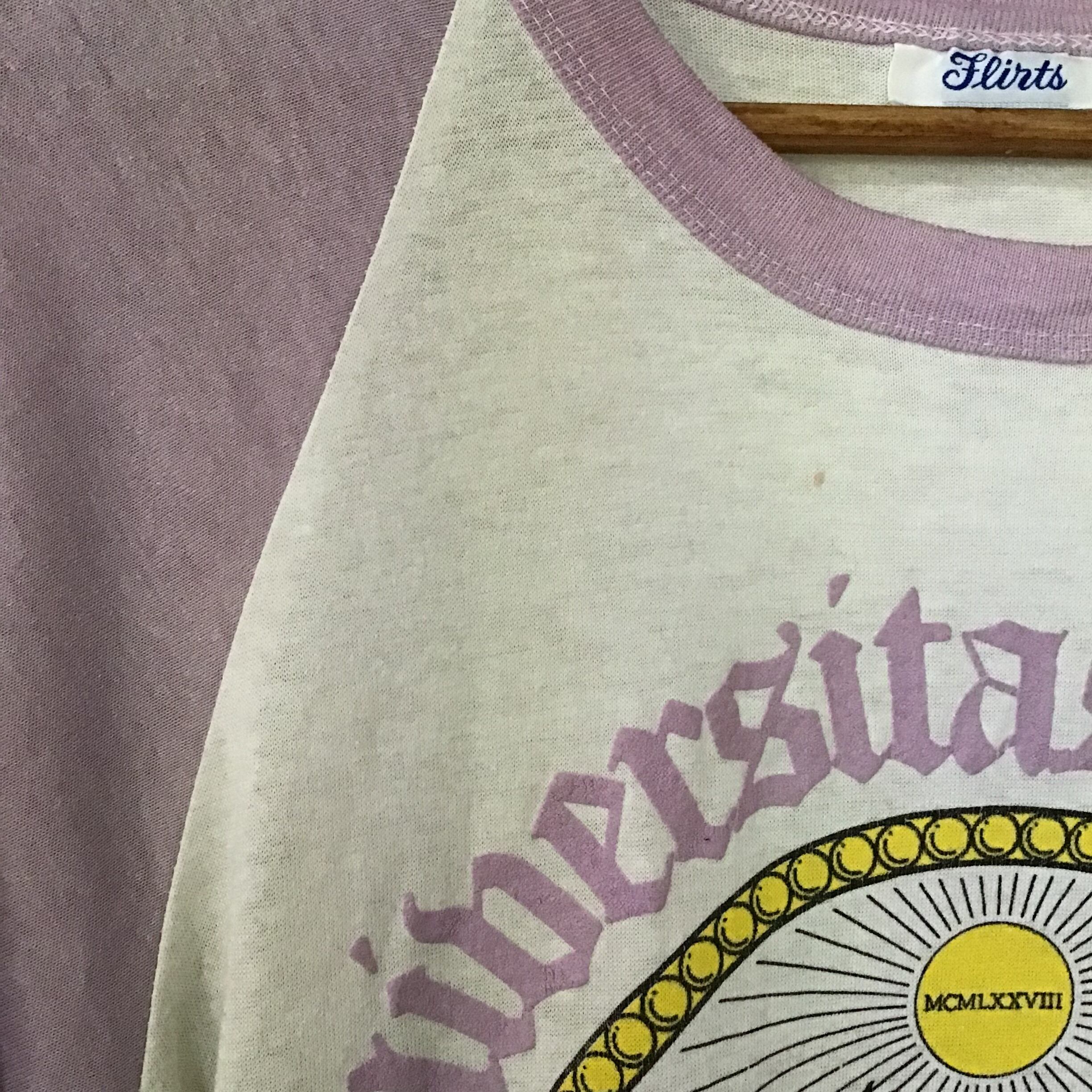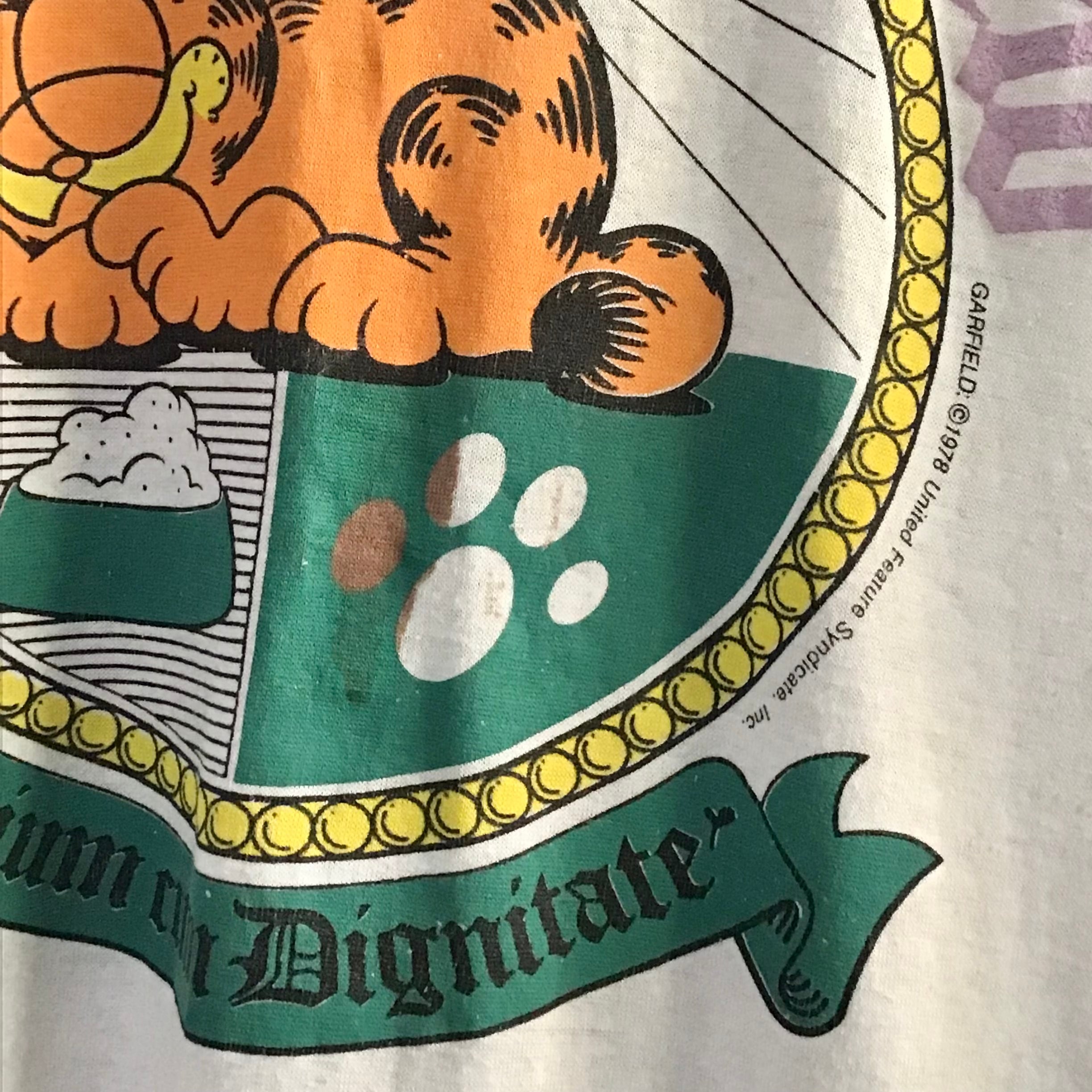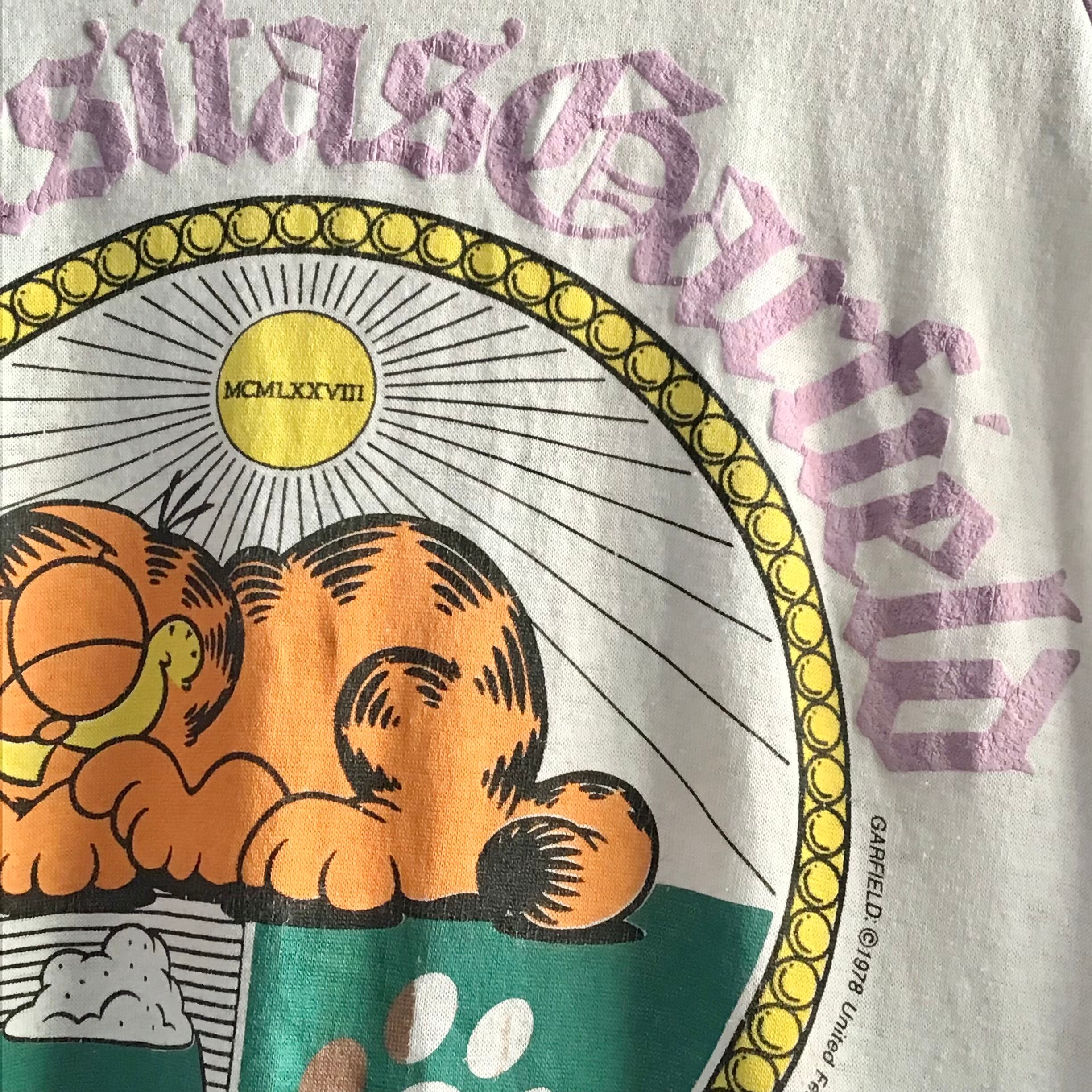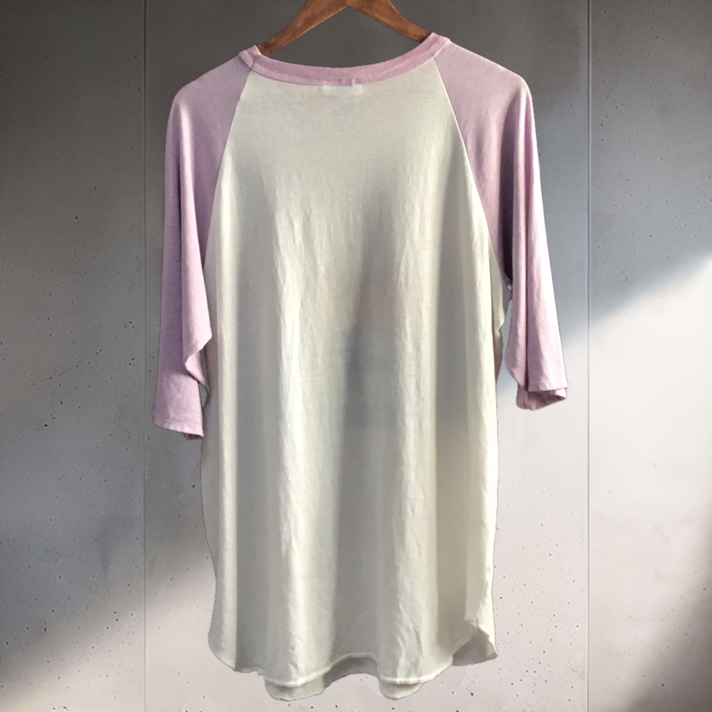 1980年代のガーフィールドTシャツ、ラグラン袖にロング丈のデザインです。淡いパープルとプリントのカラーリングも良く、着こまれてくたっとした生地がこれからの暑い季節にもサラッと気持ちよく着て頂けそうです◎パンツインしてデニムやスラックスに、そのままショーツやロングスカートにも!プリントもとっても可愛いらしく、個人的にお気に入りです♡