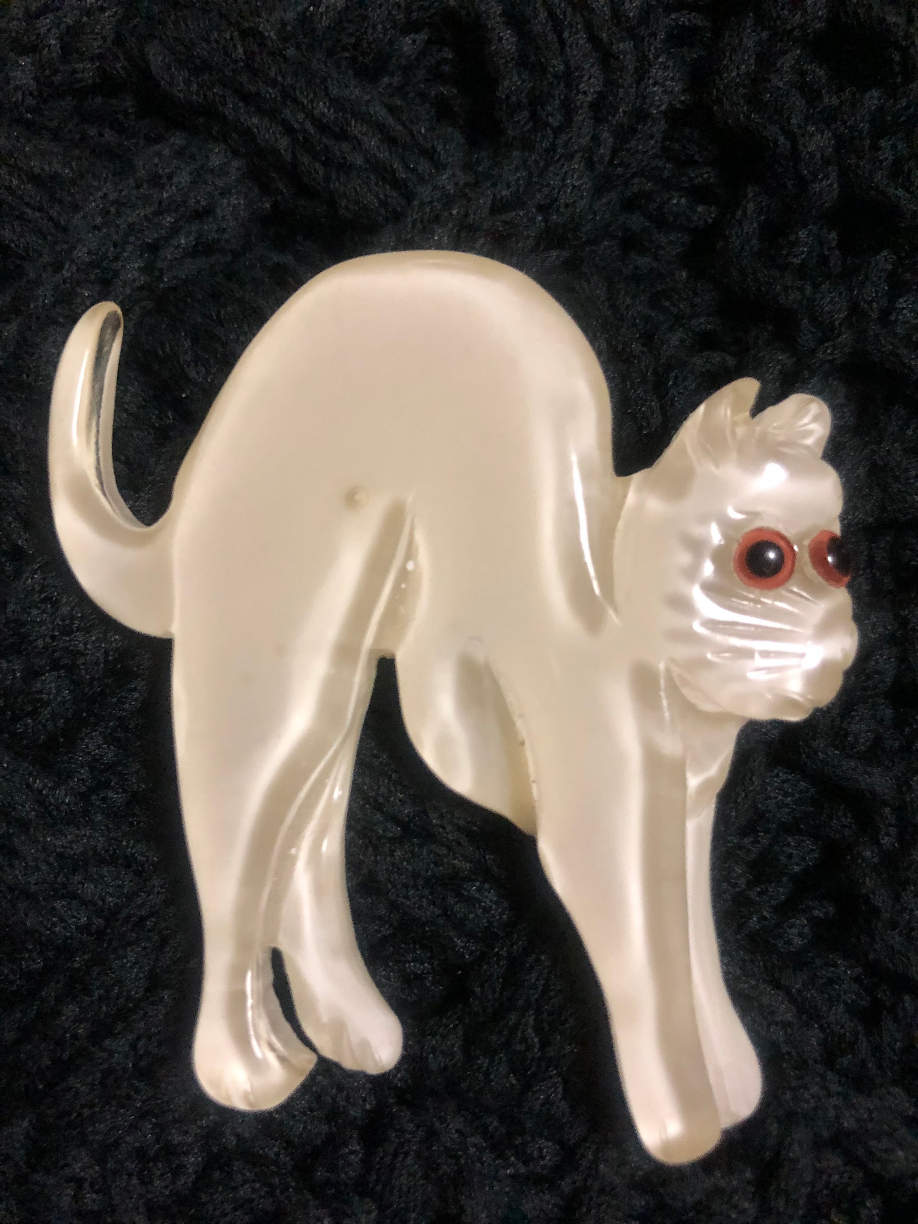 ルーサイトの猫ブローチです。背中の丸みと伸びた前足が愛らしいデザイン。これからの季節、ニットやコートに合わせていろんな所に連れて行ってあげてください♡