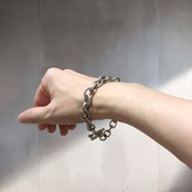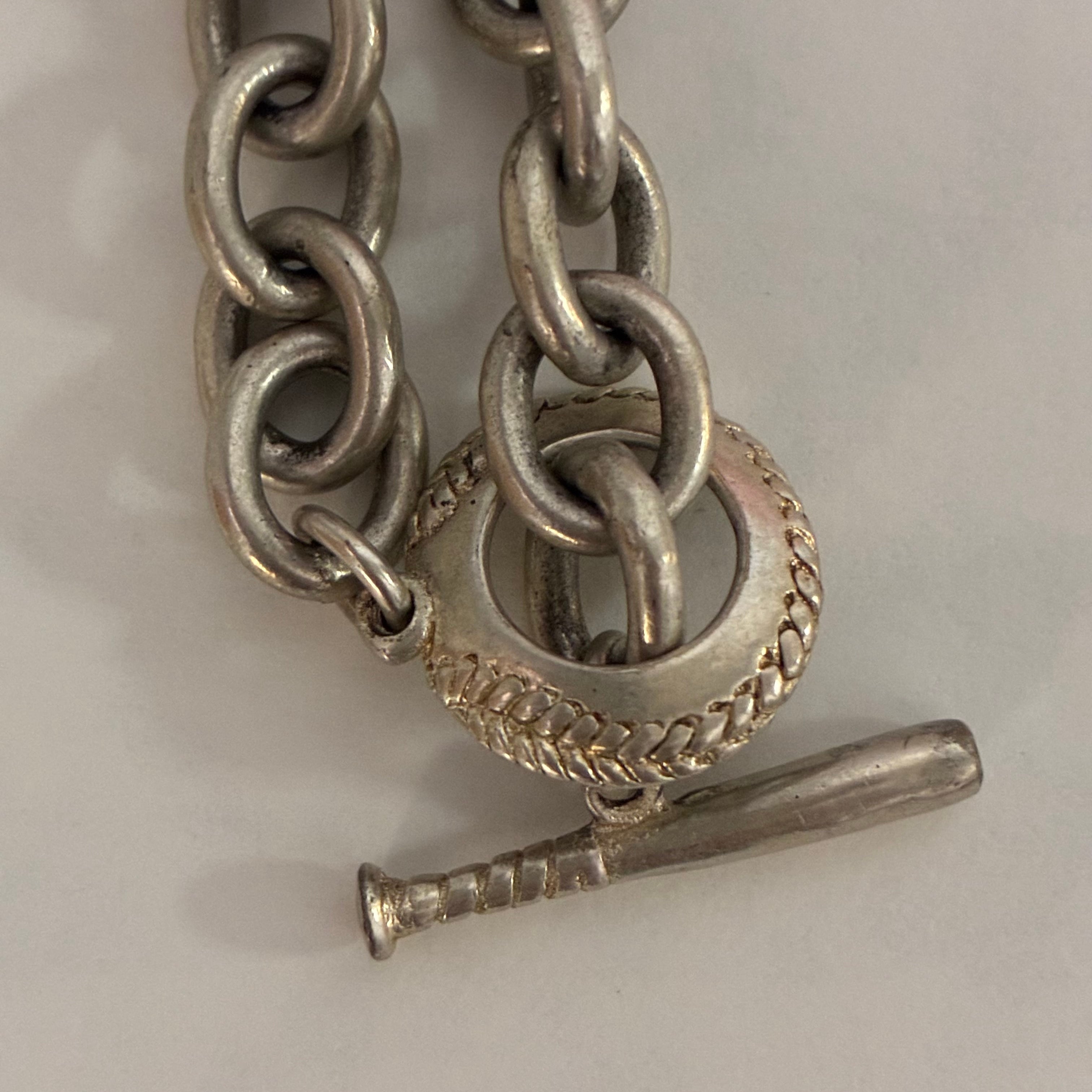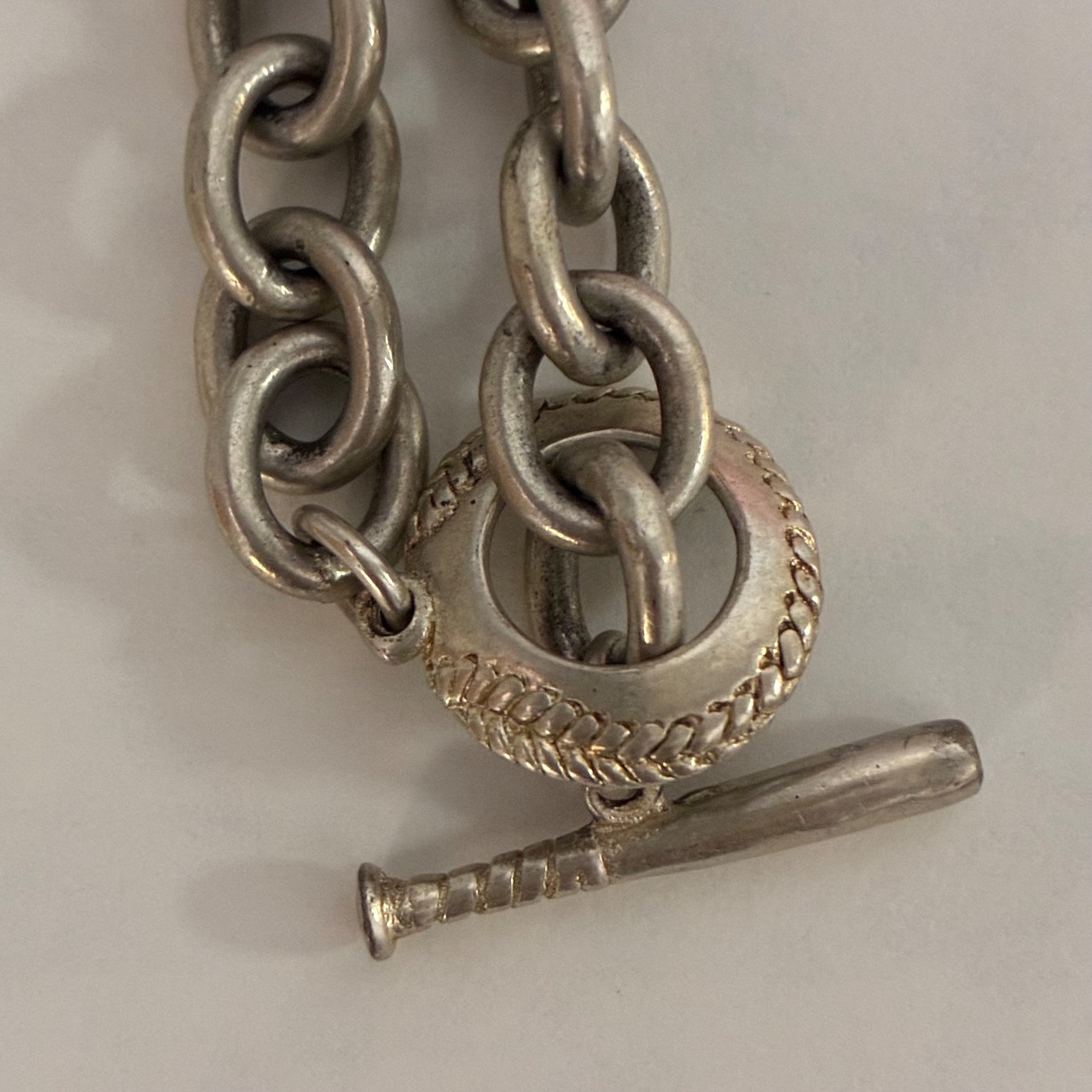 バットとボールの留め具がユニークなヴィンテージシルバーブレスレットです。シンプルですがほどよいボリュームのチェーンで男性にもオススメです♡野球好きの方にも◎