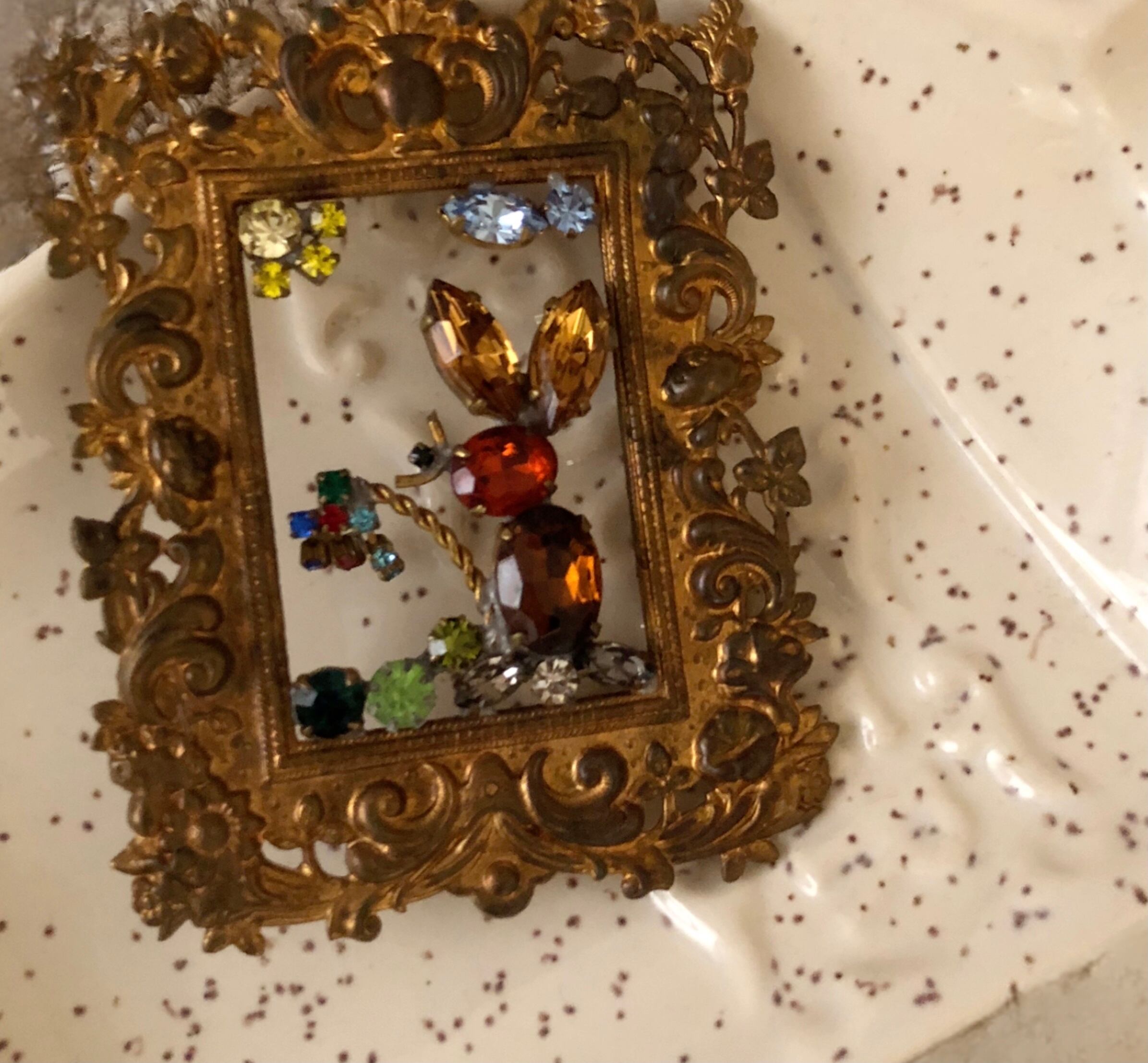 チェコガラスのブローチ。額縁の中にうさぎが佇む、ほのぼのとした絵画の様なブローチです♡大きめなのでコートやストール、バッグなどにも合いそうです◎