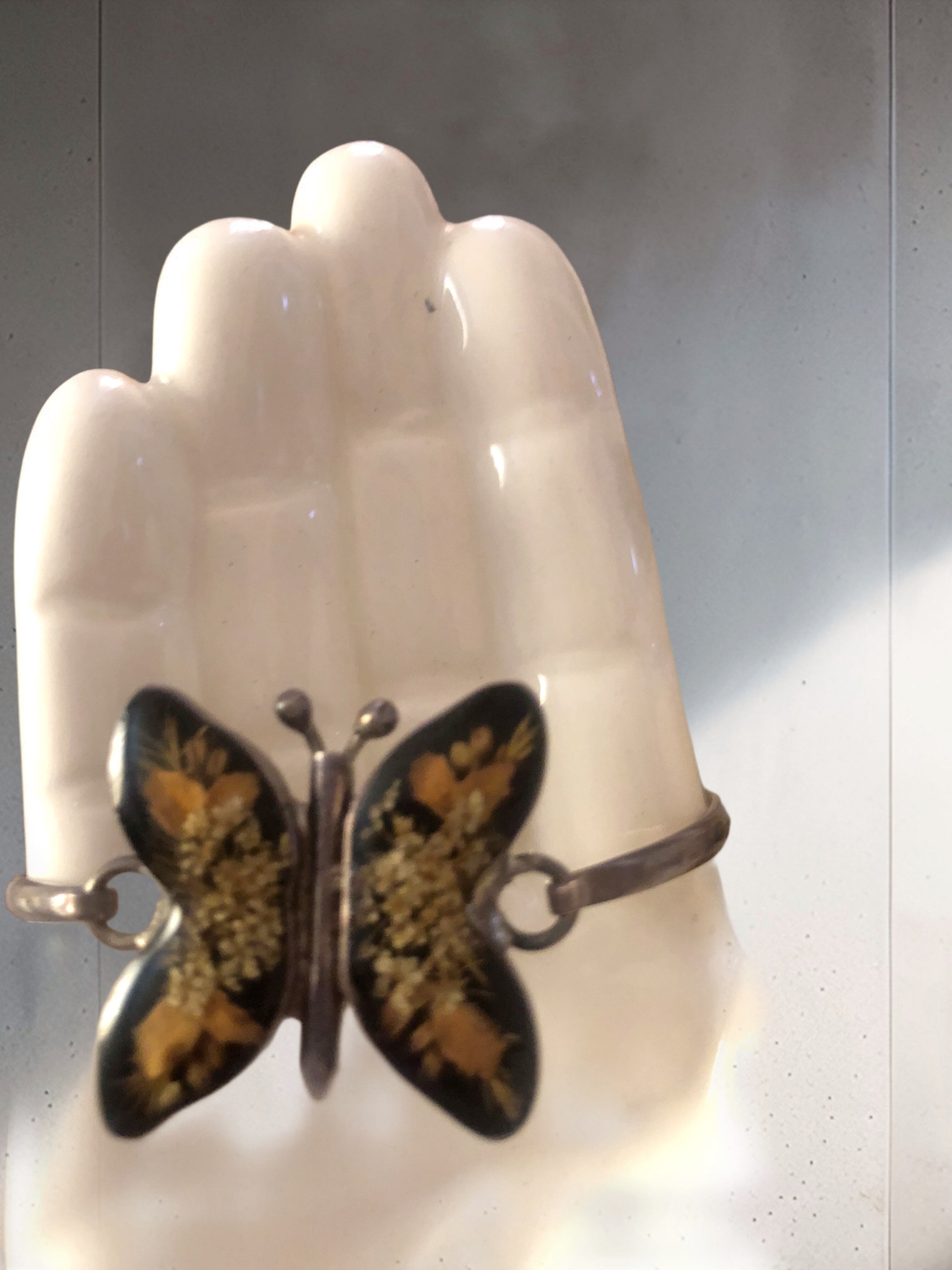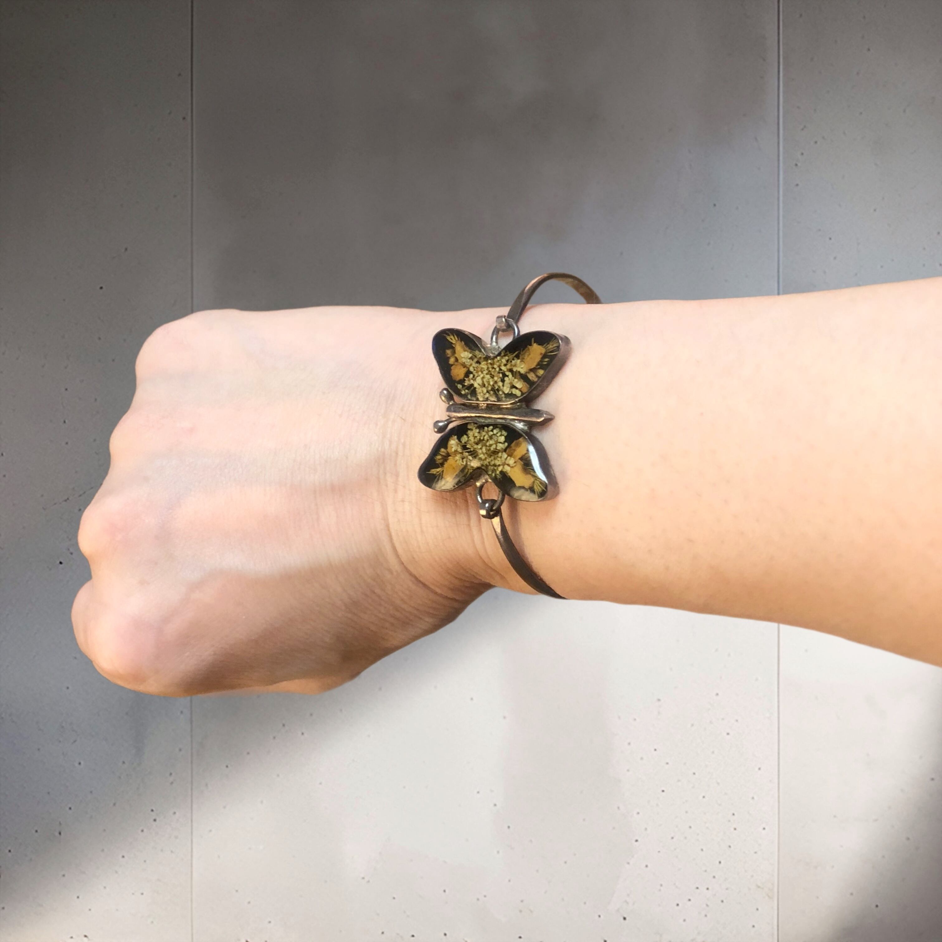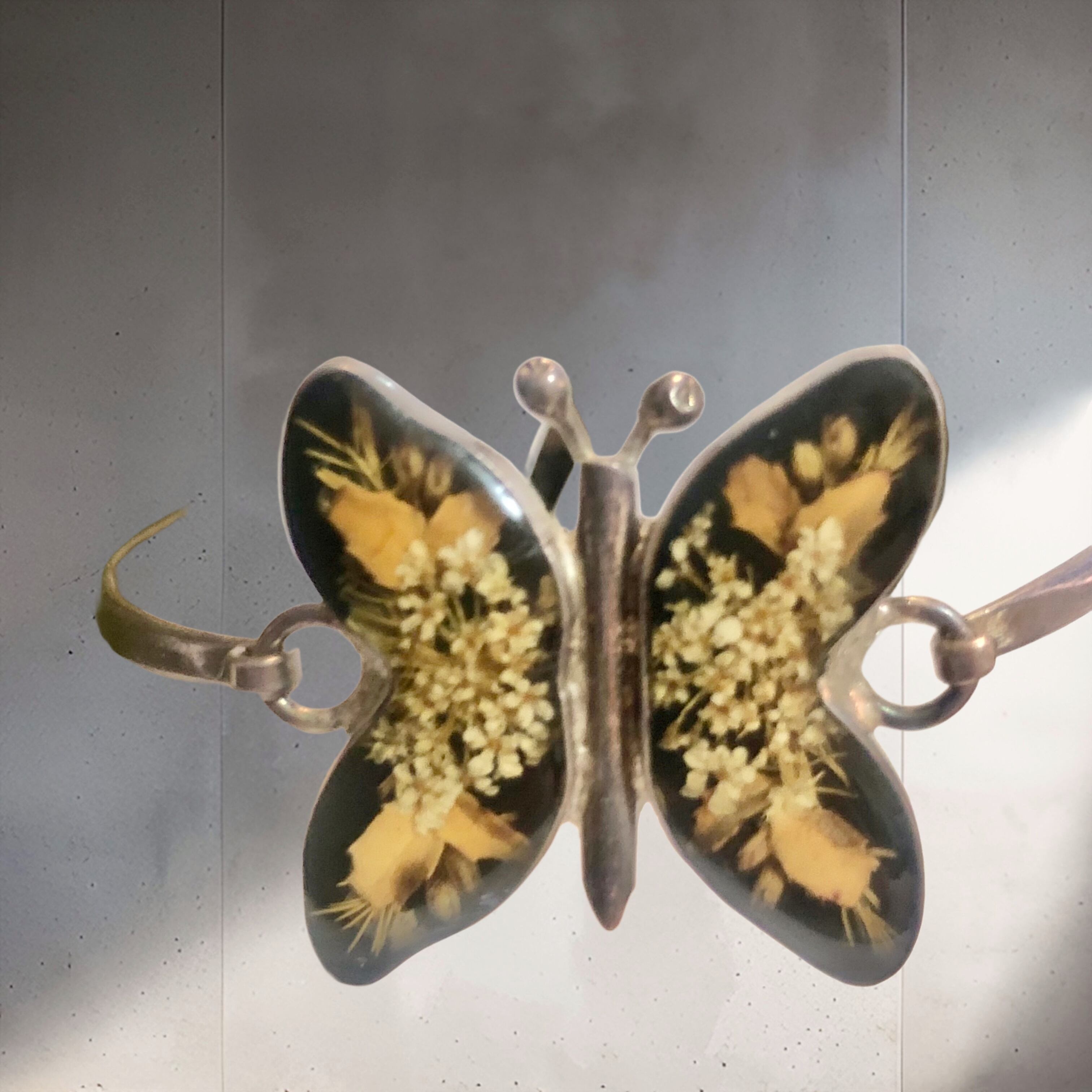 蝶々の中のドライフラワーが可憐なメキシカンシルバー製のバングル。黒にドライフラワーが映えとても美しく、眺めているだけで幸せな気分になります♡華奢なシルバーでモチーフがより引き立つ女性らしいデザインです◎