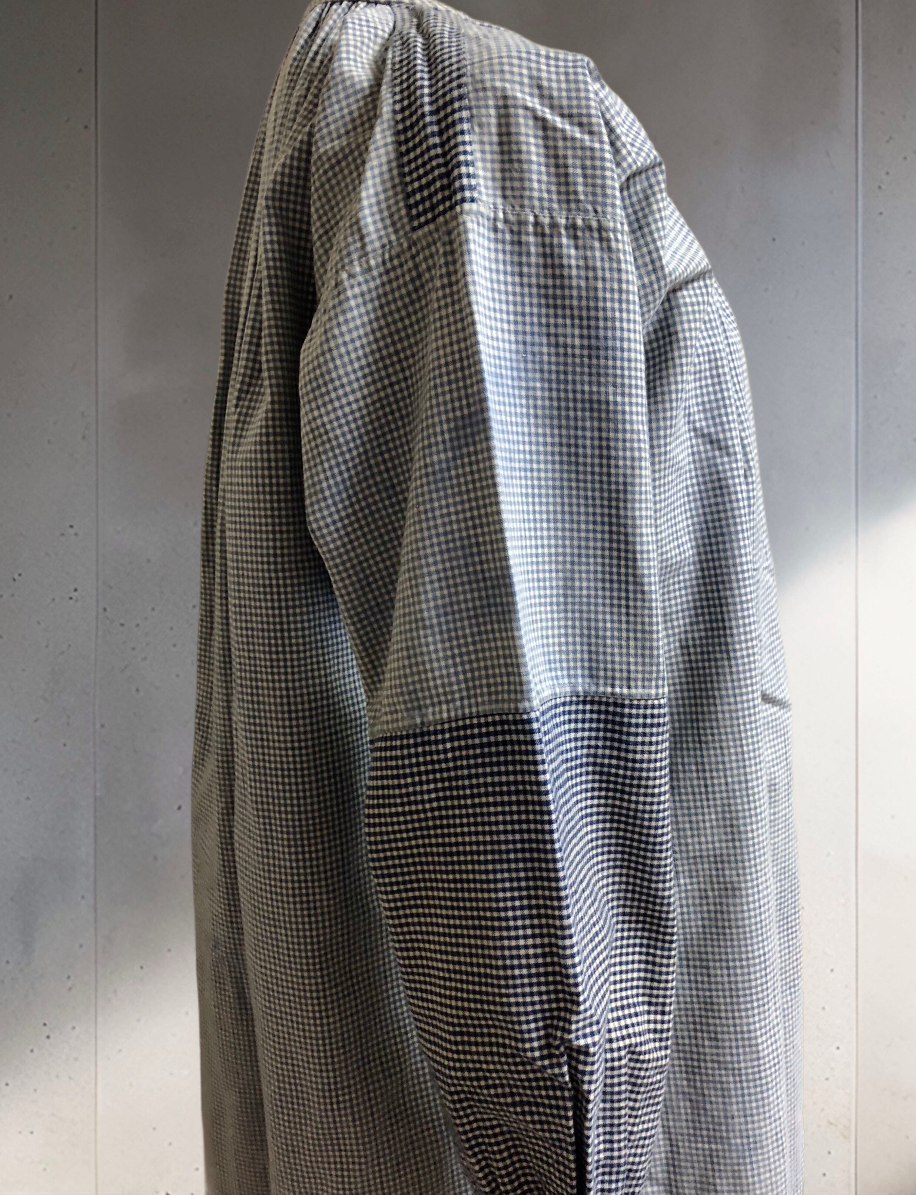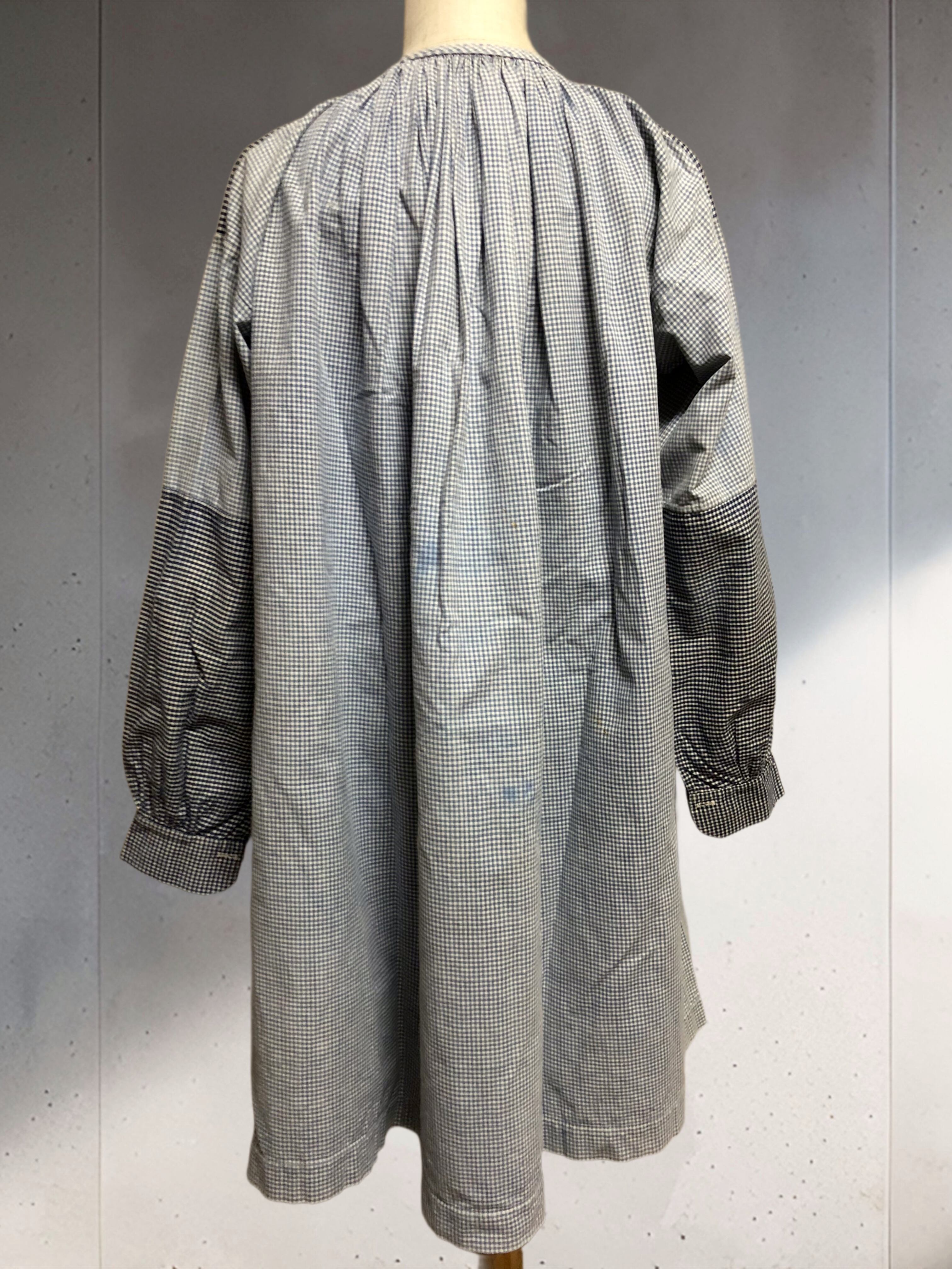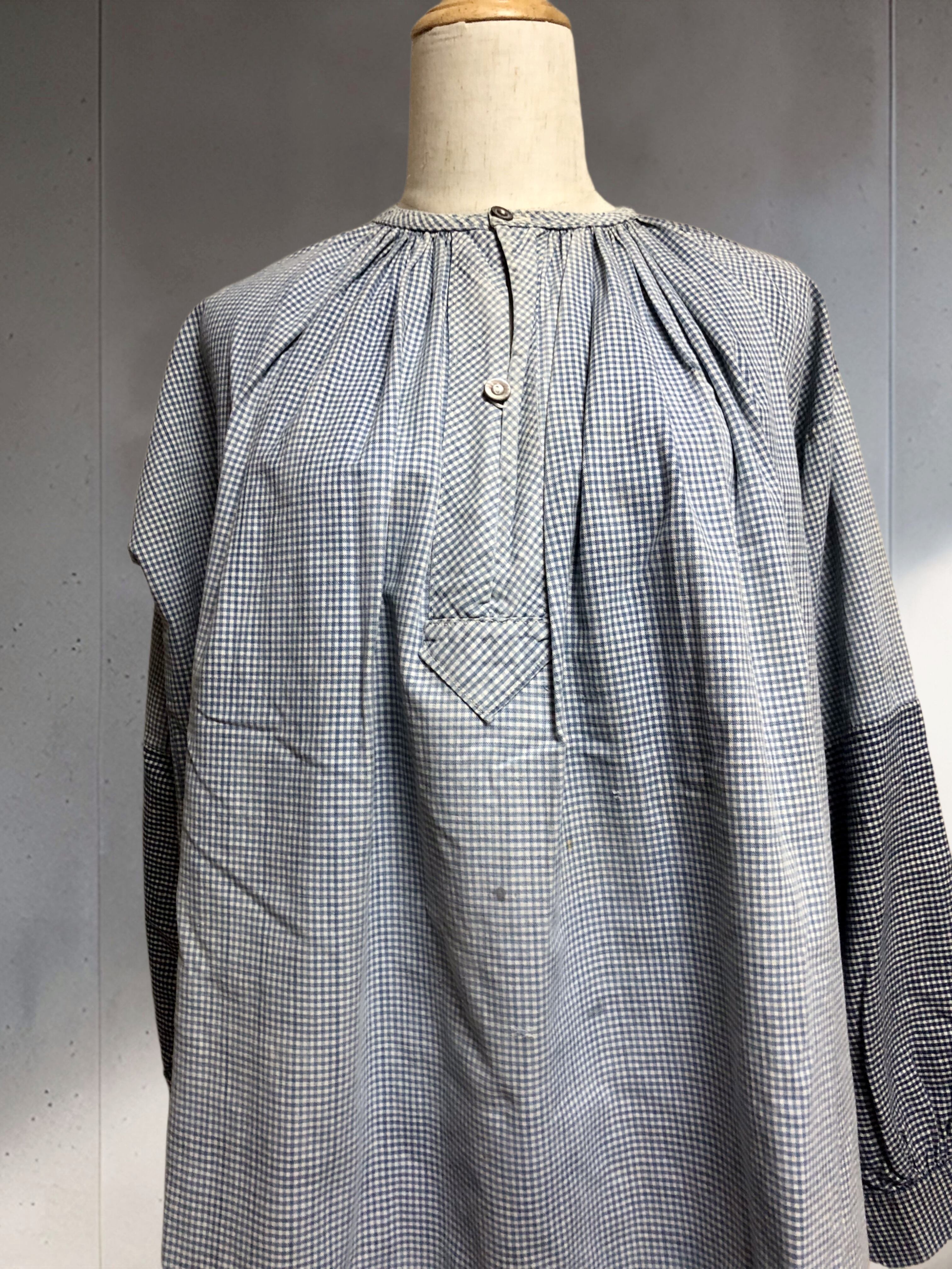 フレンチヴィンテージ、1940〜50年代のスモック。しっかりしたコットン地でふんわりとし、肩と肘から下がネイビーのチェックに切り替えられいるのがポイントになっています◎ロングブーツに合わせてミニワンピースとして合わせても可愛いと思います♡