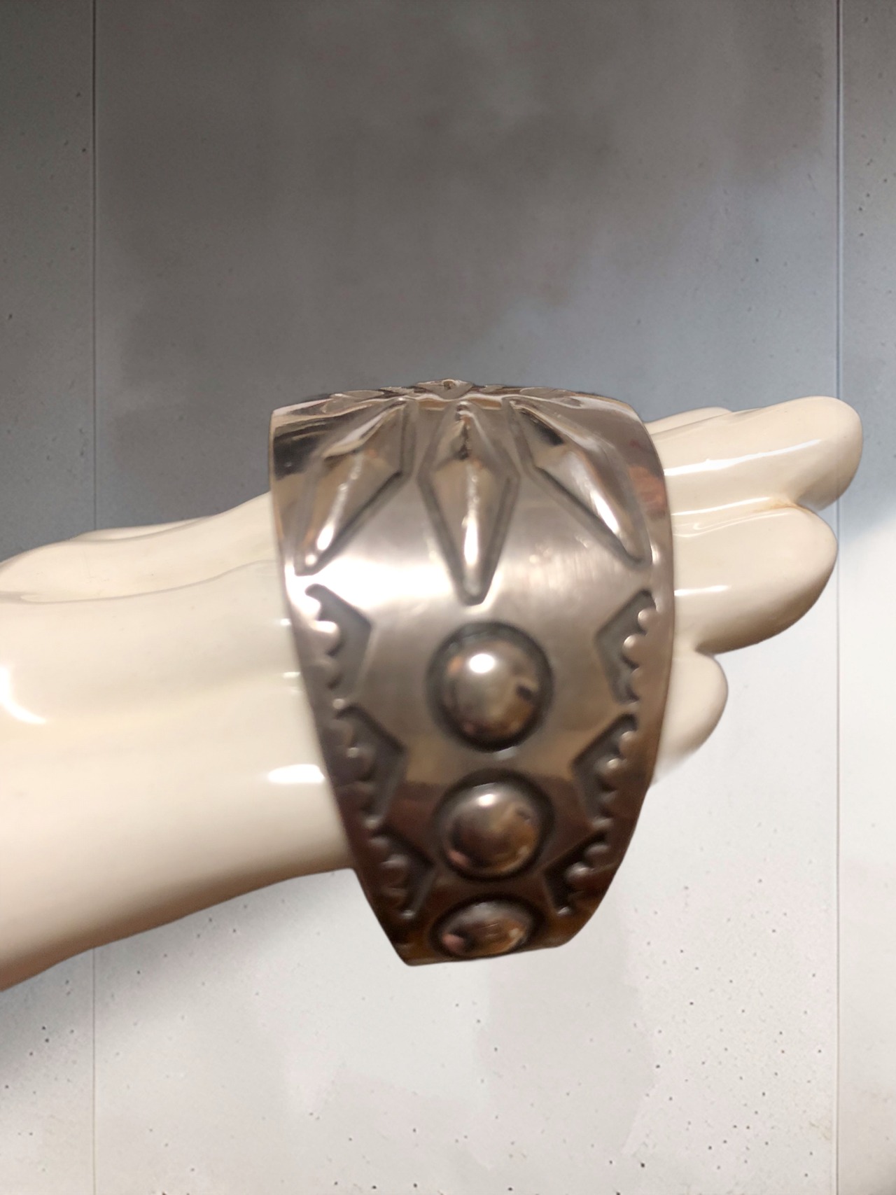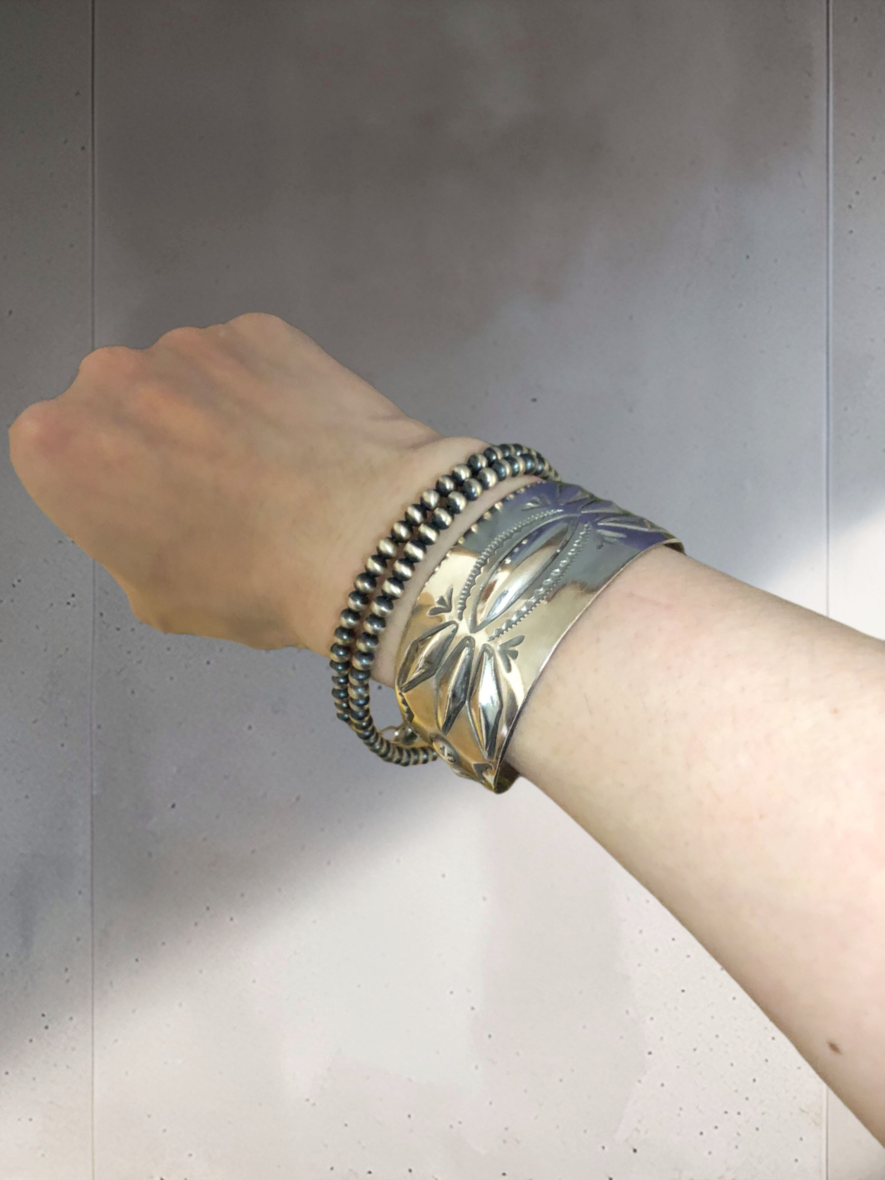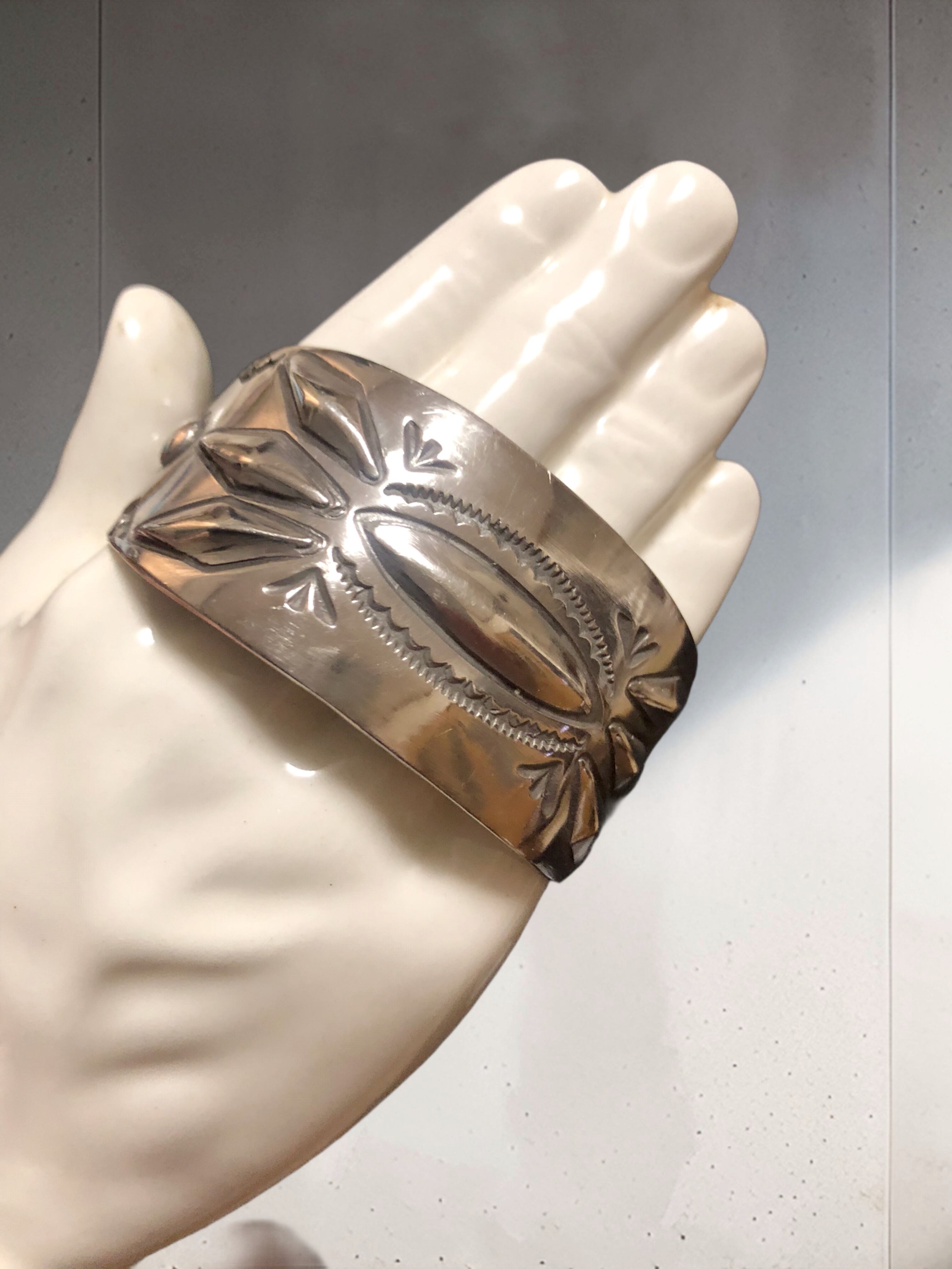 1970年代、ナバホのシルバーバングル。シンプルですが大ぶりなスタンプワークが渋くてカッコ良いです◎厚みはそこまで無く、程よいボリュームで着けやすいバングルです♡