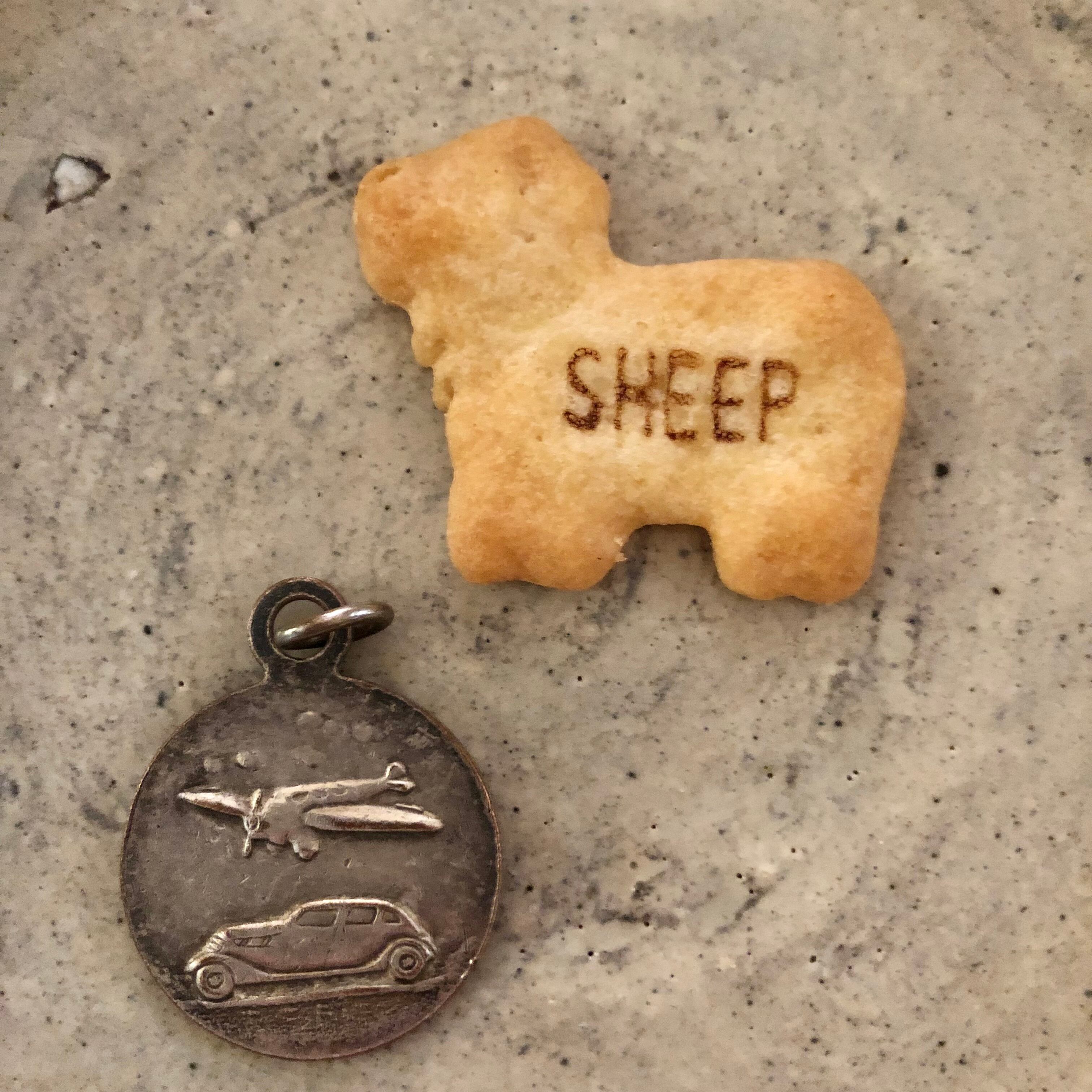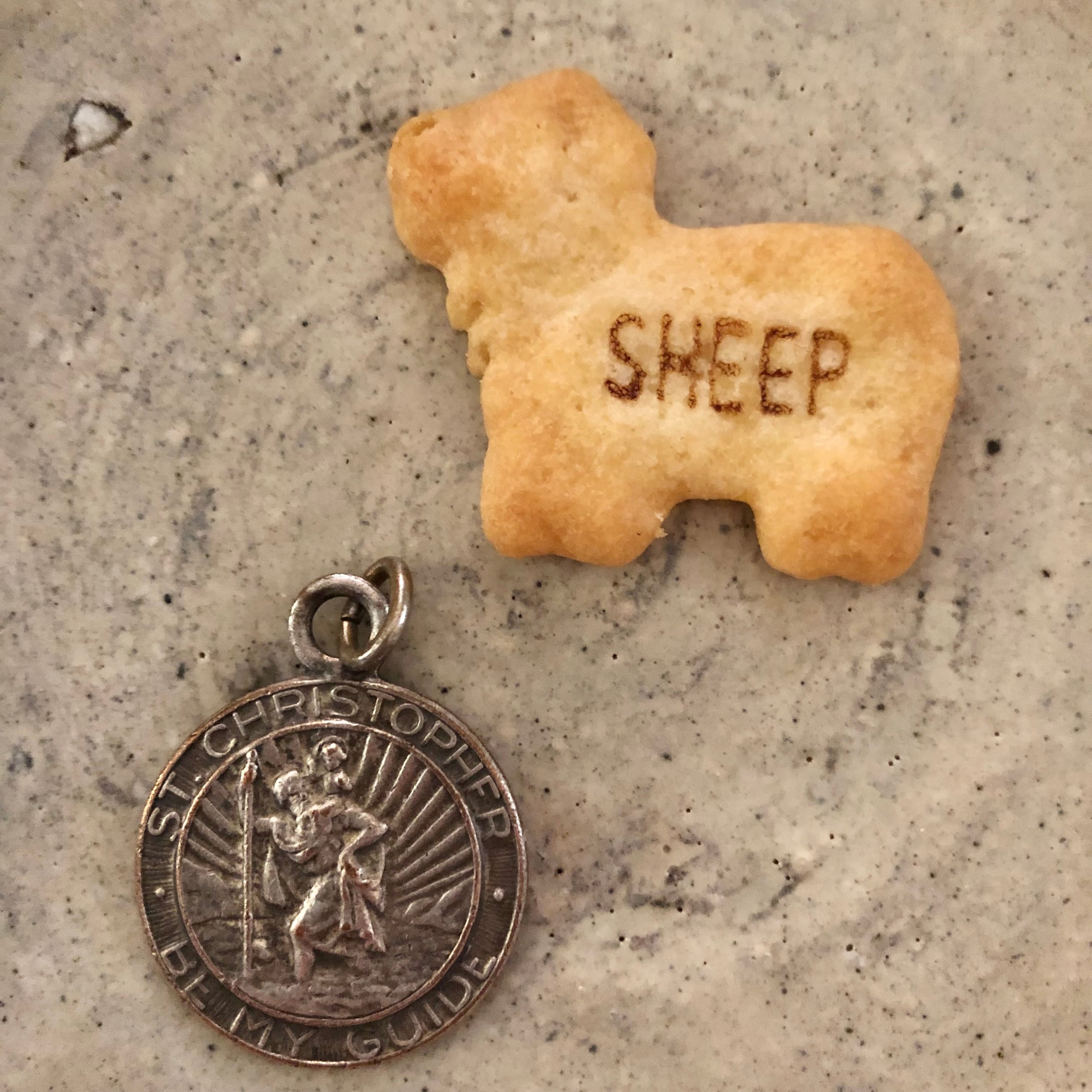 ST CHRISTOPERに裏面が車と飛行機の古そうなメタル製チャームトップ。