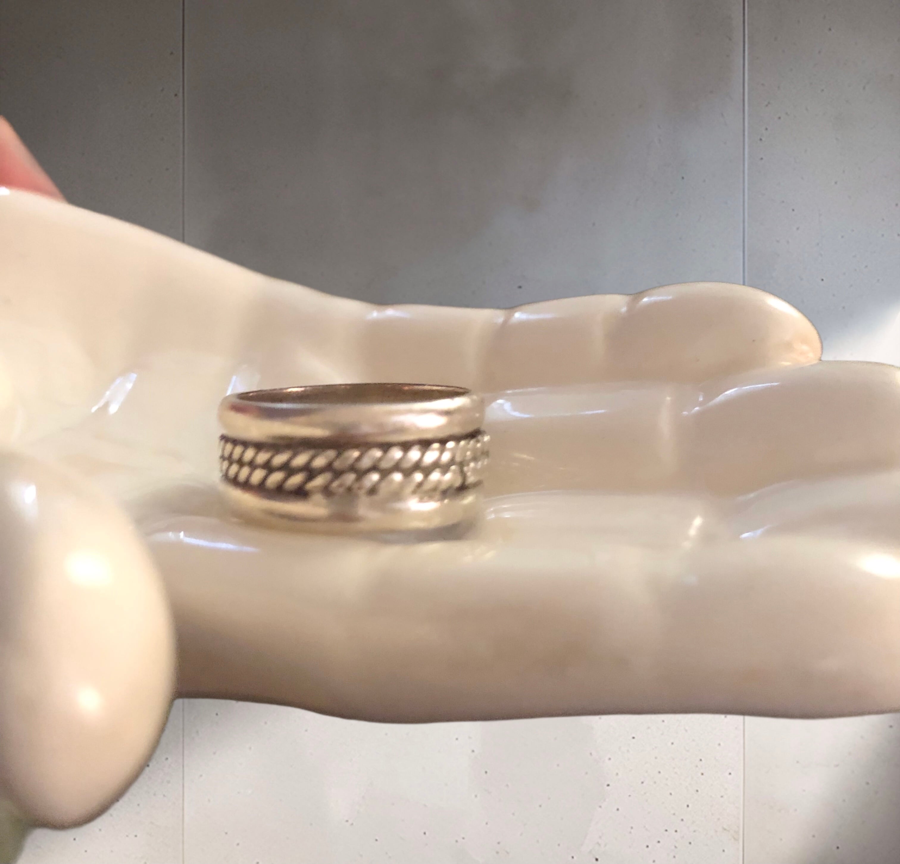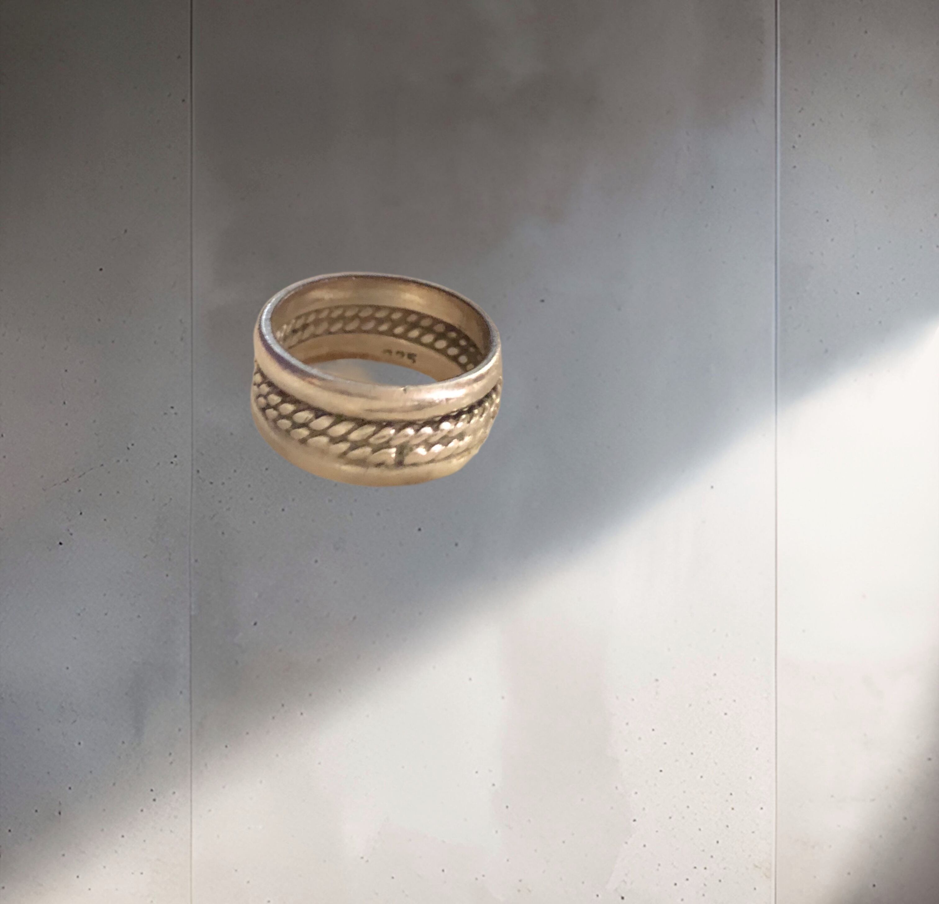 ヴィンテージシルバーのリング。縄編みの模様が入ったシンプルなデザインです。程よいボリューム感でインディアンジュエリーとも相性が良さそうです♡気兼ねなく普段使いできるおすすめのリングです◎