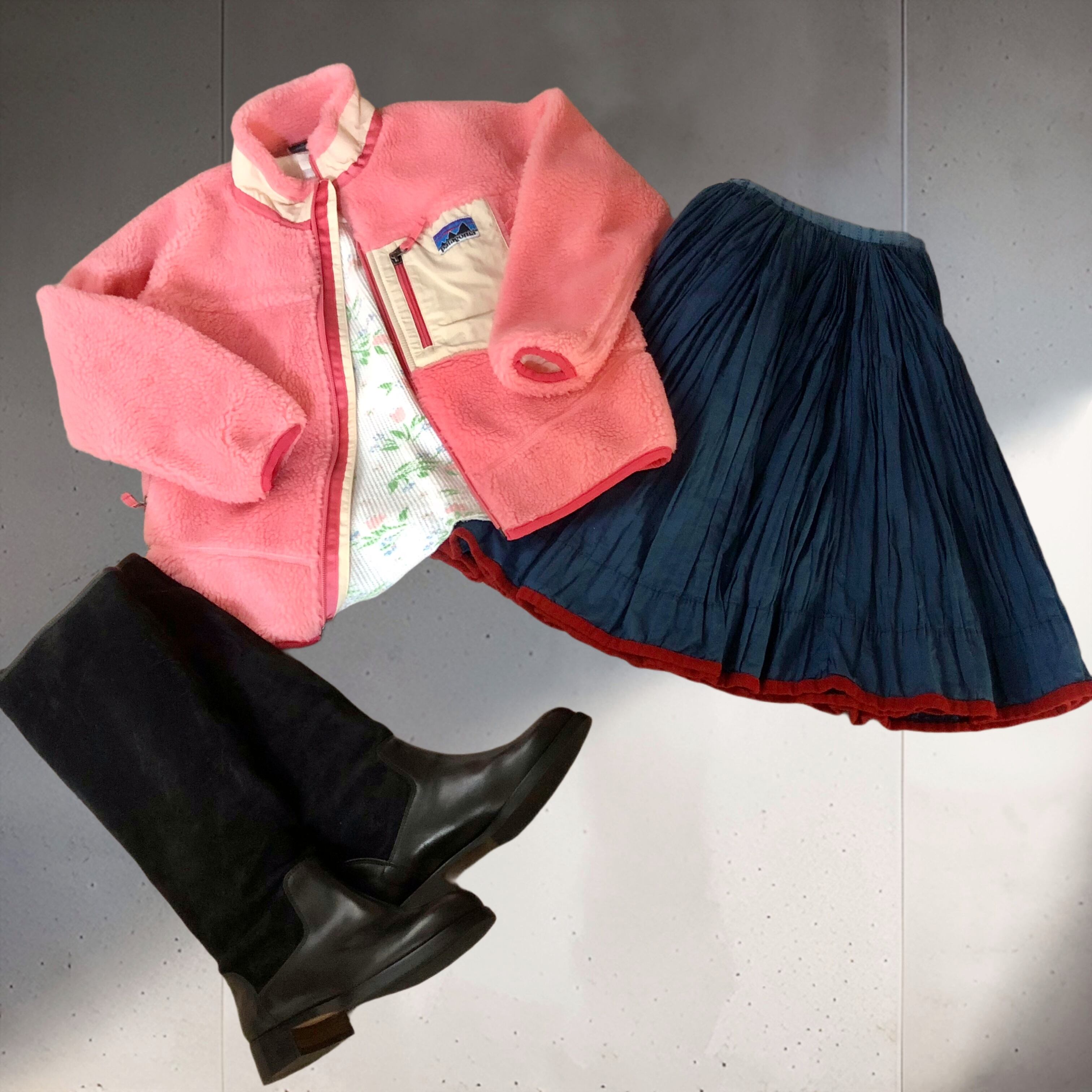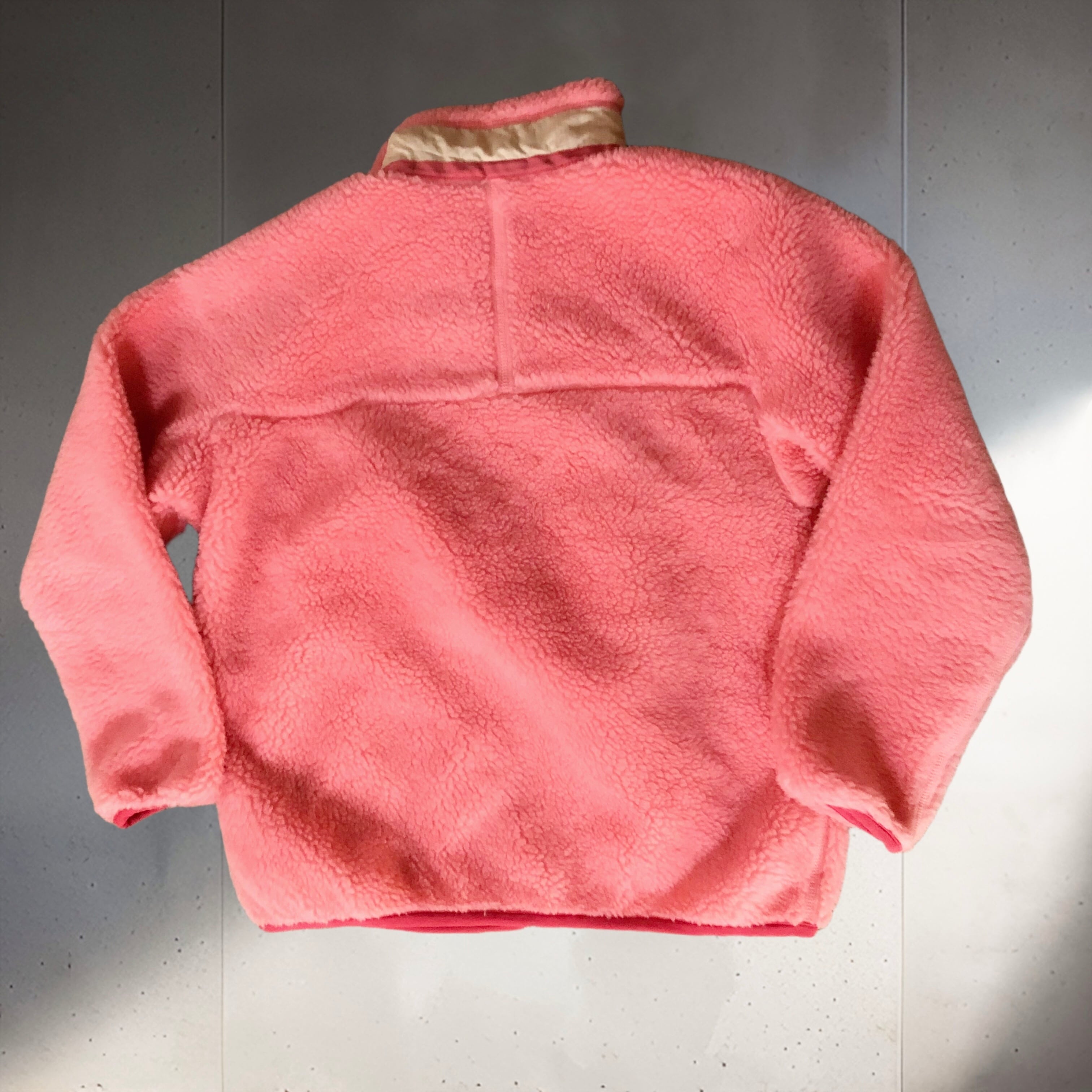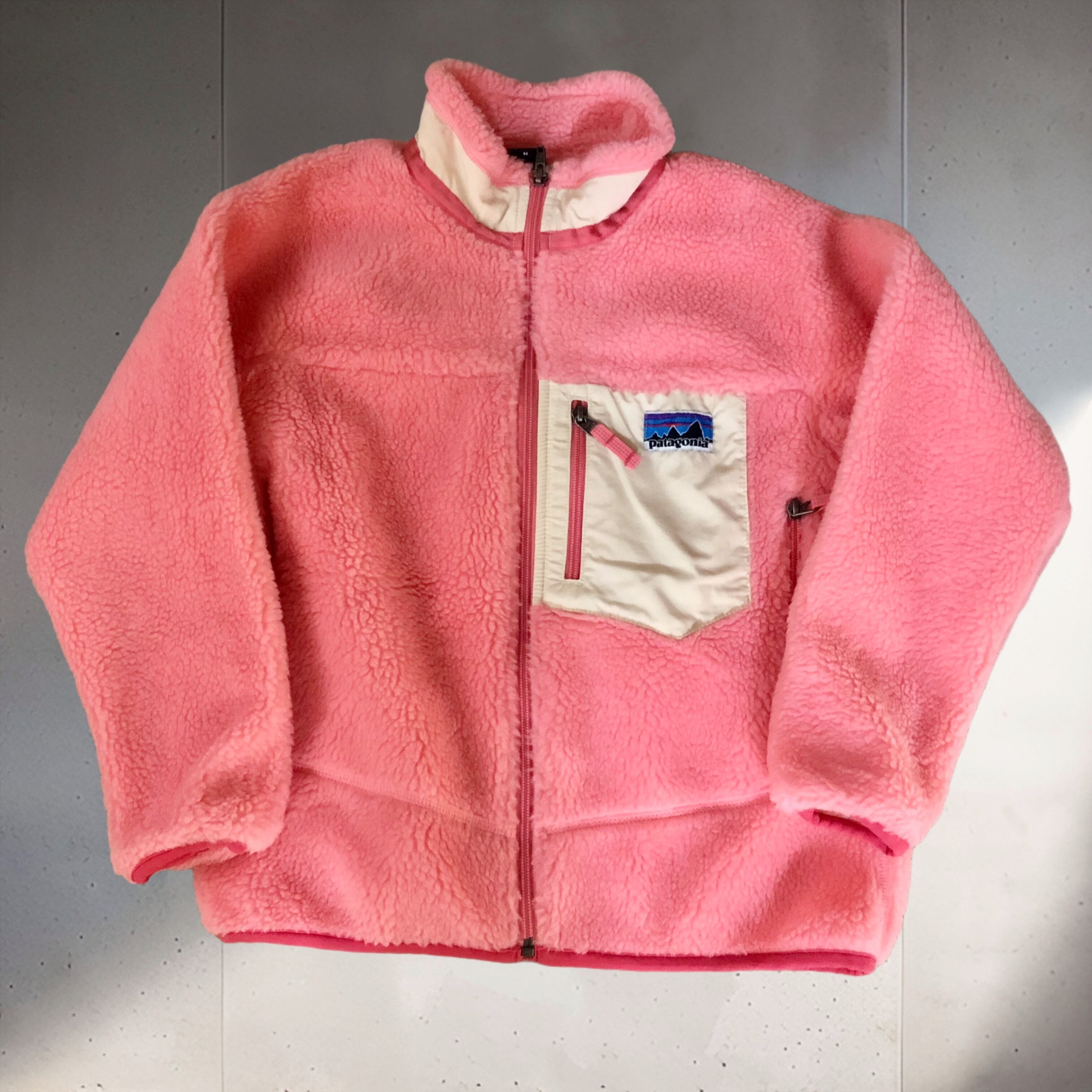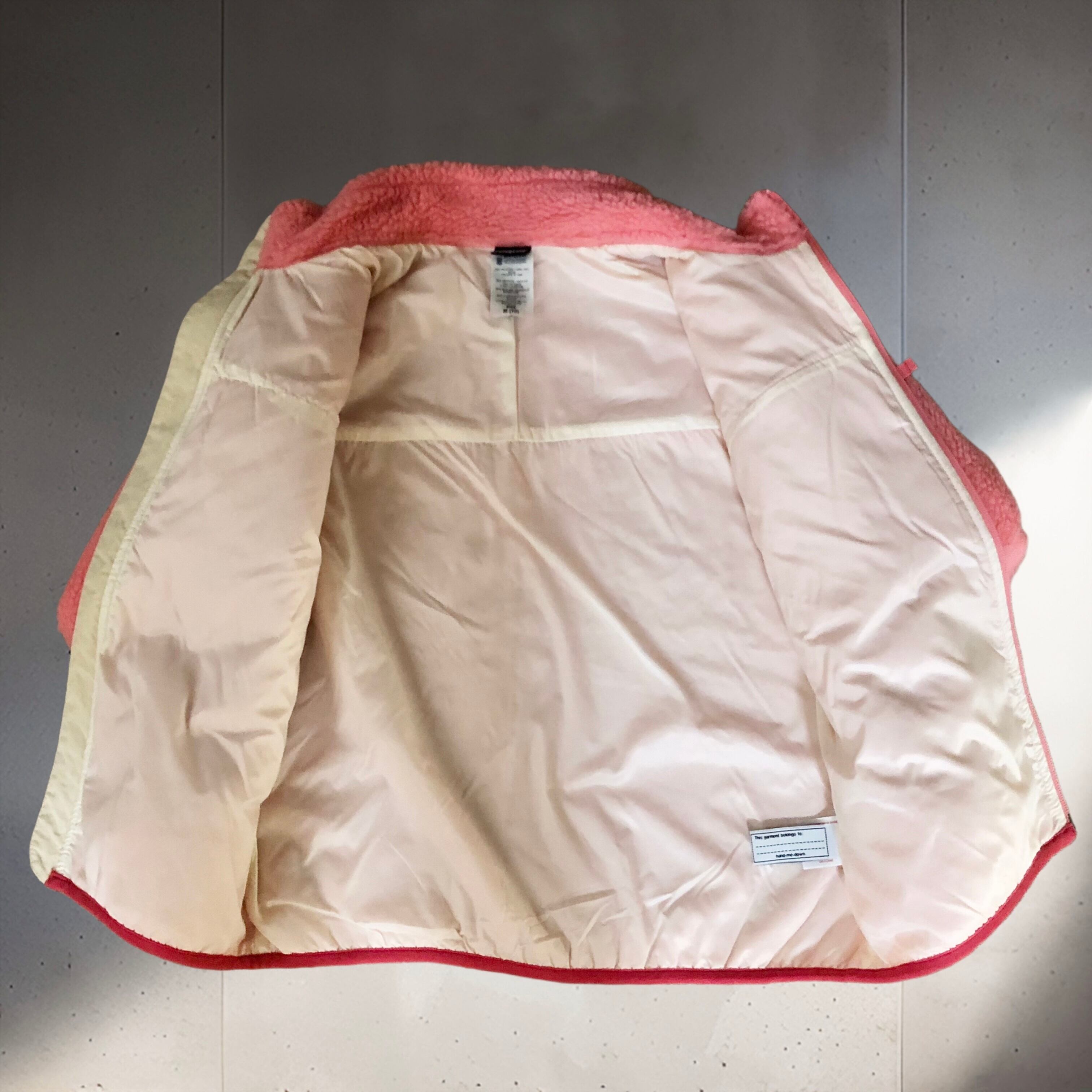 2000年代パタゴニアのレトロXフリースジャケット。あまり見かけないピンクとふわふわのフリースが良く合い可愛いです♡コンパクトに着られるキッズサイズはラフになり過ぎずスカートやワンピーススタイルにおすすめです◎