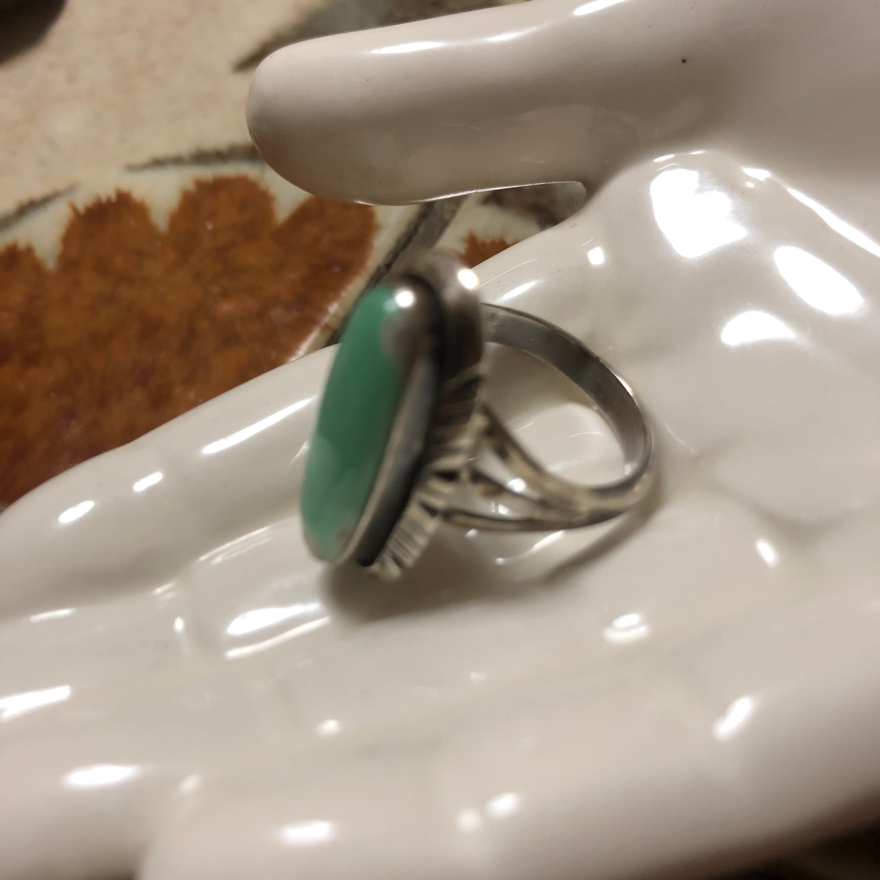 ターコイズのシルバー製リング。少し立体感のあるデザインと縦長にセットされた石が指をキレイに見せてくれます◎淡いブルーがとても良いお色味で、お守りがわりに着けたくなるリングです♡
