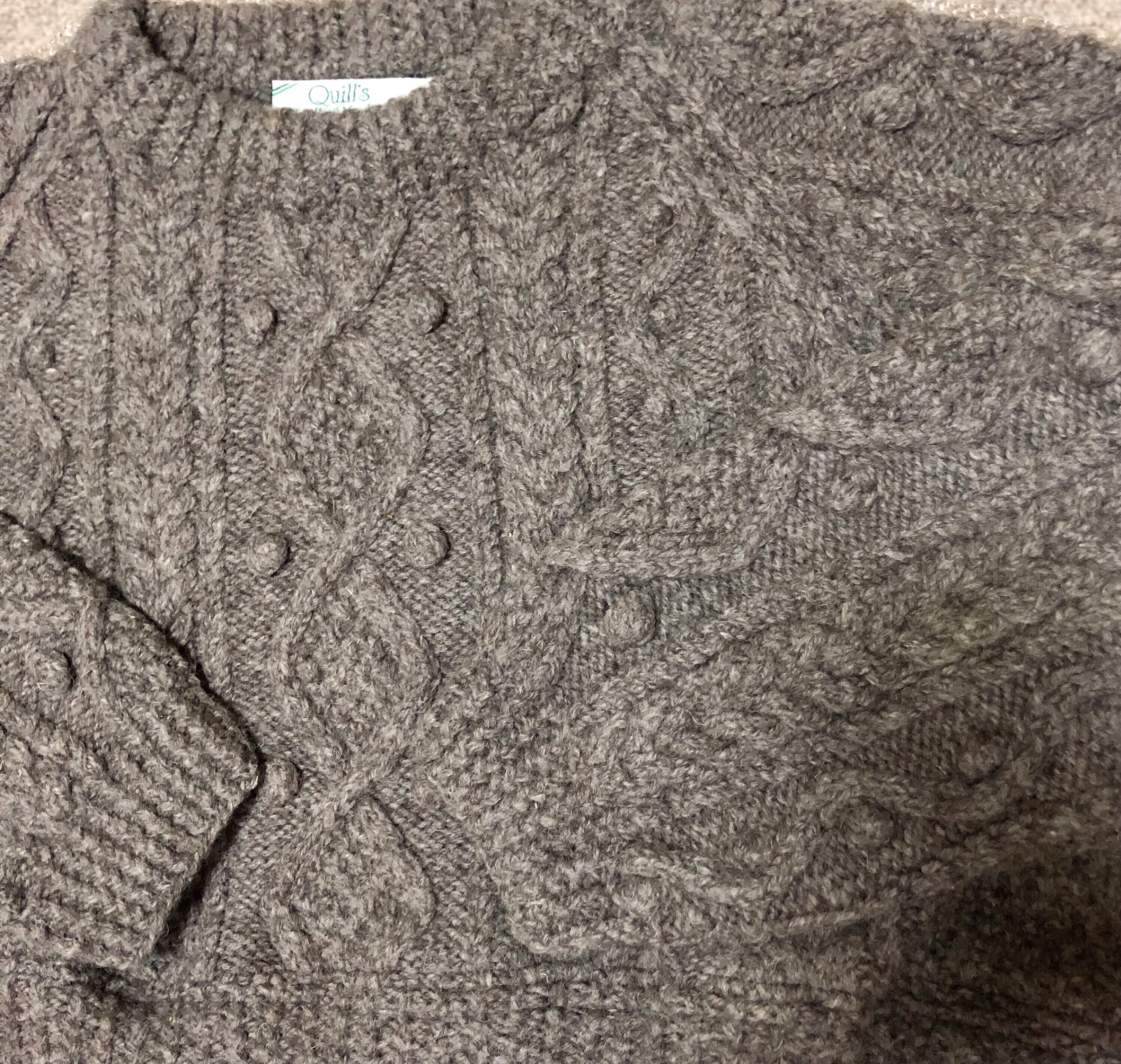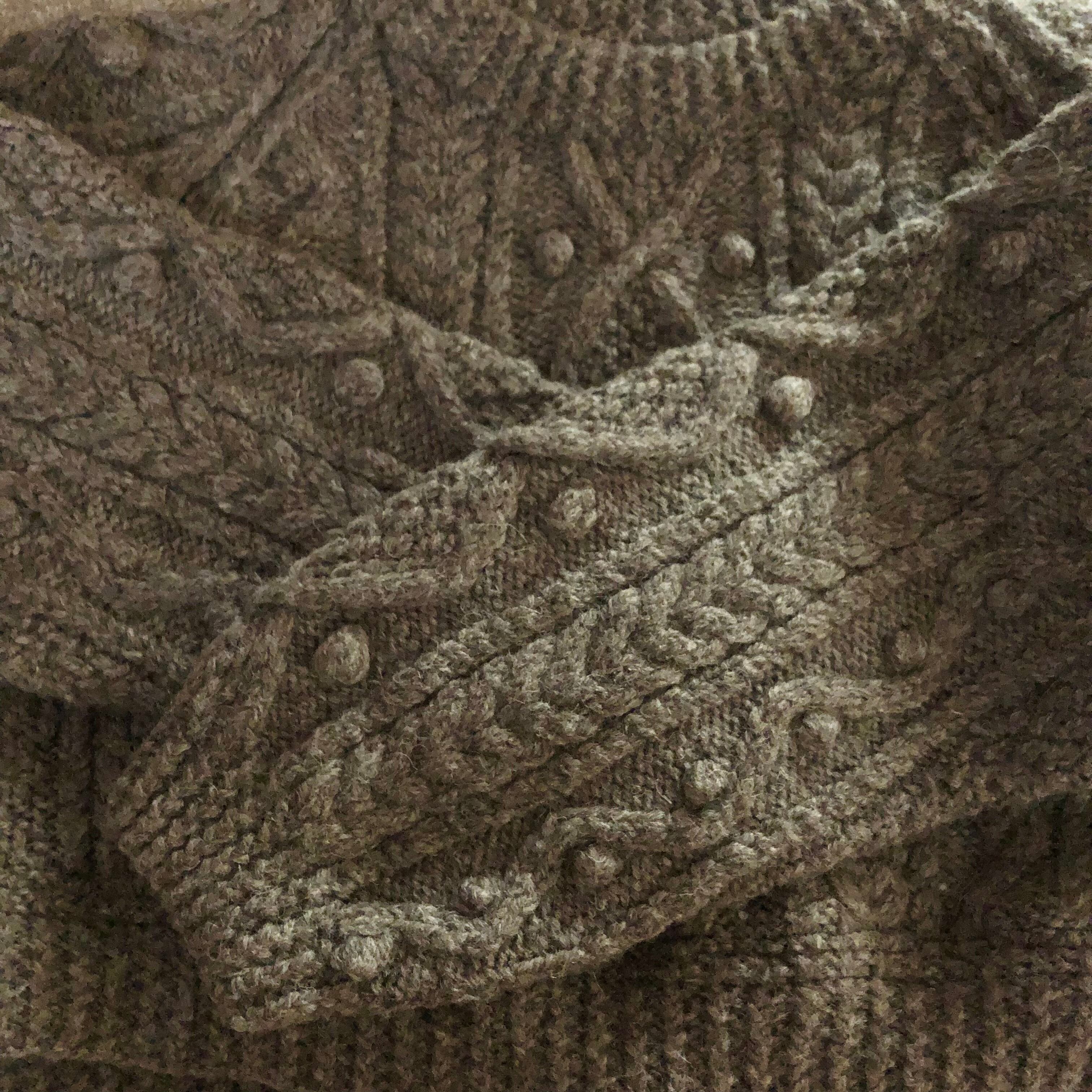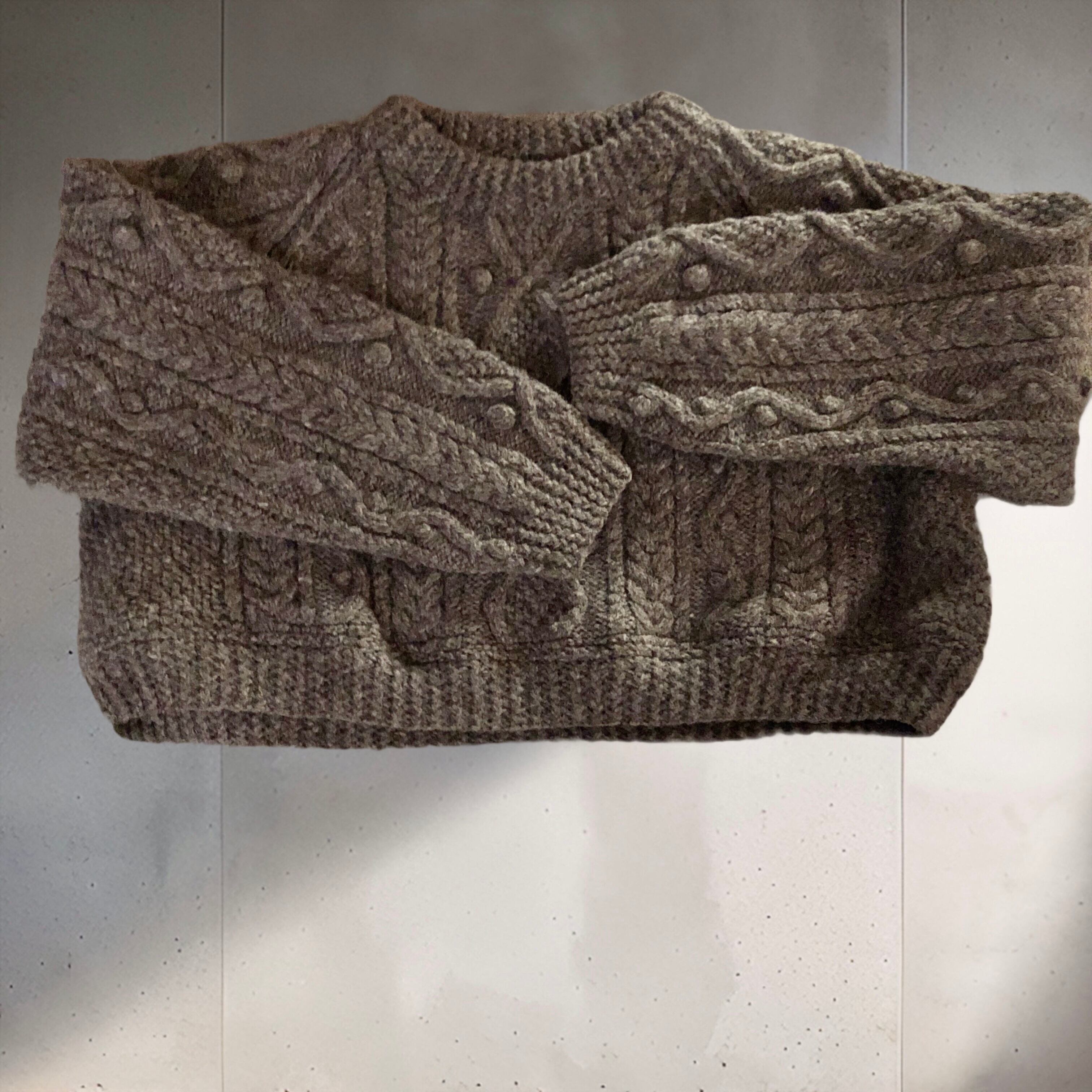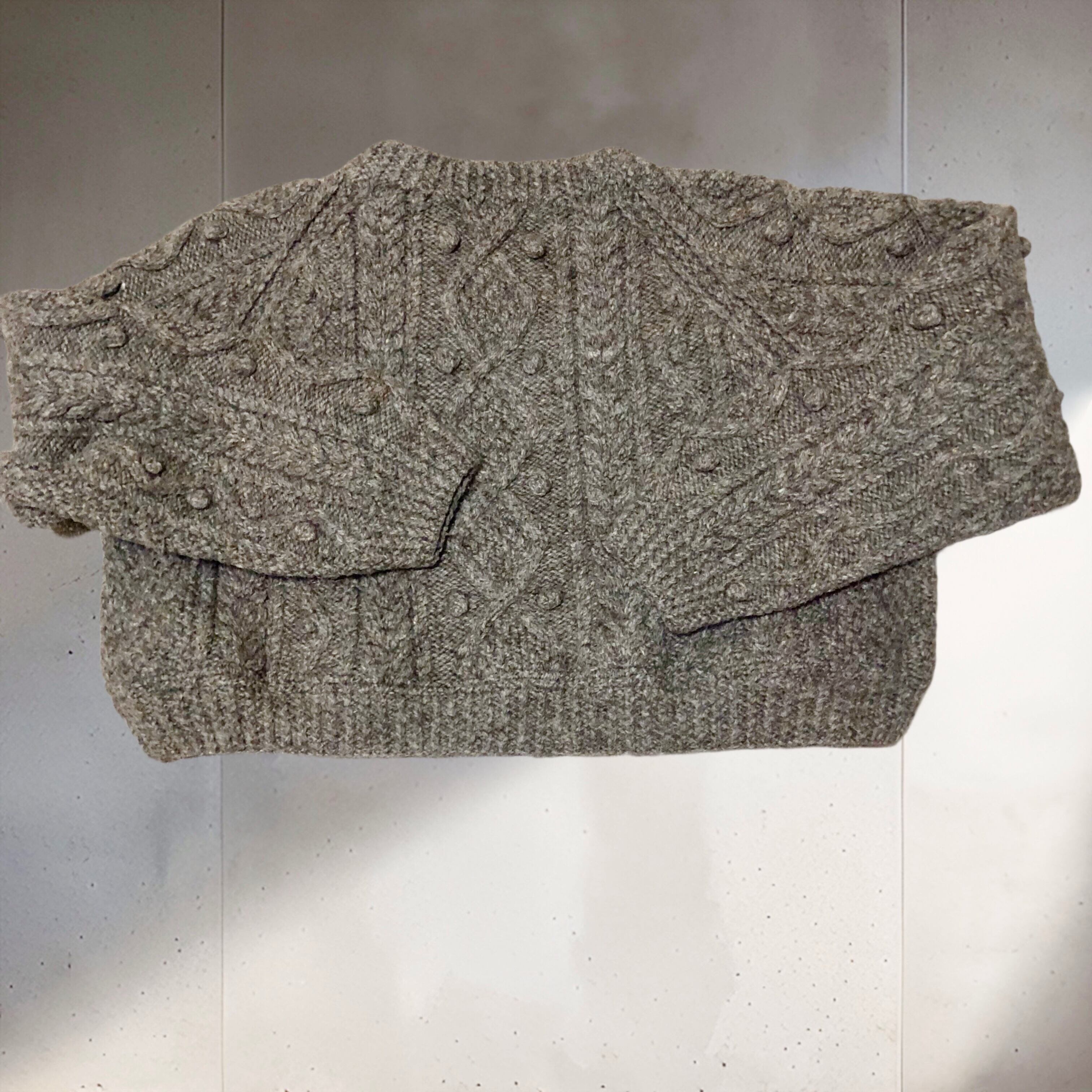 ポンポンがたくさん付いたヴィンテージニット。落ち着いたブラウンカラーで甘くなりすぎず、身幅たっぷりでショート丈にリメイクされているのでバランスも取りやすく、いろいろコーディネートに使えそうです♡