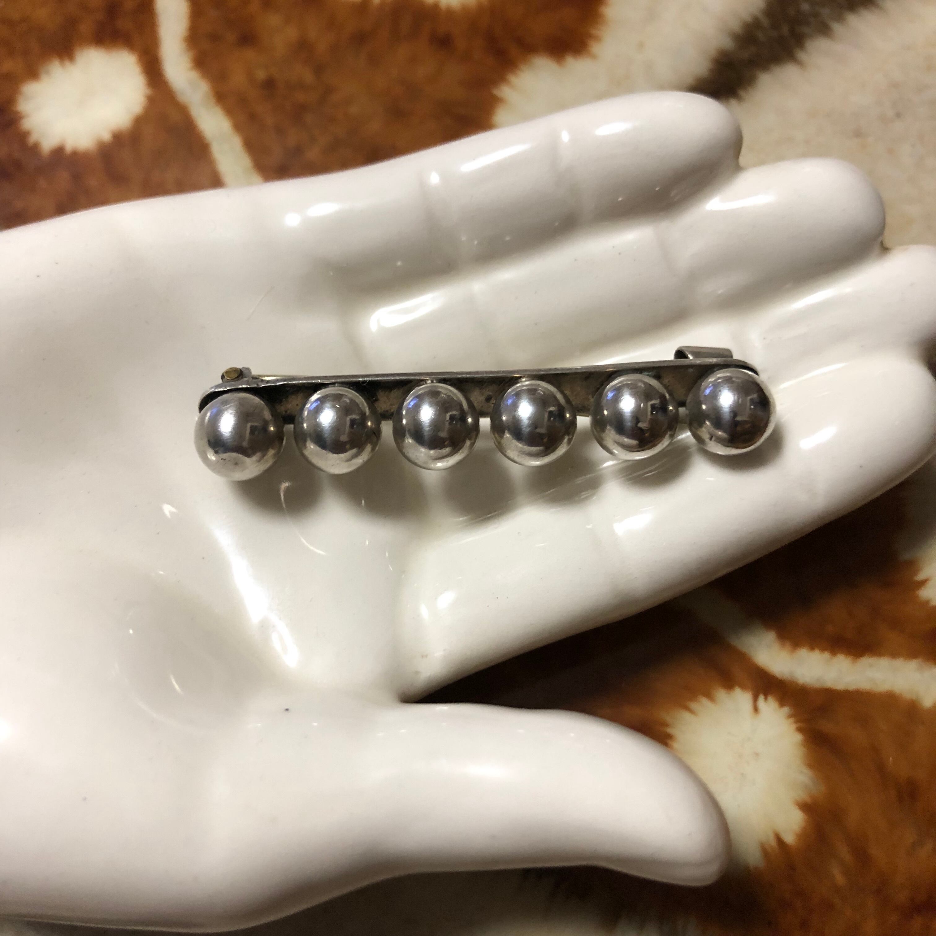 6個のボールが連なったブローチ。サイズも程よく、縦、横、斜めと付け方で雰囲気が変わりそうでモードからインディアンジュエリーまで幅広く合わせられそうです♡付けてない状態ですと留め金が緩いですが付けるとしっかり留まります。