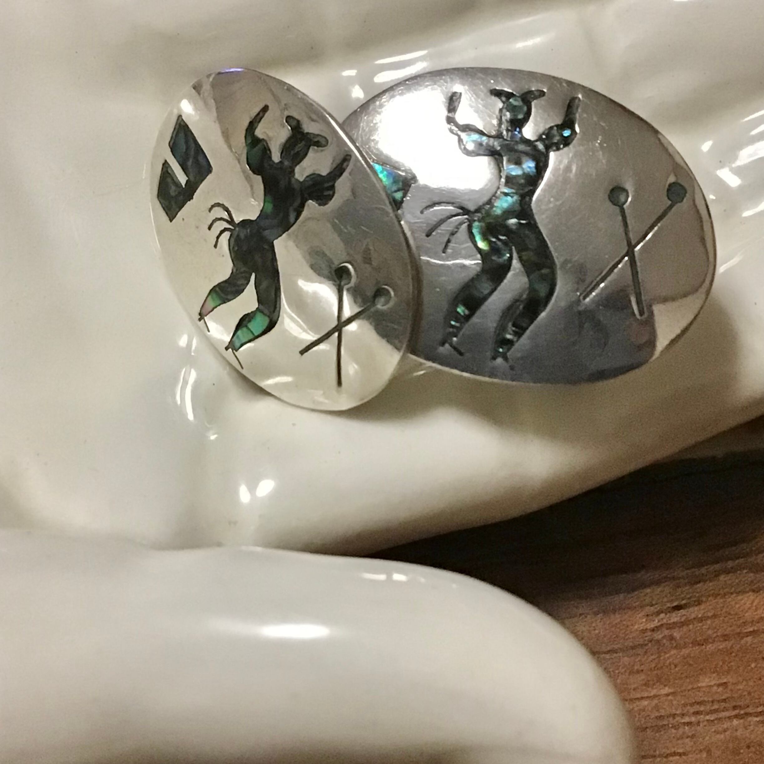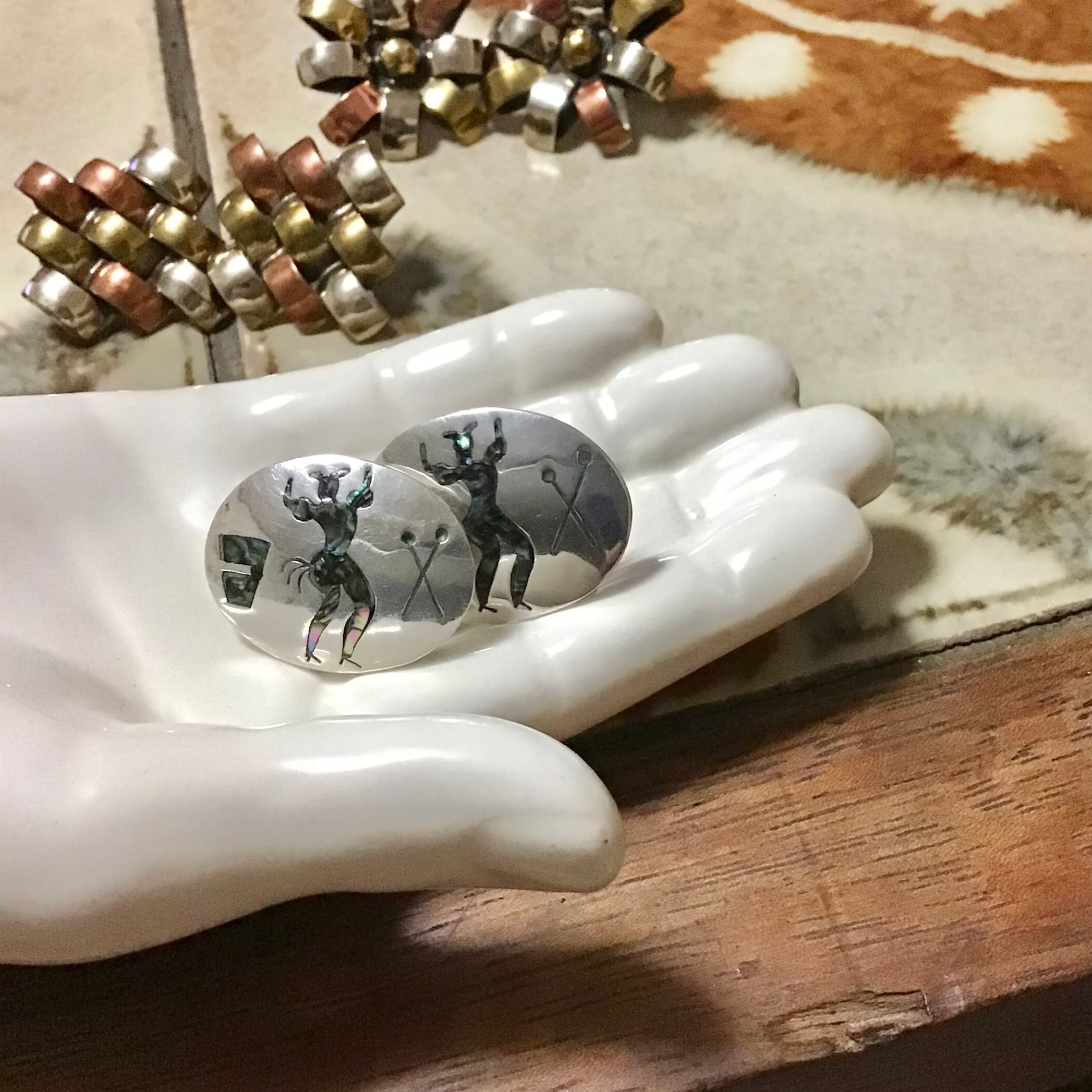 踊っている人がユニークなイヤリング。シルバーにアワビの殻で柄が付けられた職人さんの技術を感じるお品です◎ヴィンテージのスウェットなどに合わせたい店主のお気に入りです♡