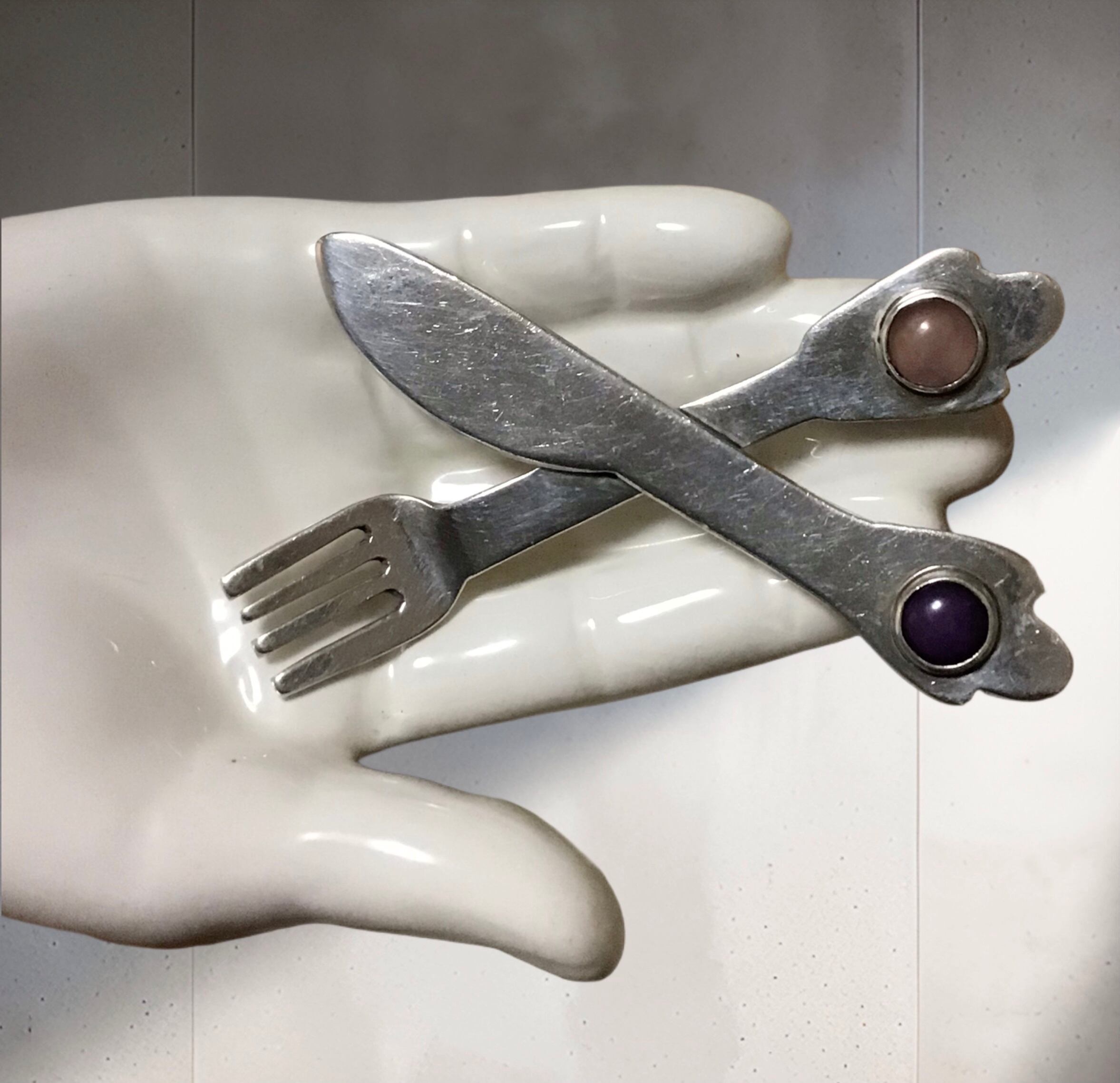 ナイフとフォークをデザインしたシルバーブローチ。あまり見かけないモチーフで、それぞれにローズクォーツとアメジストがセットされ良いアクセントになっています◎お気に入りのレストランに行く時に付けて行きたいブローチです♡