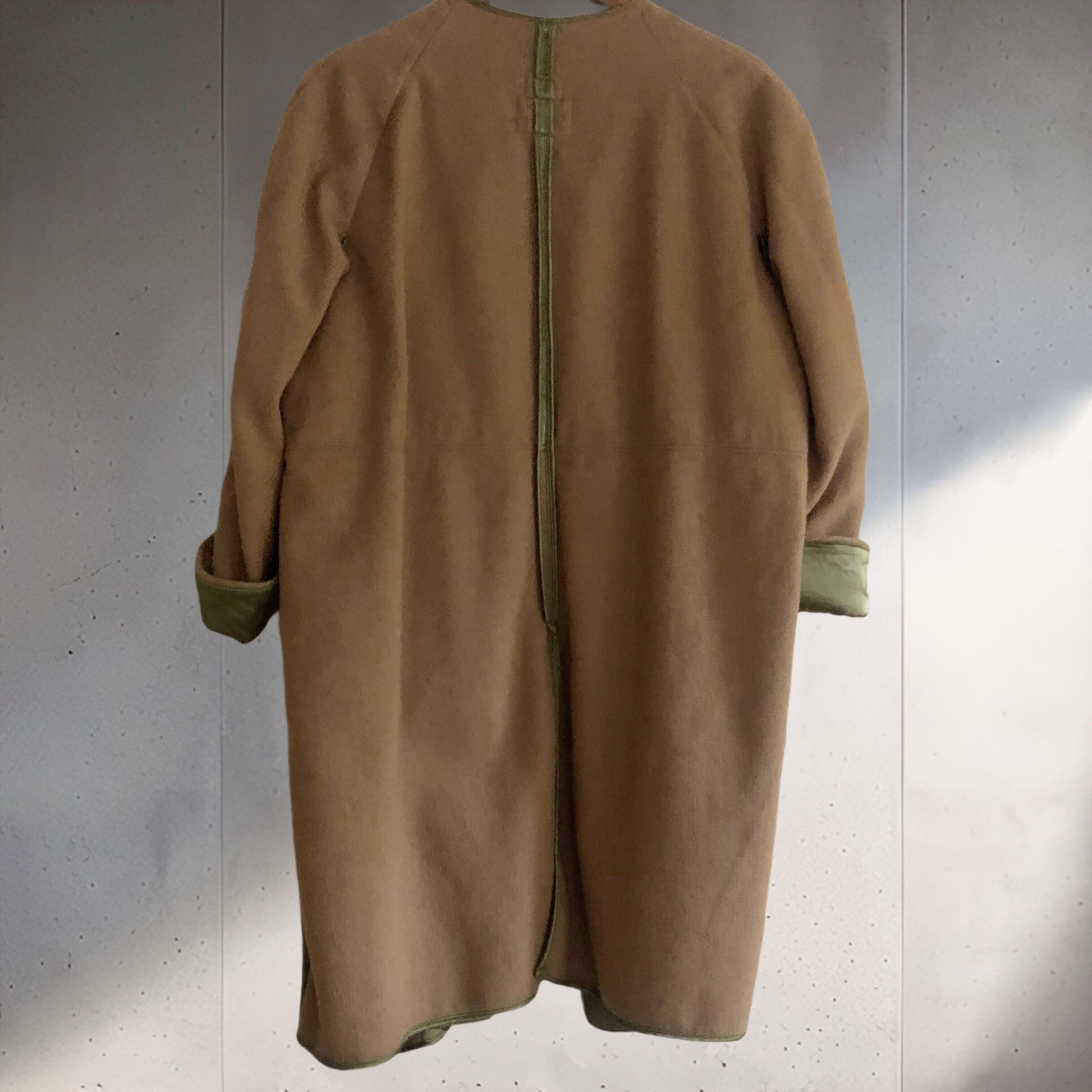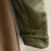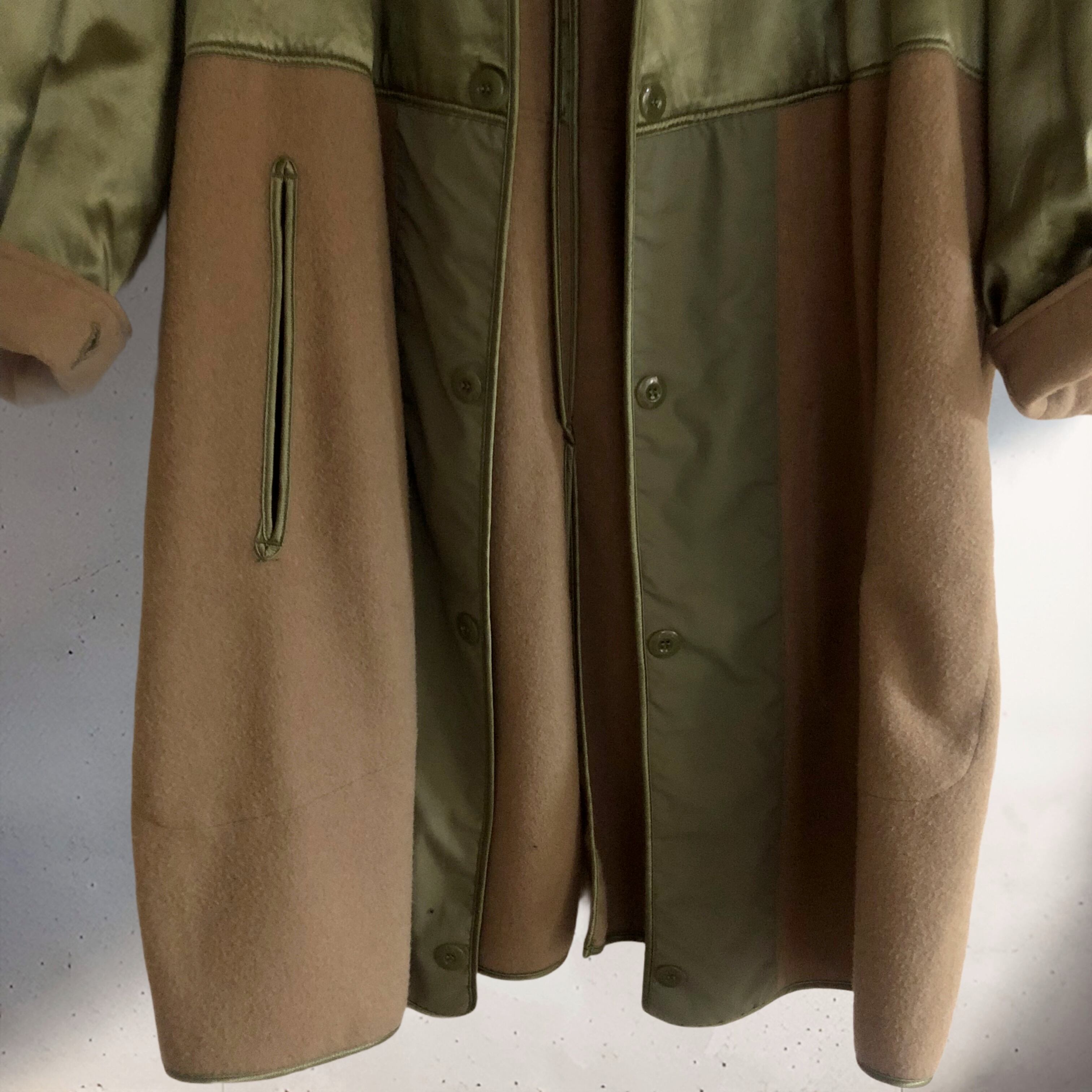1960年代、フランス軍のライナーコート。ウールとサテンのような艶のある生地が合わさり、ベージュとグリーンの配色も含め良いコントラストになっています♡リバーシブルで着られ、前は閉じないのでそのままバサっと羽織ったりブローチで止めても◎