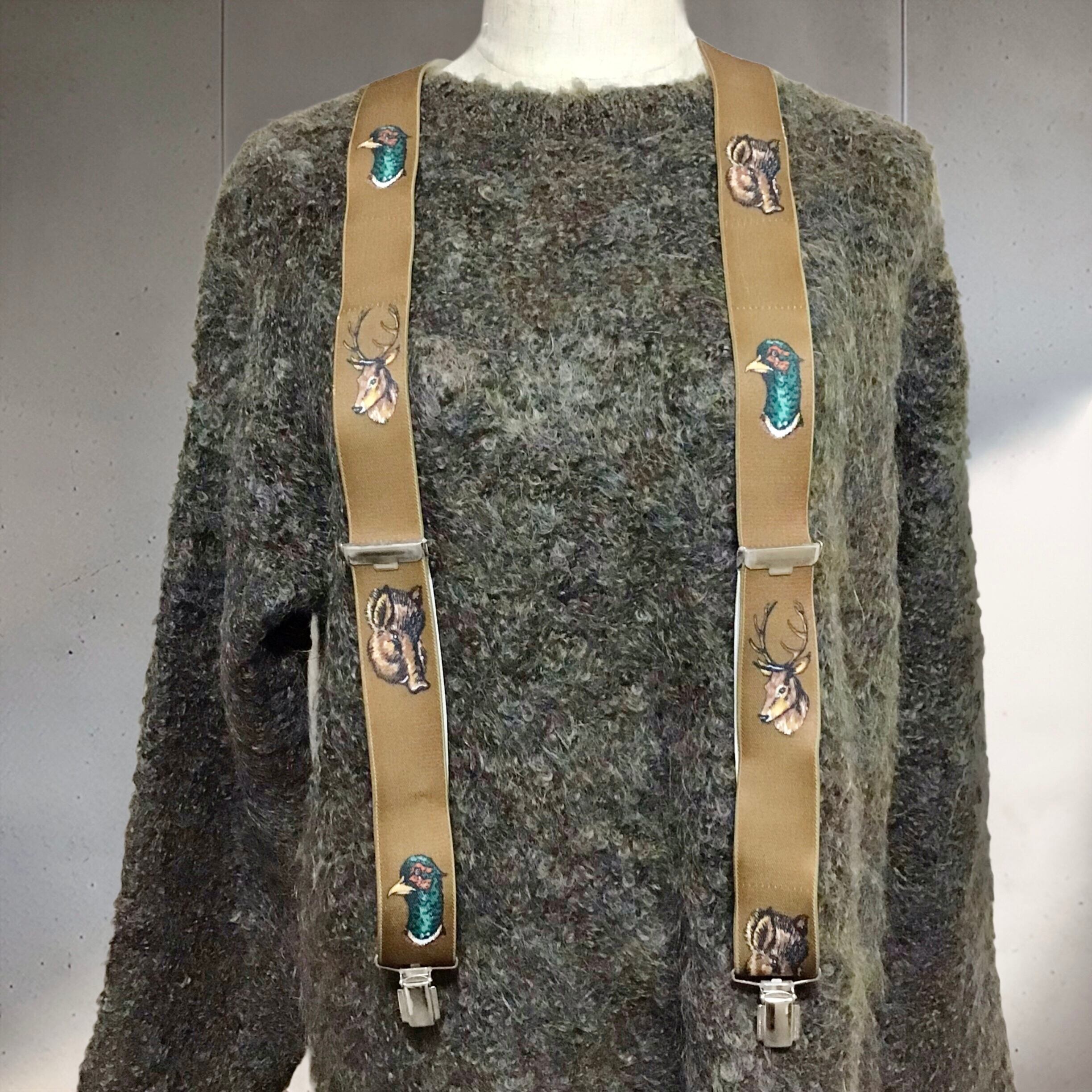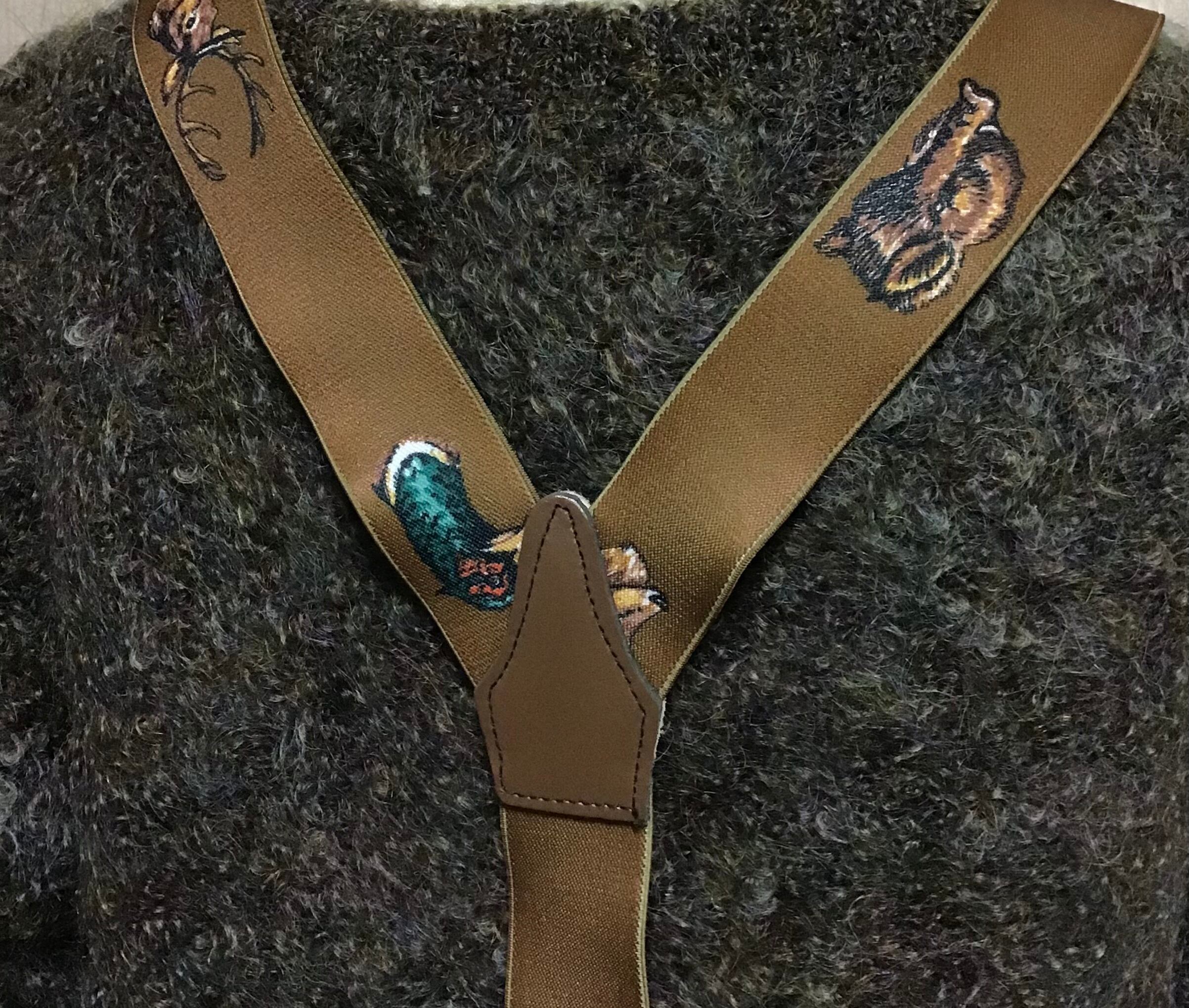 鹿やイノシシ、キジの柄のサスペンダー。幅広のゴム素材で使いやすく、シンプルなコーディネートのポイントにしたり、ハンティングジャケットなどとコーディネートしても良さそうです♡