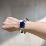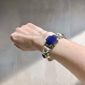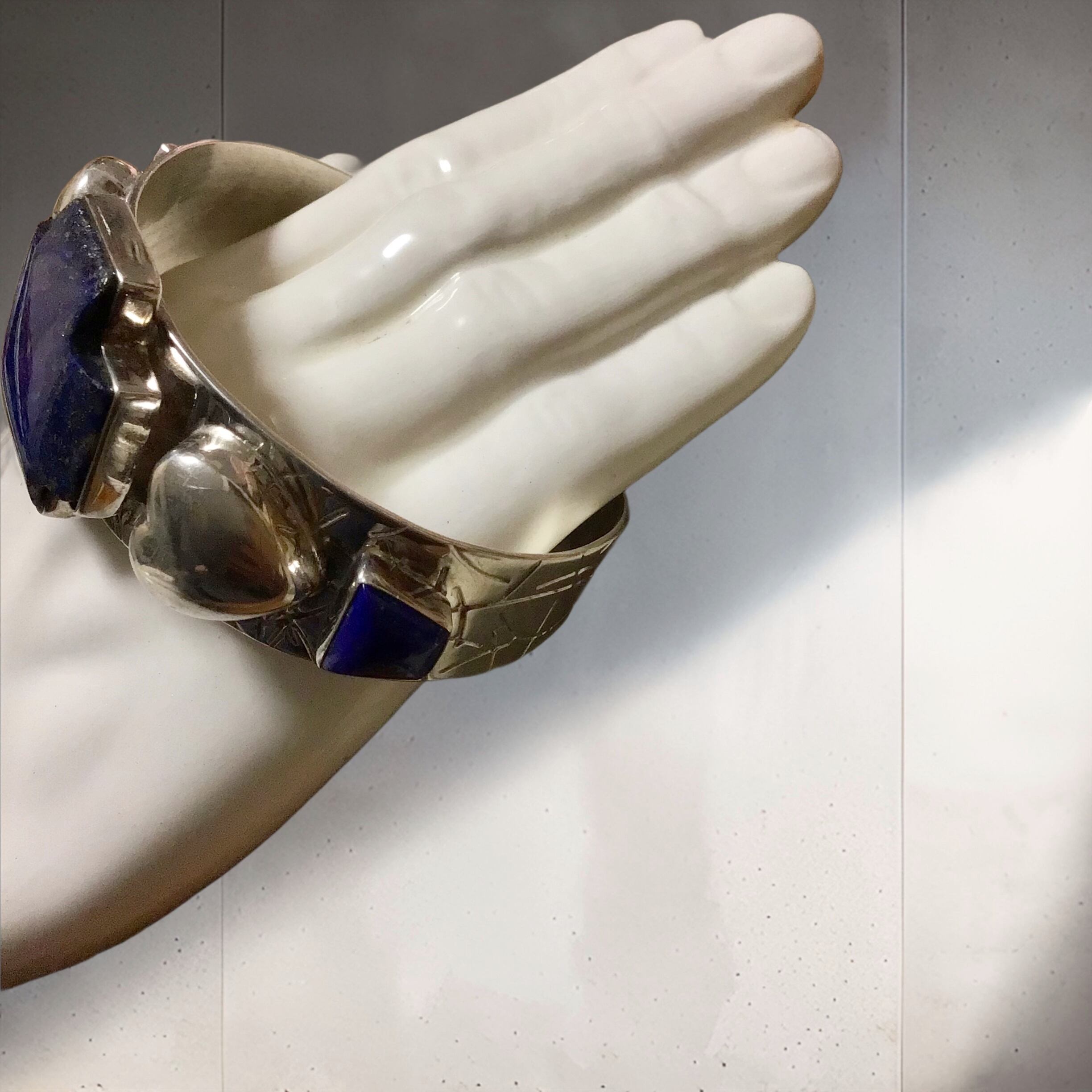 贅沢にラピスラズリを使ったシルバーバングル。真ん中のクロス型とサイドのラピスラズリ、ぷっくりしたハートでとても立体感があり、シルバー部分に柄も入ってカッコいいです♡石は惑星の様でとてもいい雰囲気です◎