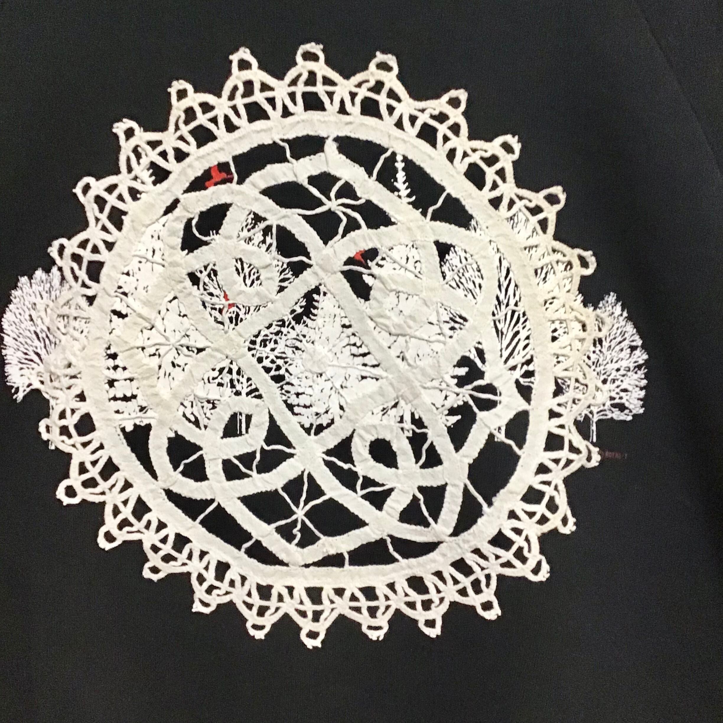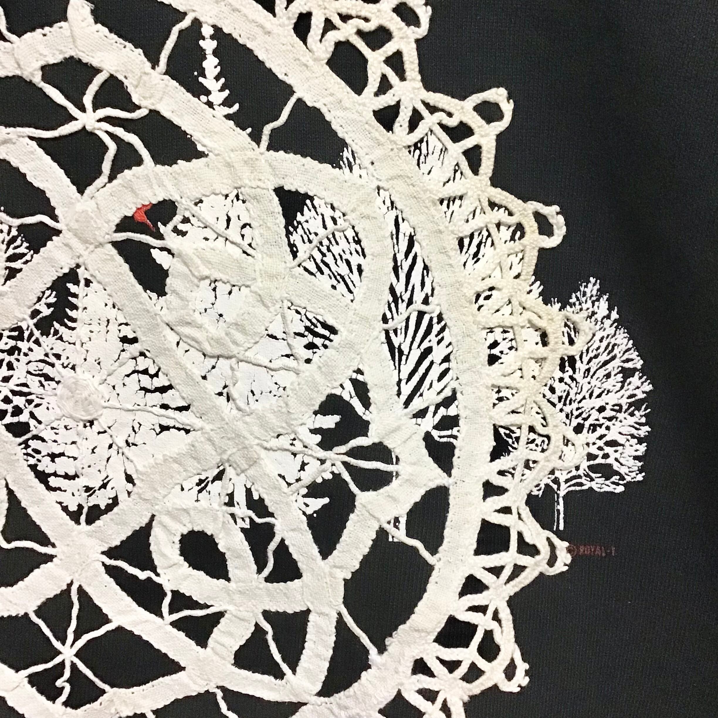 リメイクスウェット。90年代頃のプリントスウェットにアンティークレースをあしらいました。木々に鳥が飛ぶプリントが少し見えて可愛いです♡大判のレースやギザギザした縁も素敵です◎