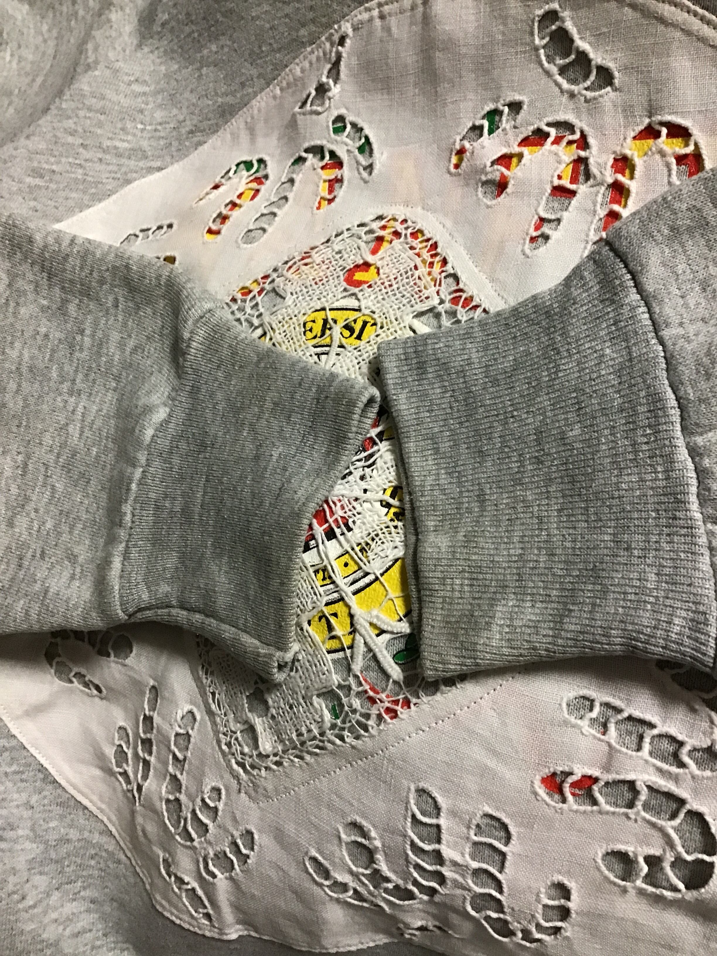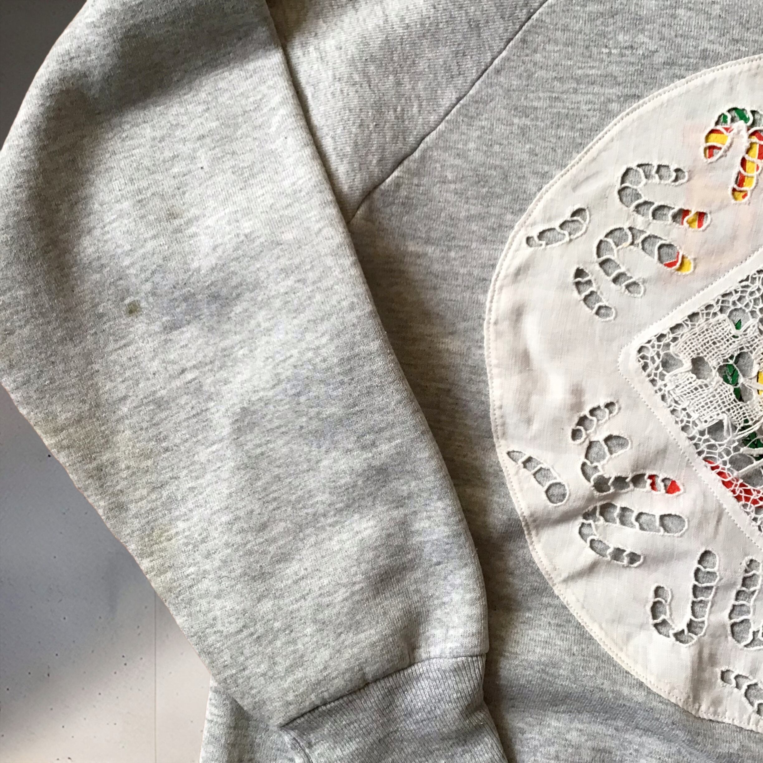 リメイクスウェット。80年代頃のプリントスウェットにアンティークレースをあしらいました。ウネウネとしたカットワークレースからチラリと覗くプリントが良い感じです♡