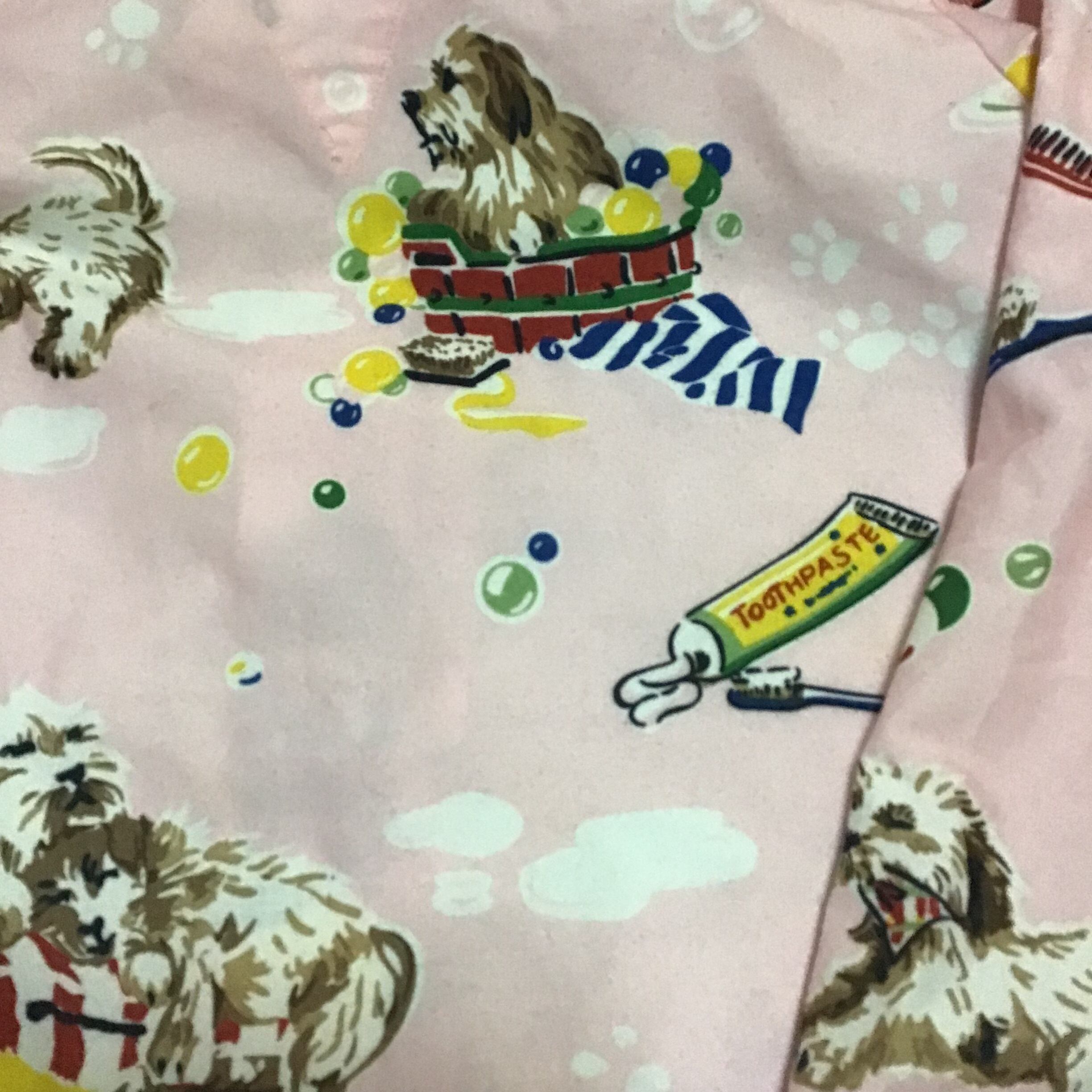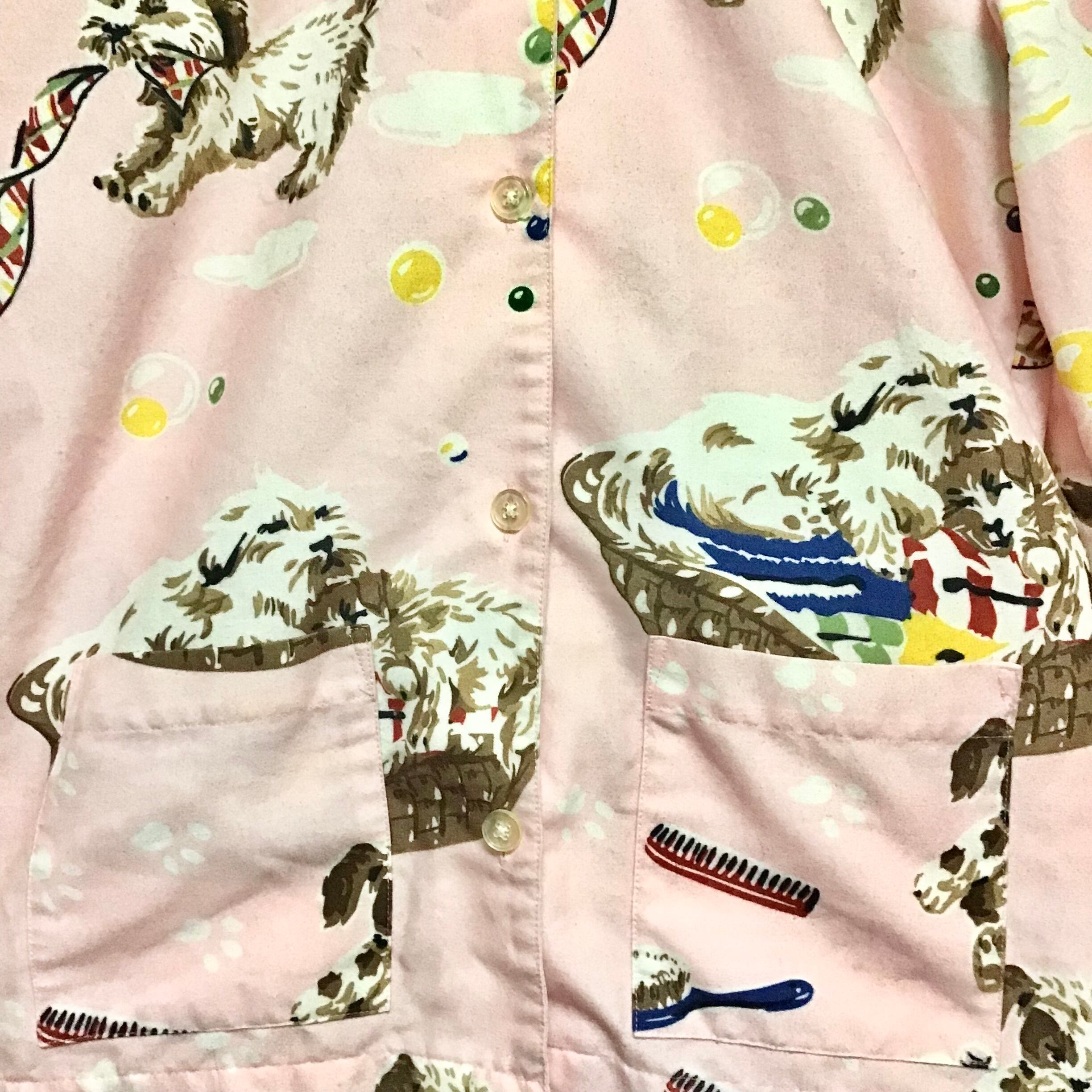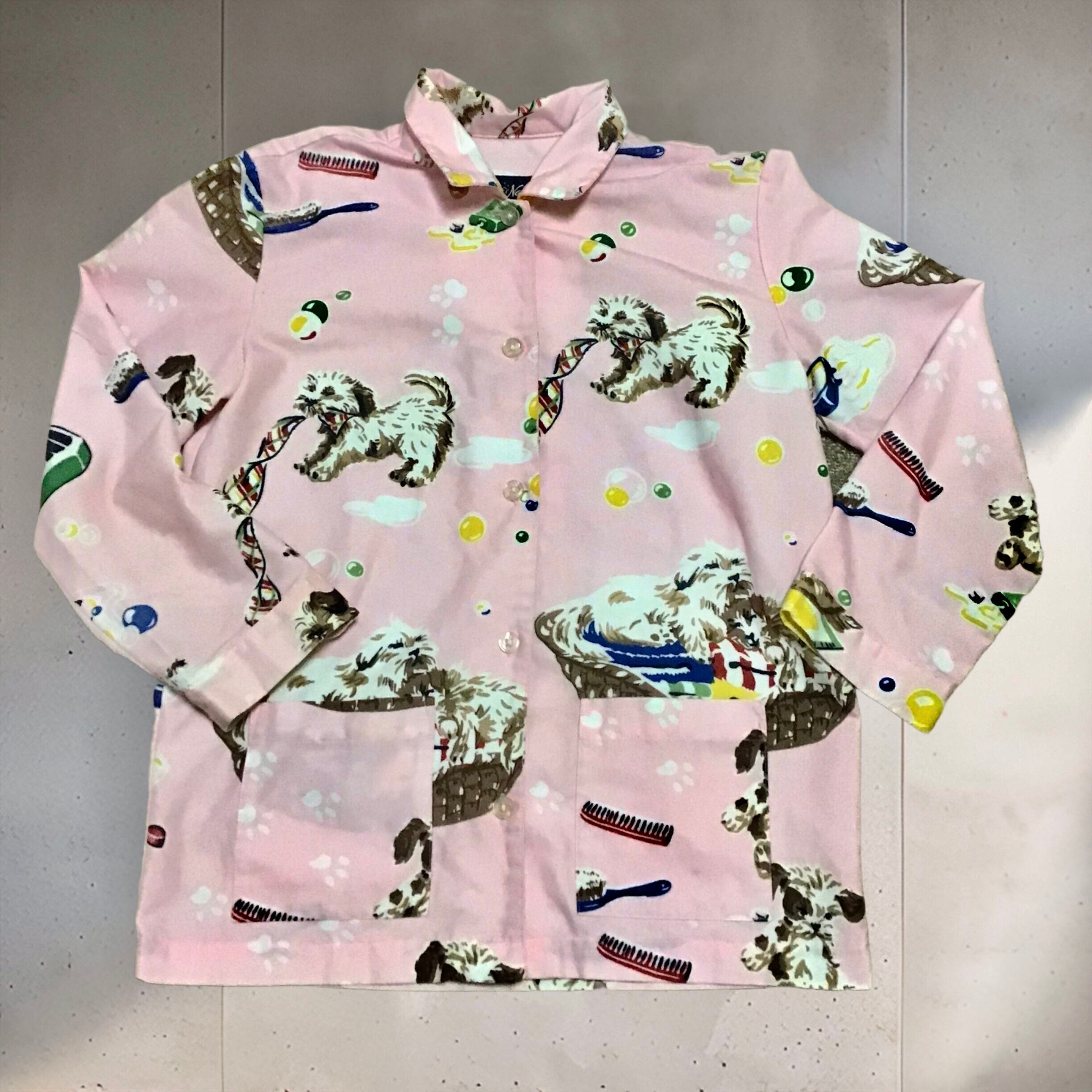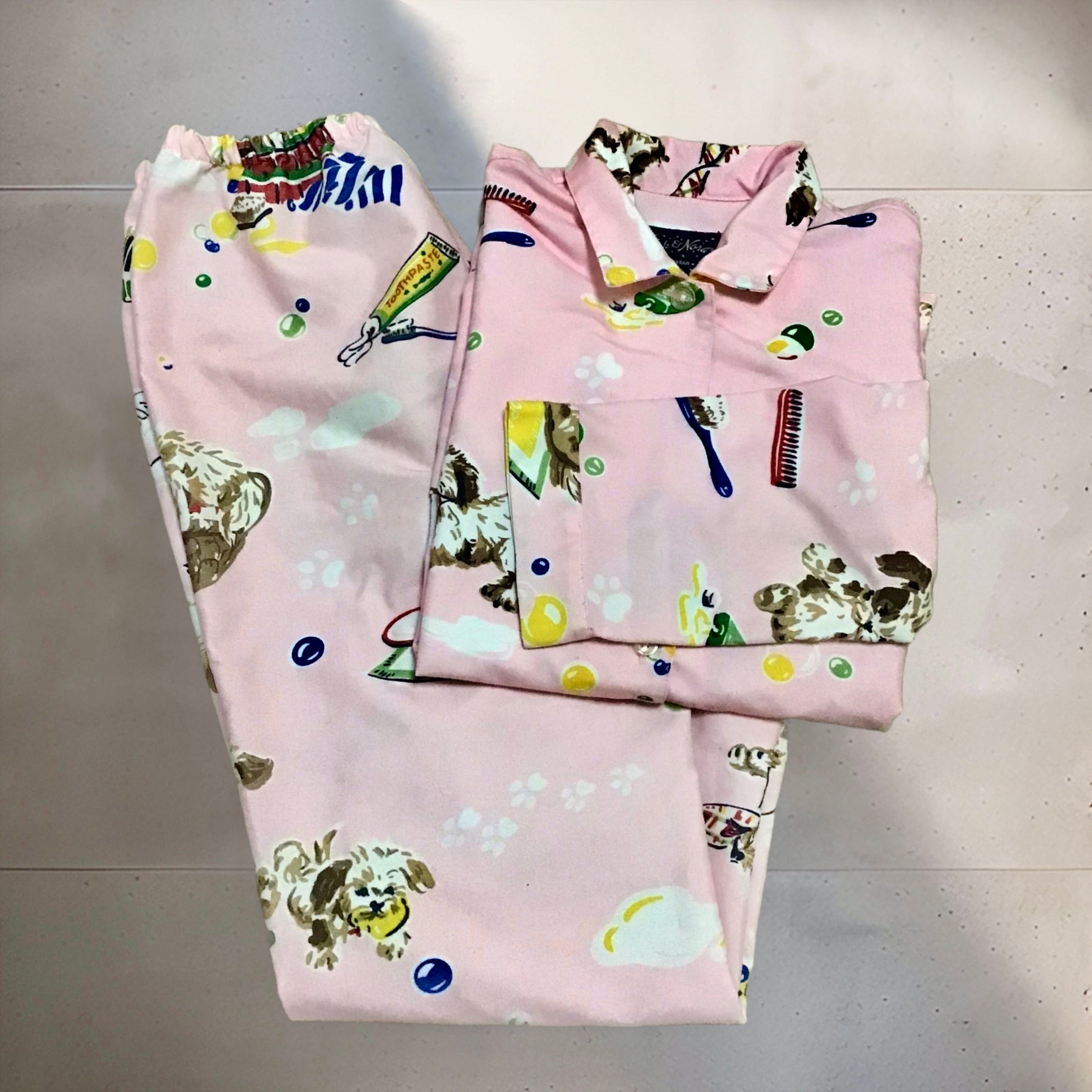 薄ピンクに仔犬の可愛すぎるプリントで本気のパジャマにするも良しですが、トップスはタンクトップやベアトップにサラッと羽織って頂くのが店主おすすめスタイル♡コンパクトなサイズ感で、意外とオトナなコーディネートに使えそうです◎