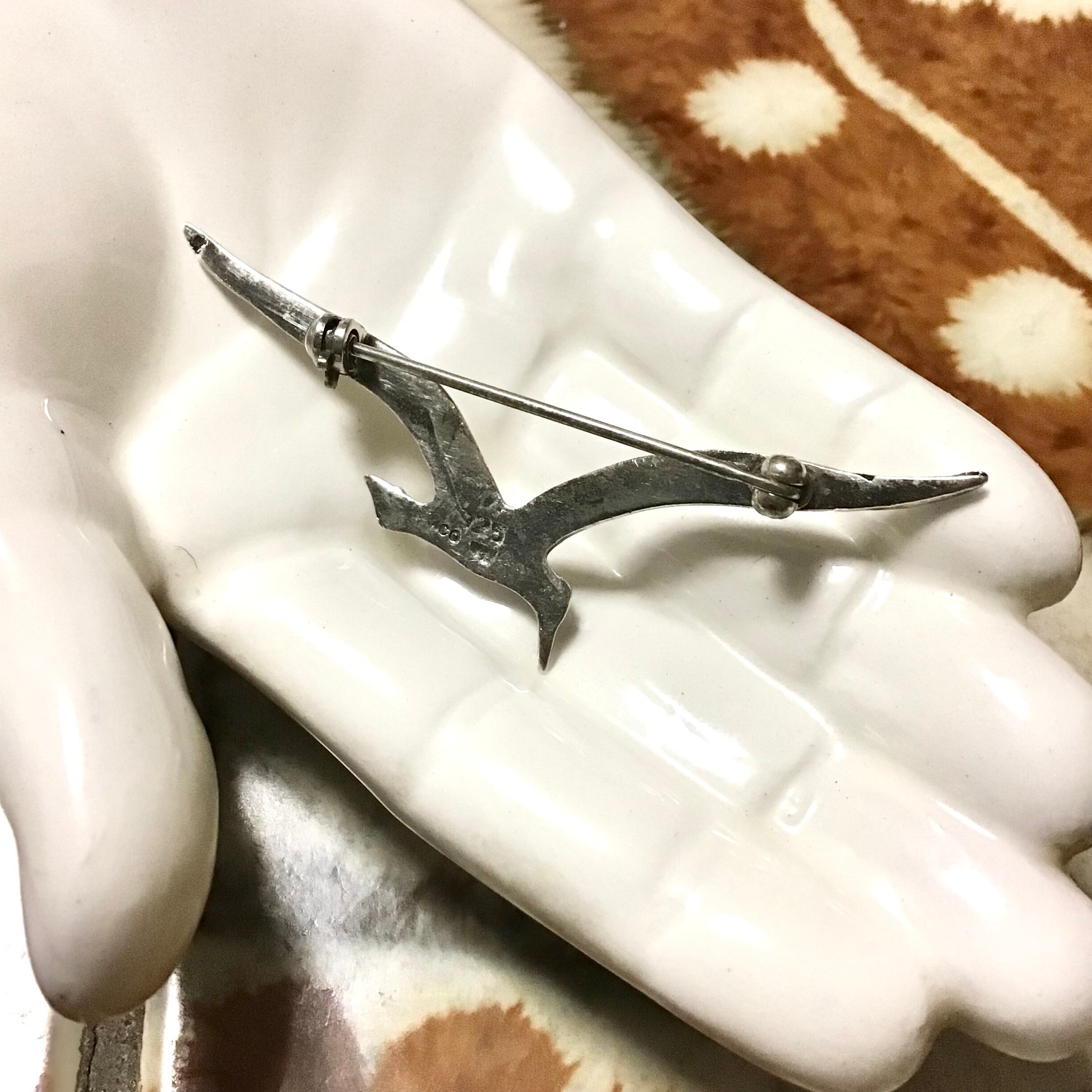 1980年代のシルバーブローチ。曲線がキレイな羽ばたくカモメのデザインです♡すっきりとしたデザインで、ハットに着けたり、シンプルなニットにも合いそうです◎