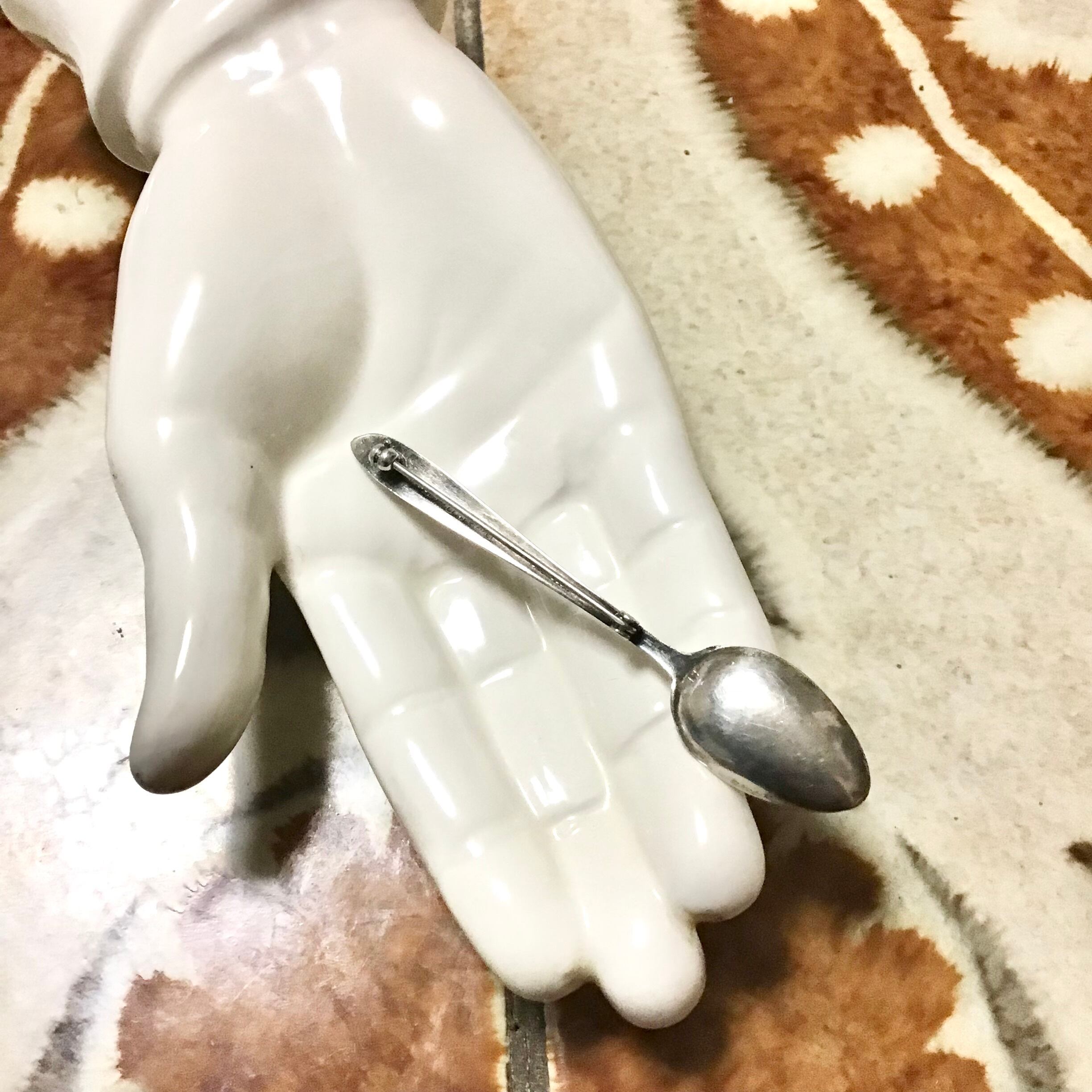 1930年代のシルバーブローチ。小さなシュガースプーンがそのままブローチになったような可愛らしいデザイン♡柄に入ったお花の細工も可憐です◎カーディガンなどのボタン代わりに使ったりシンプルにジャケットの襟元を飾るもよし、いくつか重ねて着けても素敵です◎